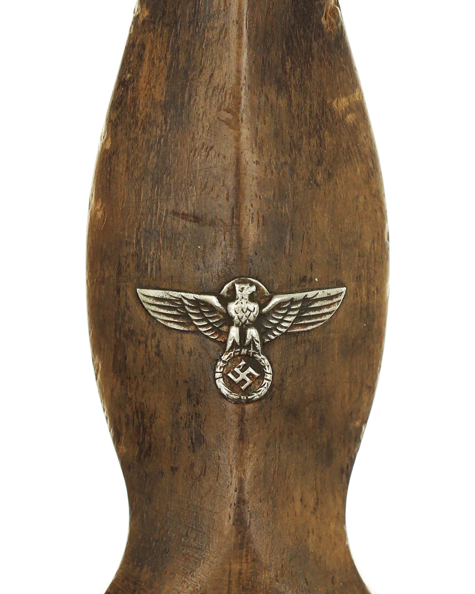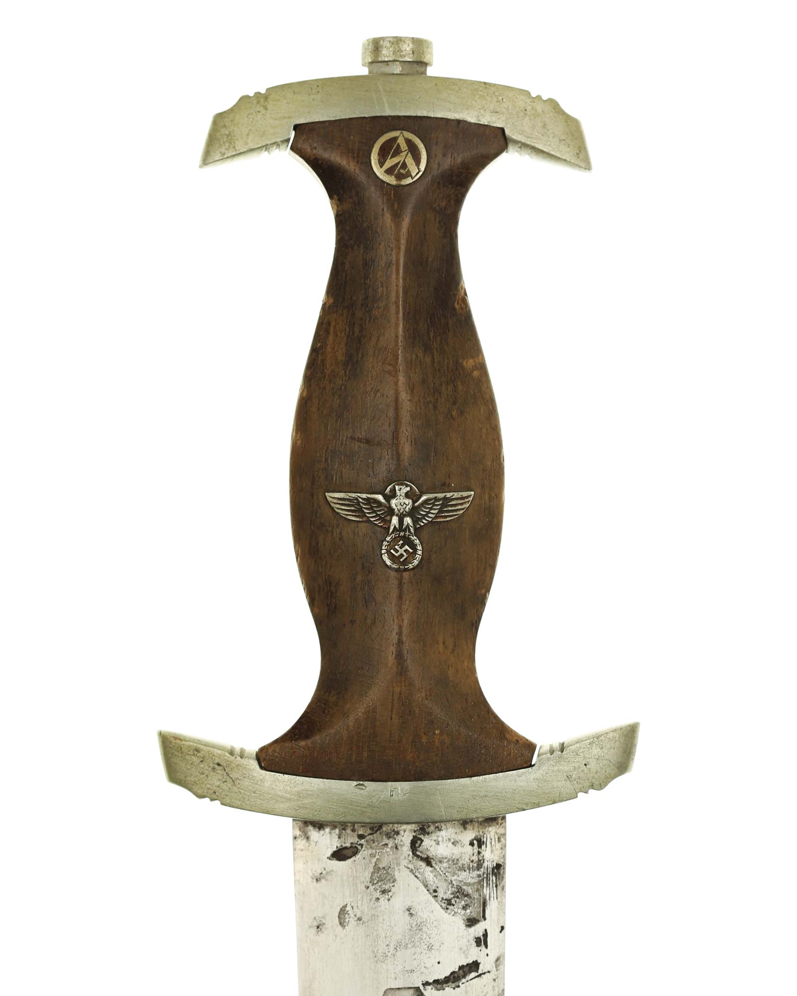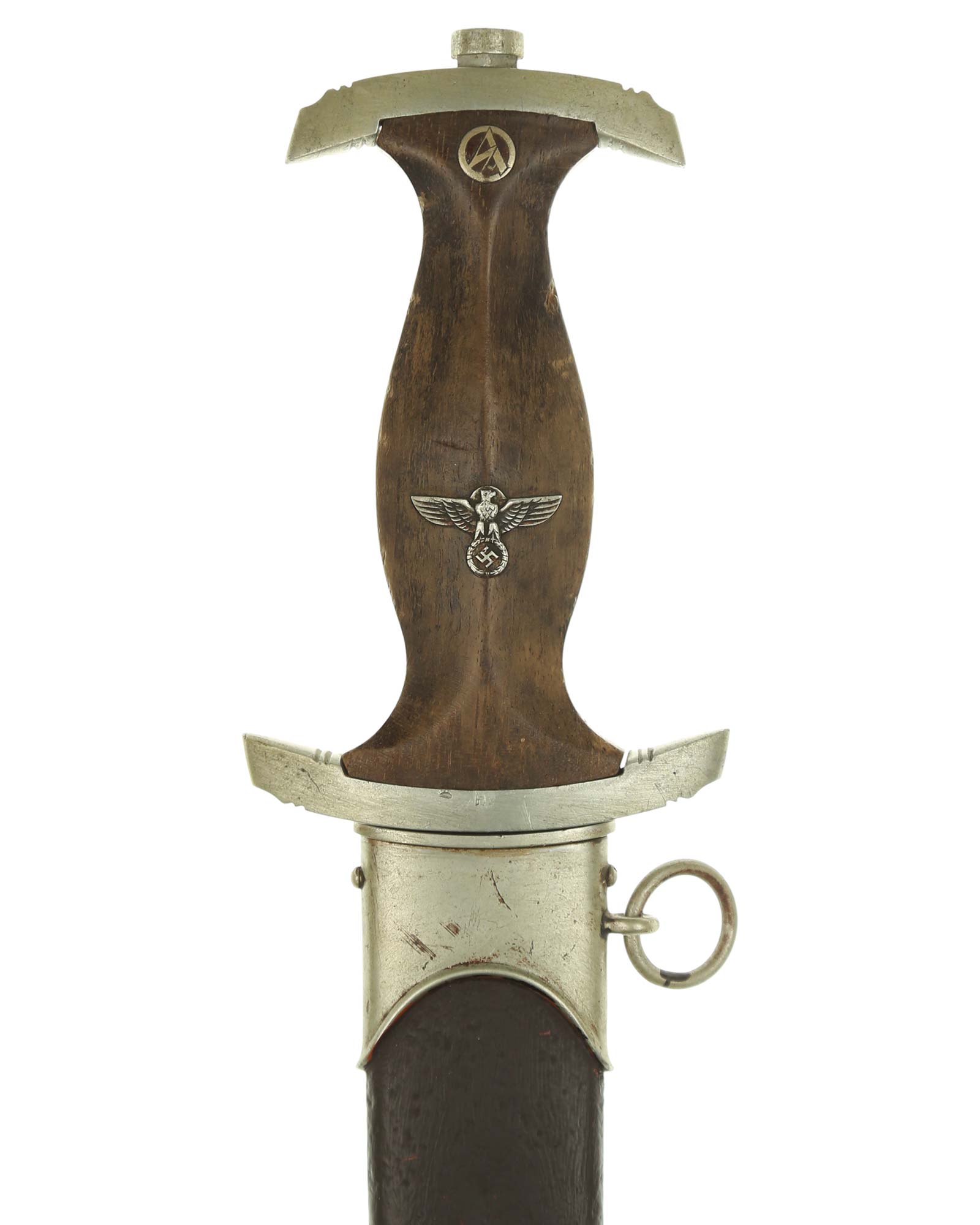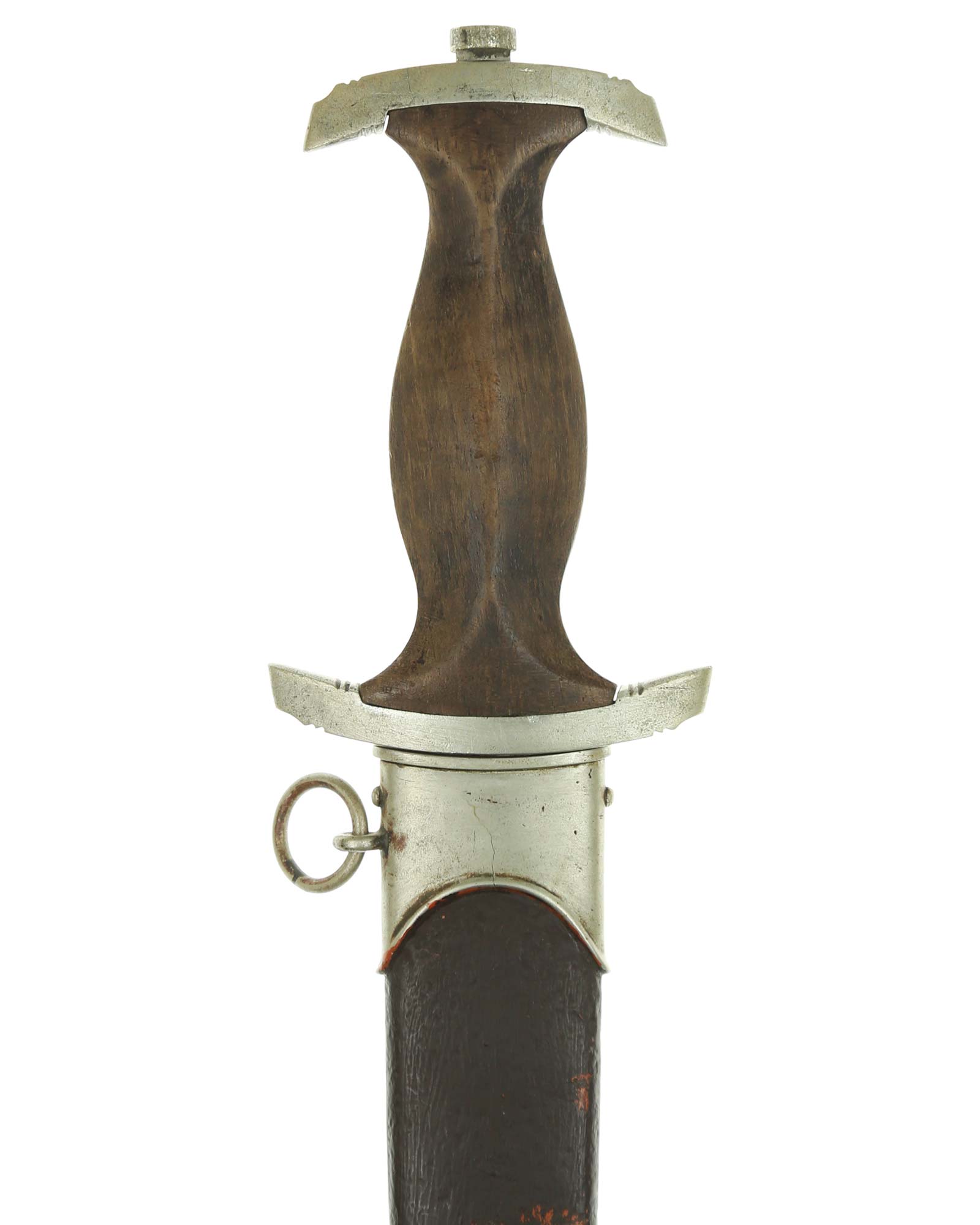 Griff: Brauner Holzgriff, der Hoheitsadler im Griff ist in Nickelausführung, darüber befindet sich das emaillierte SA-Emblem. Der Holzgriff ist mit typischer Suhler Stufe. Beide Parierstangen sind aus Nickel. Die untere Parierstange ist mit dem Gruppenstempel He [Hessen] handgestanzt.