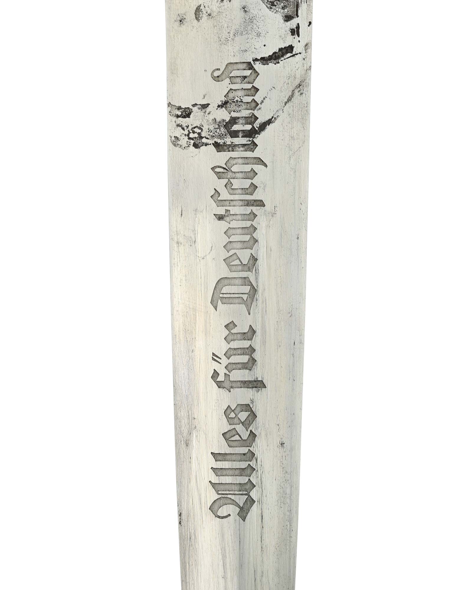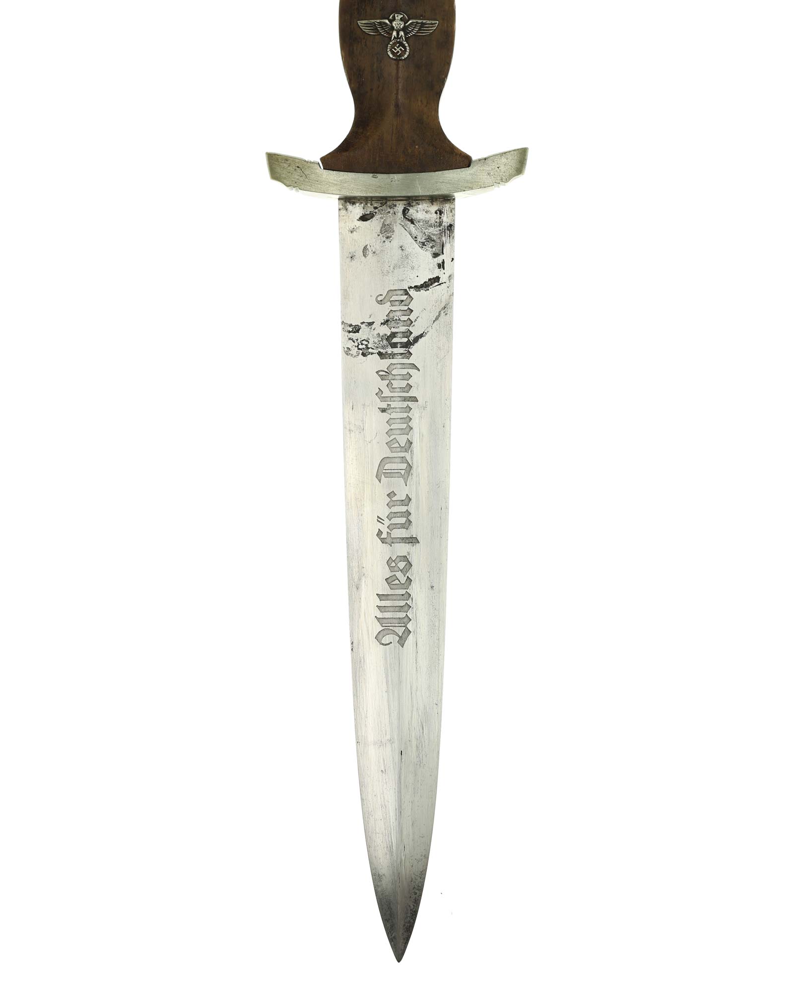Klinge: Auf der Vorderseite der Klinge befindet sich die SA Devise, diese ist sehr dunkel und zackig, mit der Inschrift: Alles für Deutschland. Auf der Rückseite befindet sich das Herstellerlogo Willhelm Kober & Co., Suhl.
