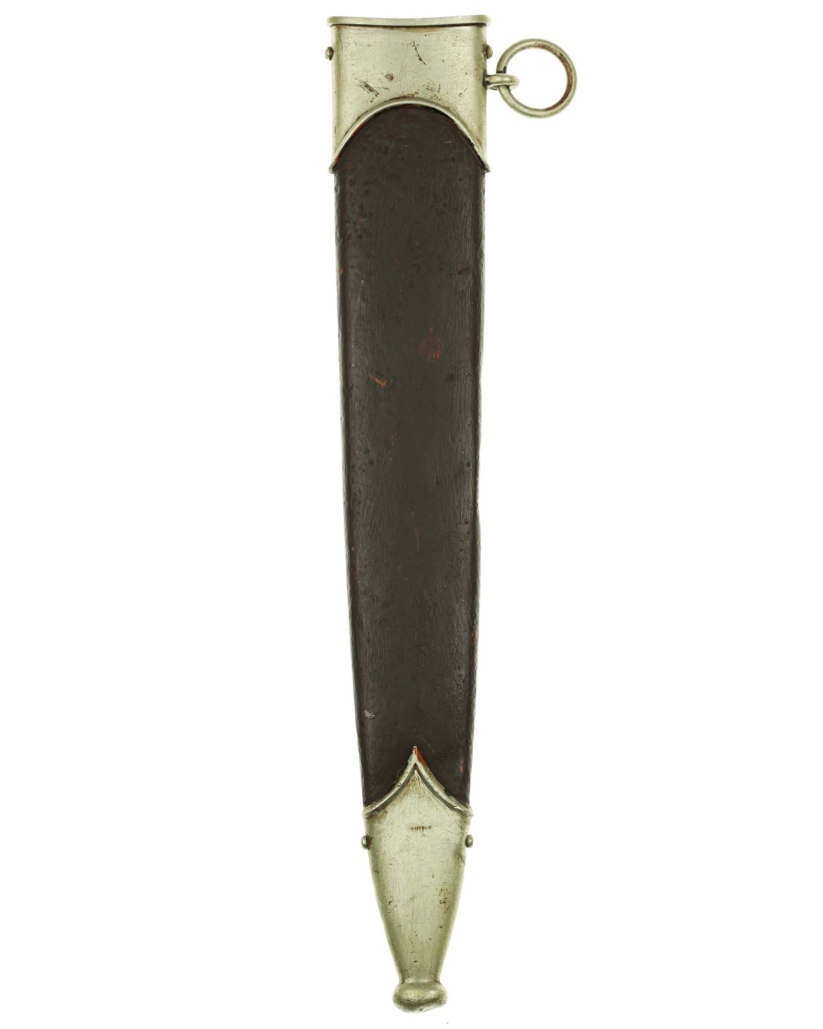 Scheide: Die Scheide ist aus Eisen und nachlackiert. Die beiden Scheidenbeschläge sind aus vernickeltem Stahlblech. Die Beschläge werden mit jeweils zwei Schräubchen seitlich gehalten. Am oberen Beschlag befindet sich der Ring für das Tragegehänge.