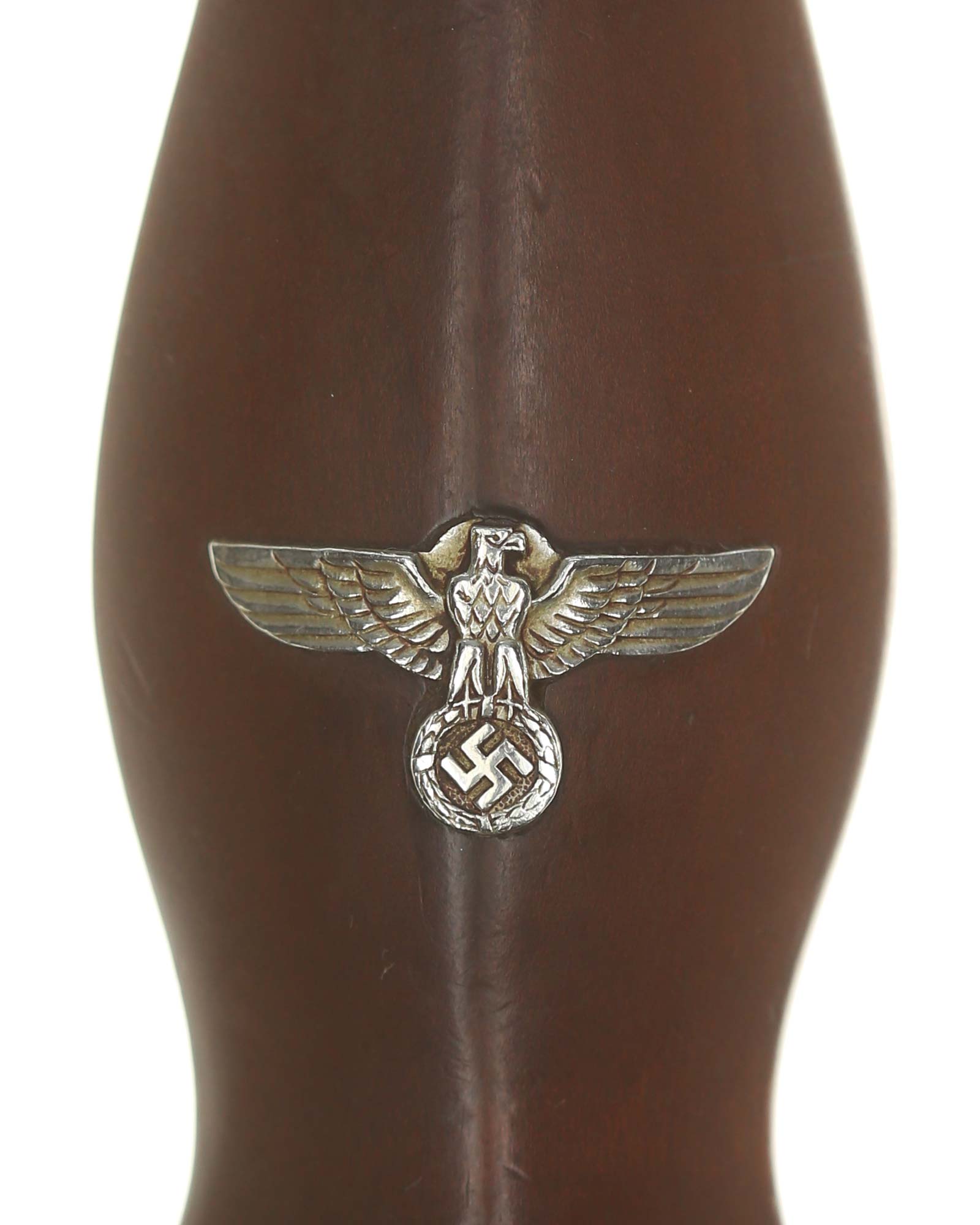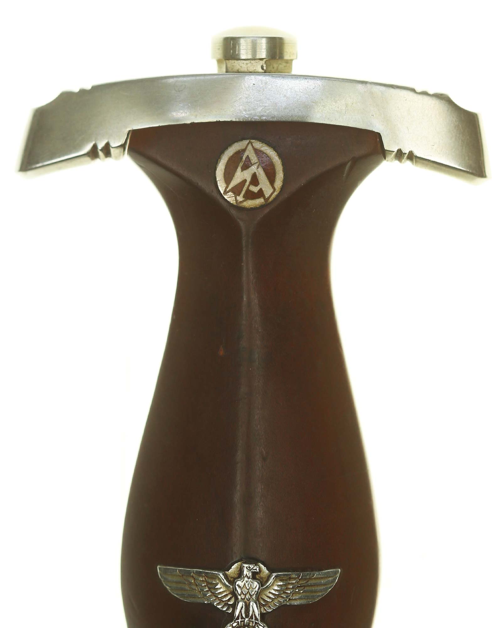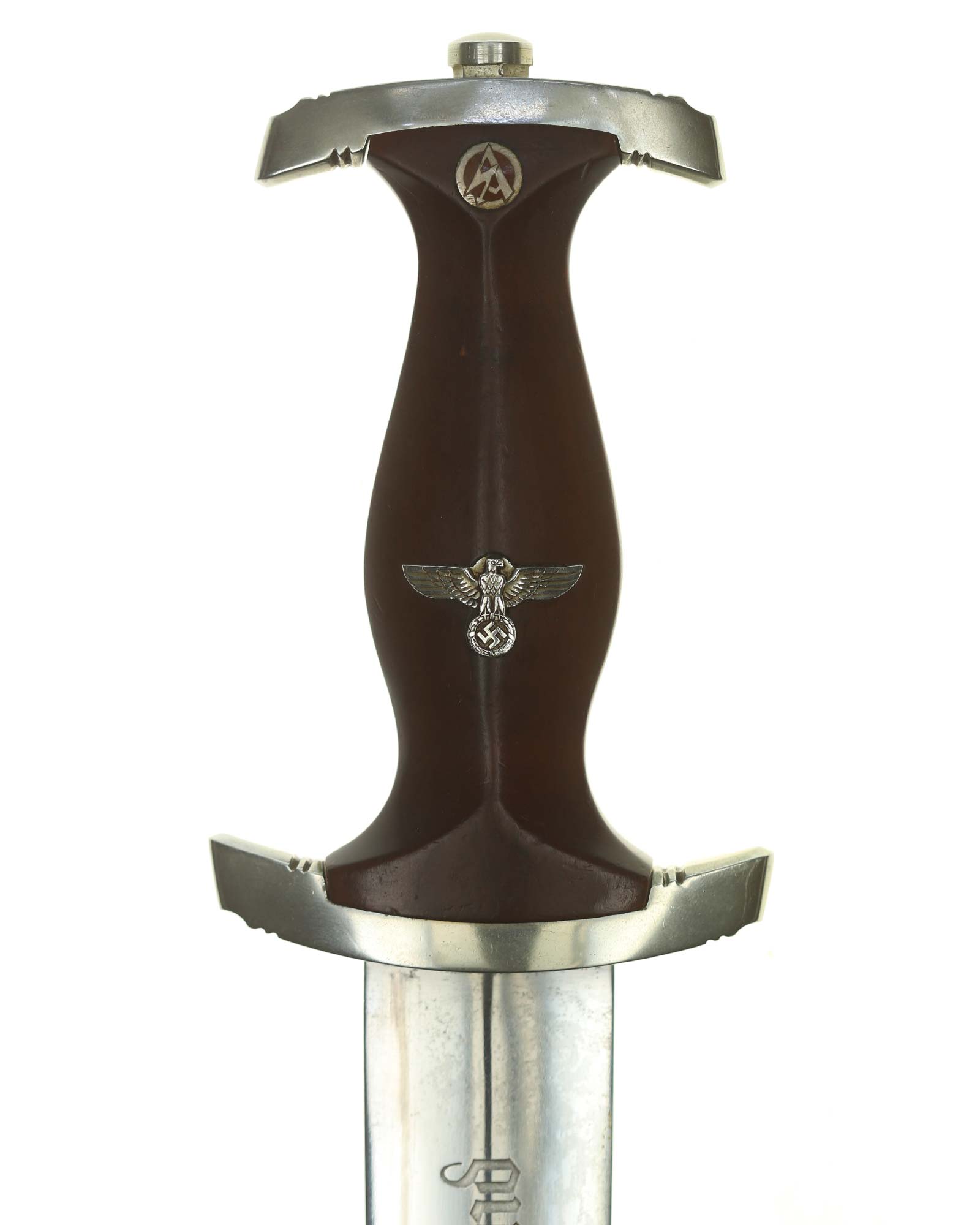 Griff: Brauner Holzgriff mit Hoheitsadler im Griff, darüber befindet sich das emaillierte SA-Emblem, diese sind innen geklammert. Beide Parierstangen sind aus Nickel. Unter Parierstange mit passendem Gaustempel «Nm» Nordmark.