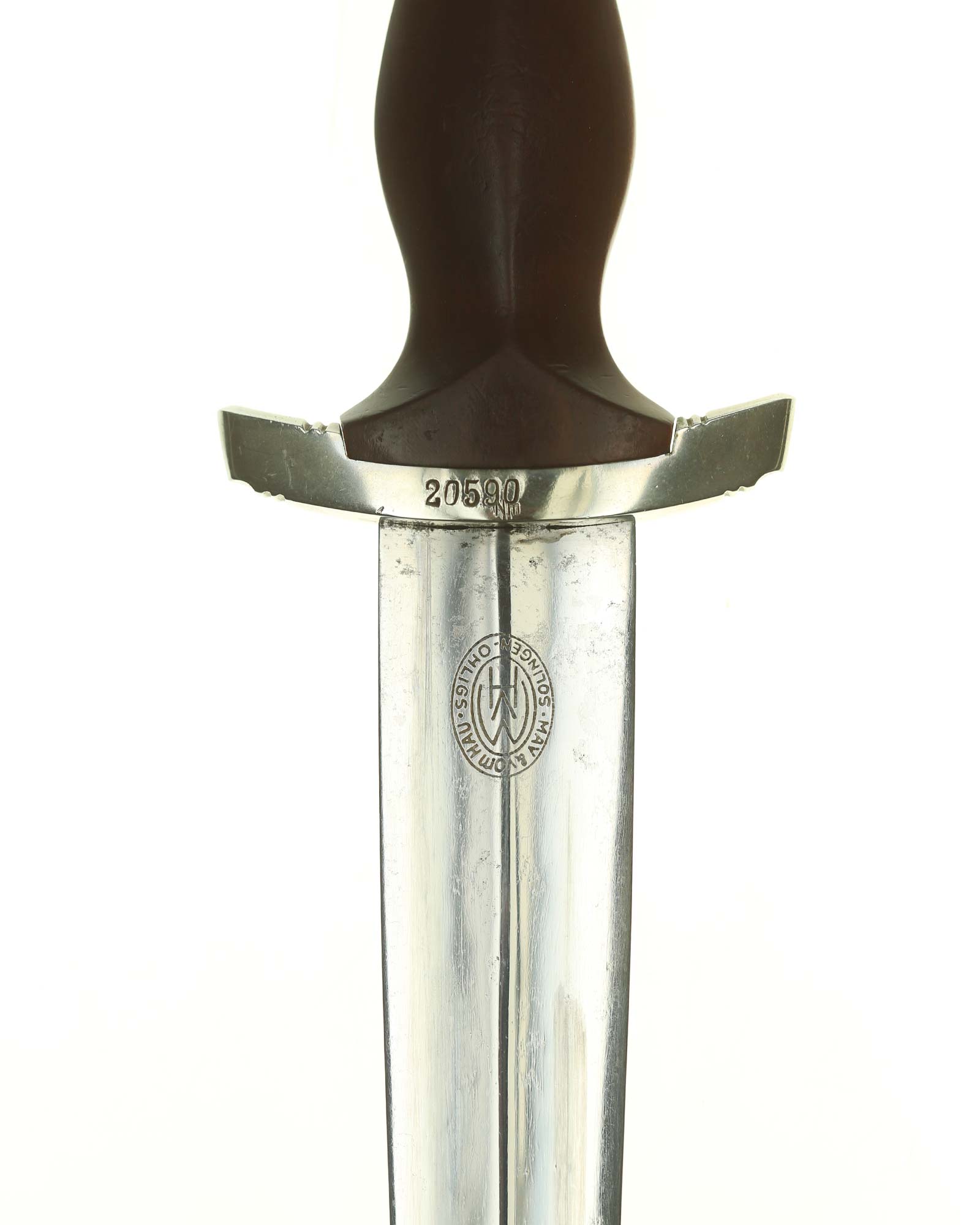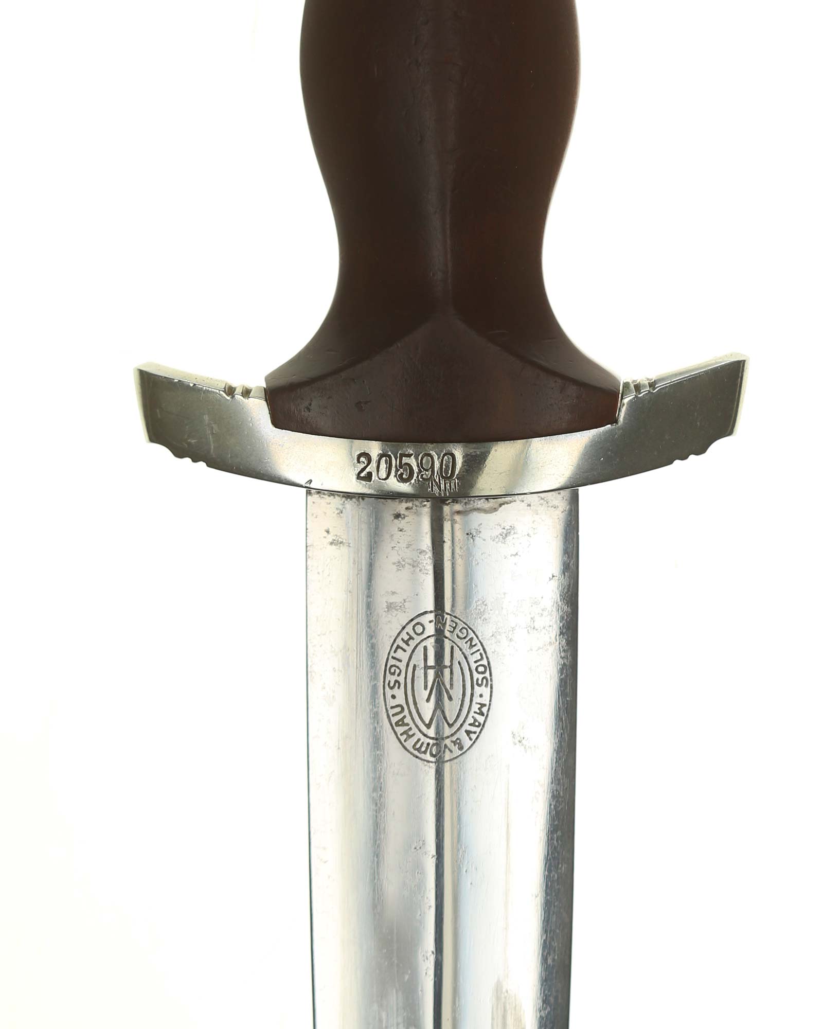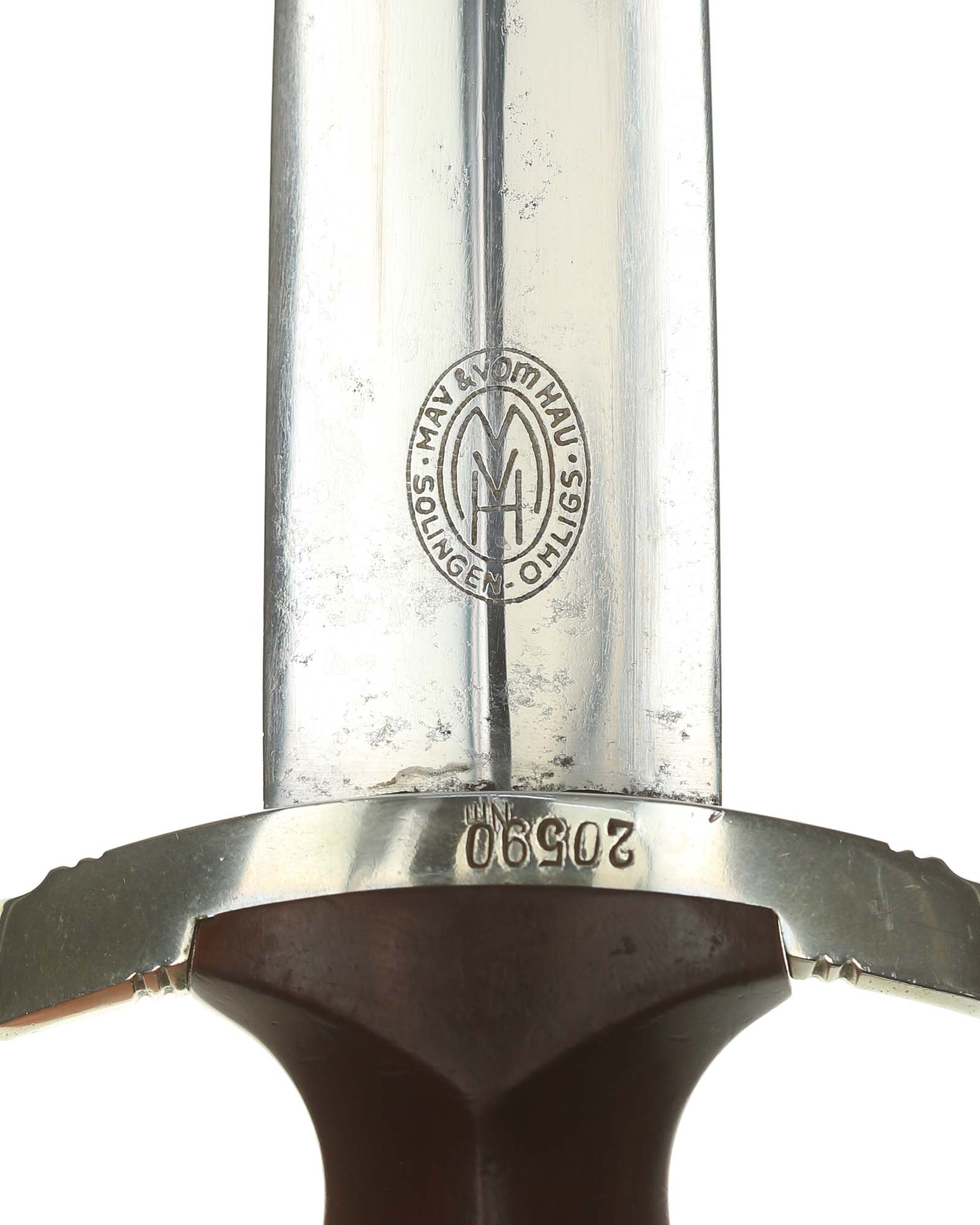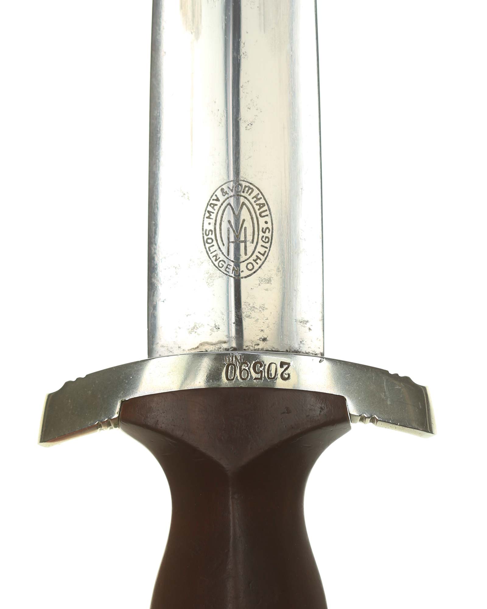 Klinge: Auf der Vorderseite der Klinge befindet sich die SA Devise, mit der Inschrift: Alles für Deutschland. Auf der Rückseite befindet sich das Herstellerlogo May & vom Hau Solingen.