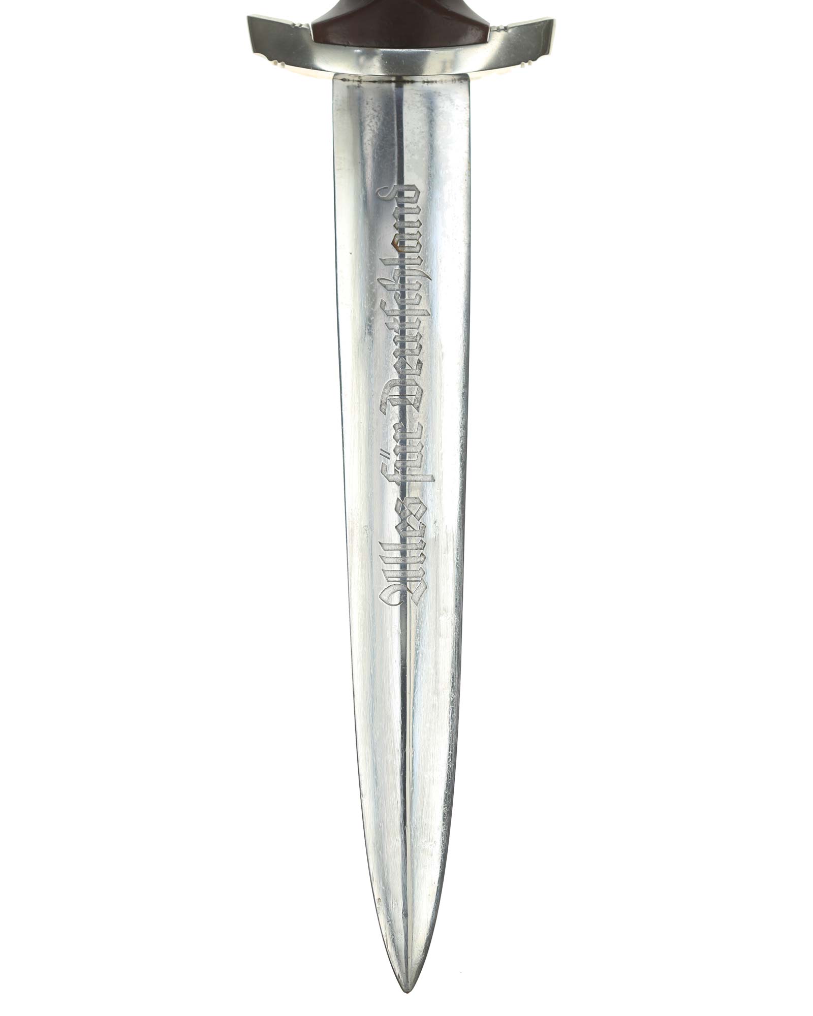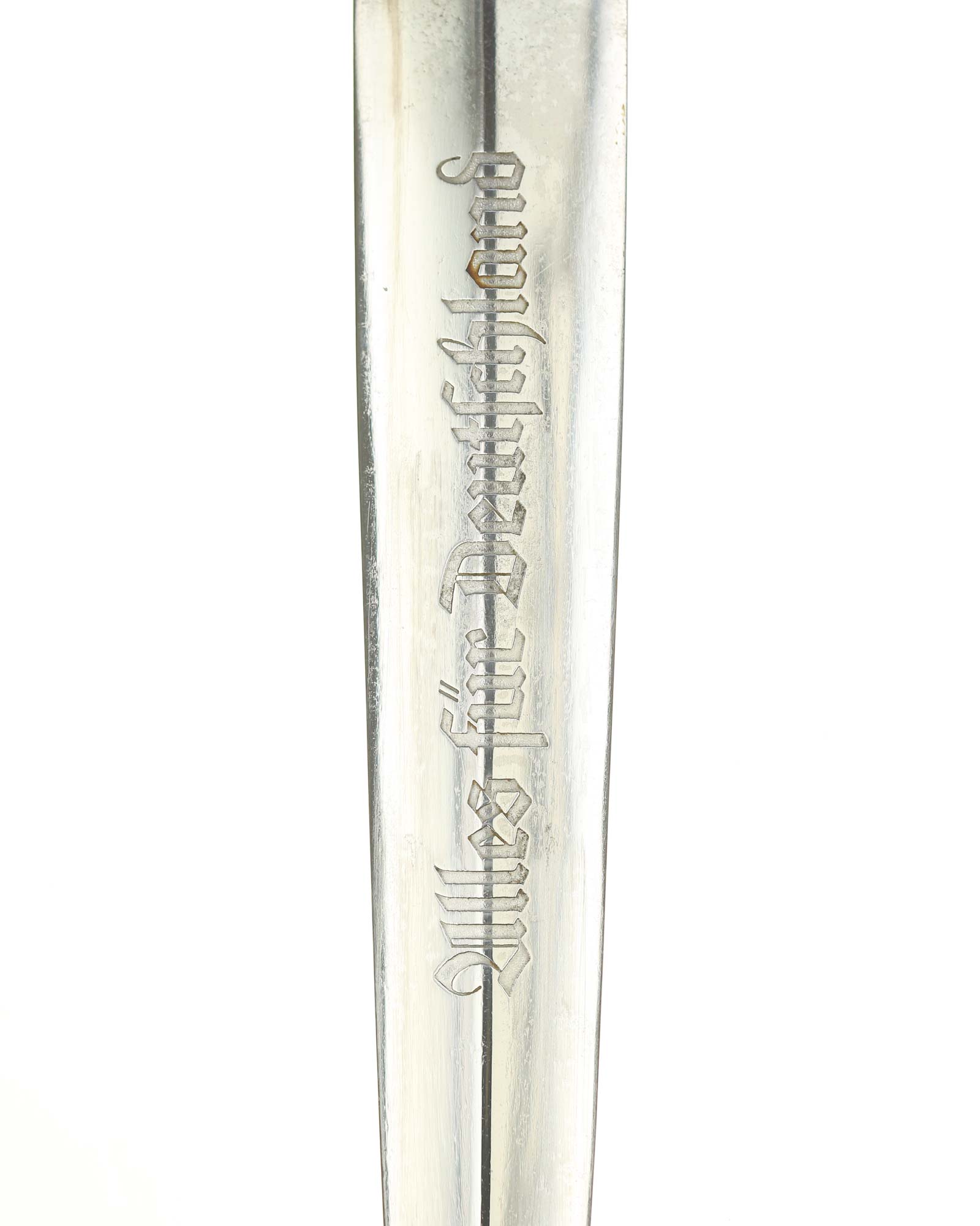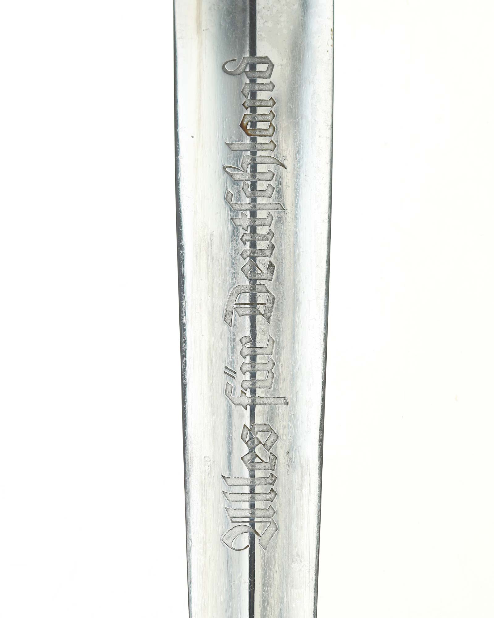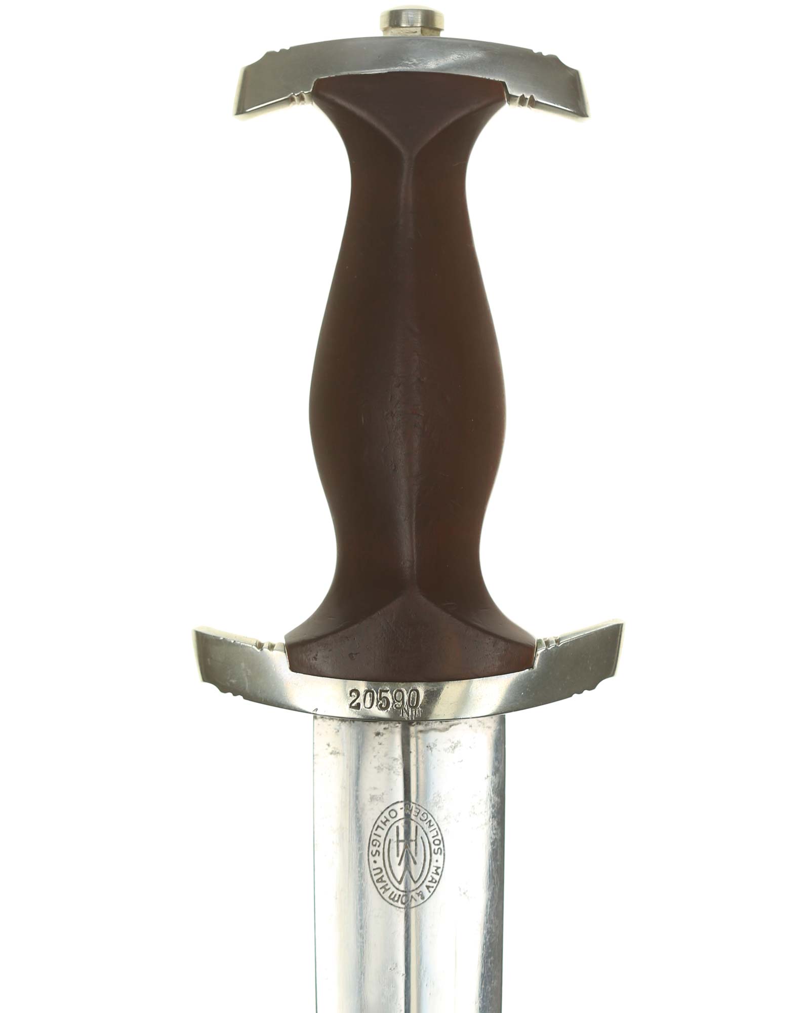 Klinge: Auf der Vorderseite der Klinge befindet sich die SA Devise, mit der Inschrift: Alles für Deutschland. Auf der Rückseite befindet sich das Herstellerlogo May & vom Hau Solingen.