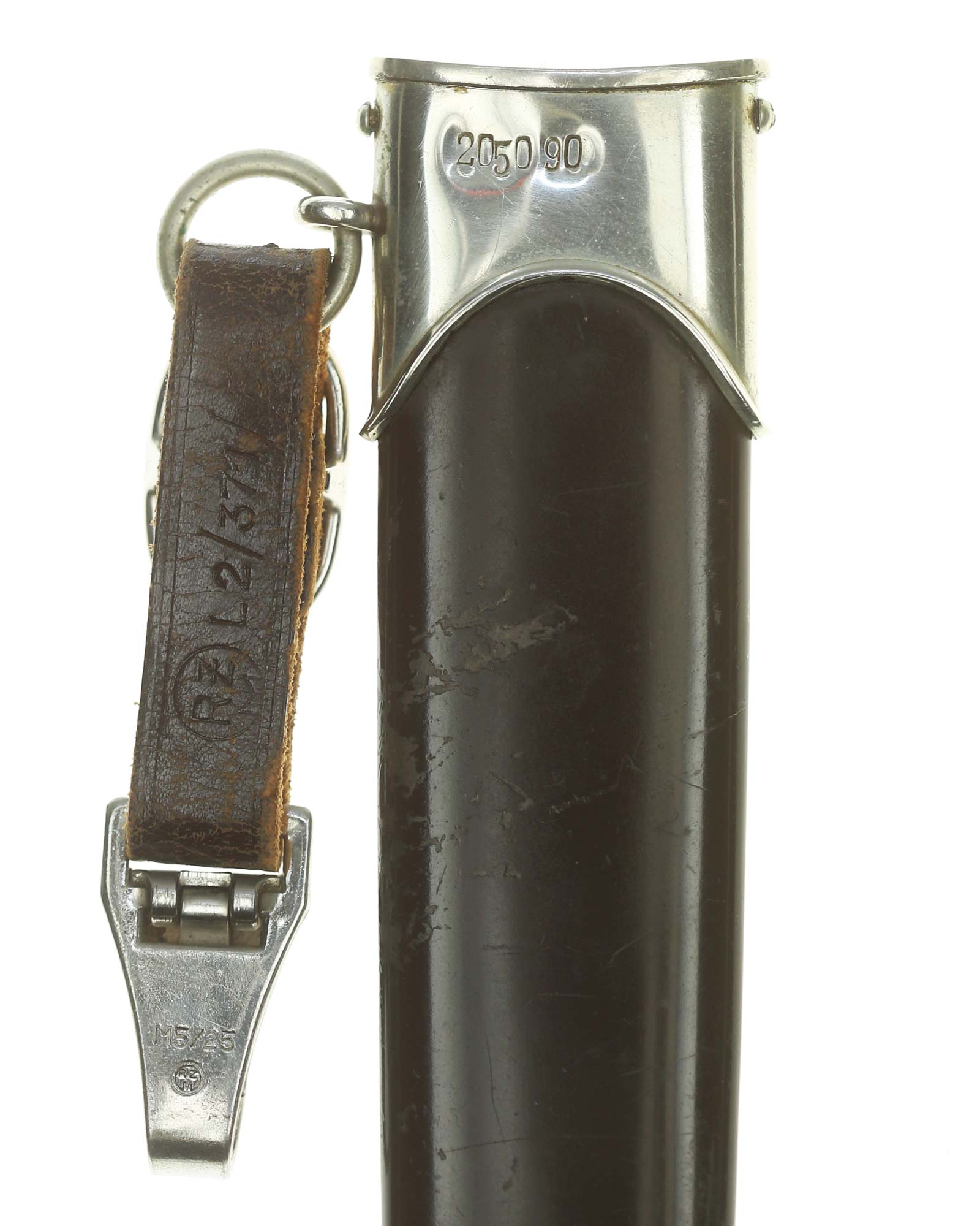 Scheide: Die Scheide ist aus Eisen. Die beiden Scheidenbeschläge sind aus vernickeltem Stahlblech. Die Beschläge werden mit jeweils zwei Schräubchen seitlich gehalten. Das Gehänge ist markiert RZM L2/371 39, RZM M5/25 (Christian Theodor Dicke, Lüdenscheid).