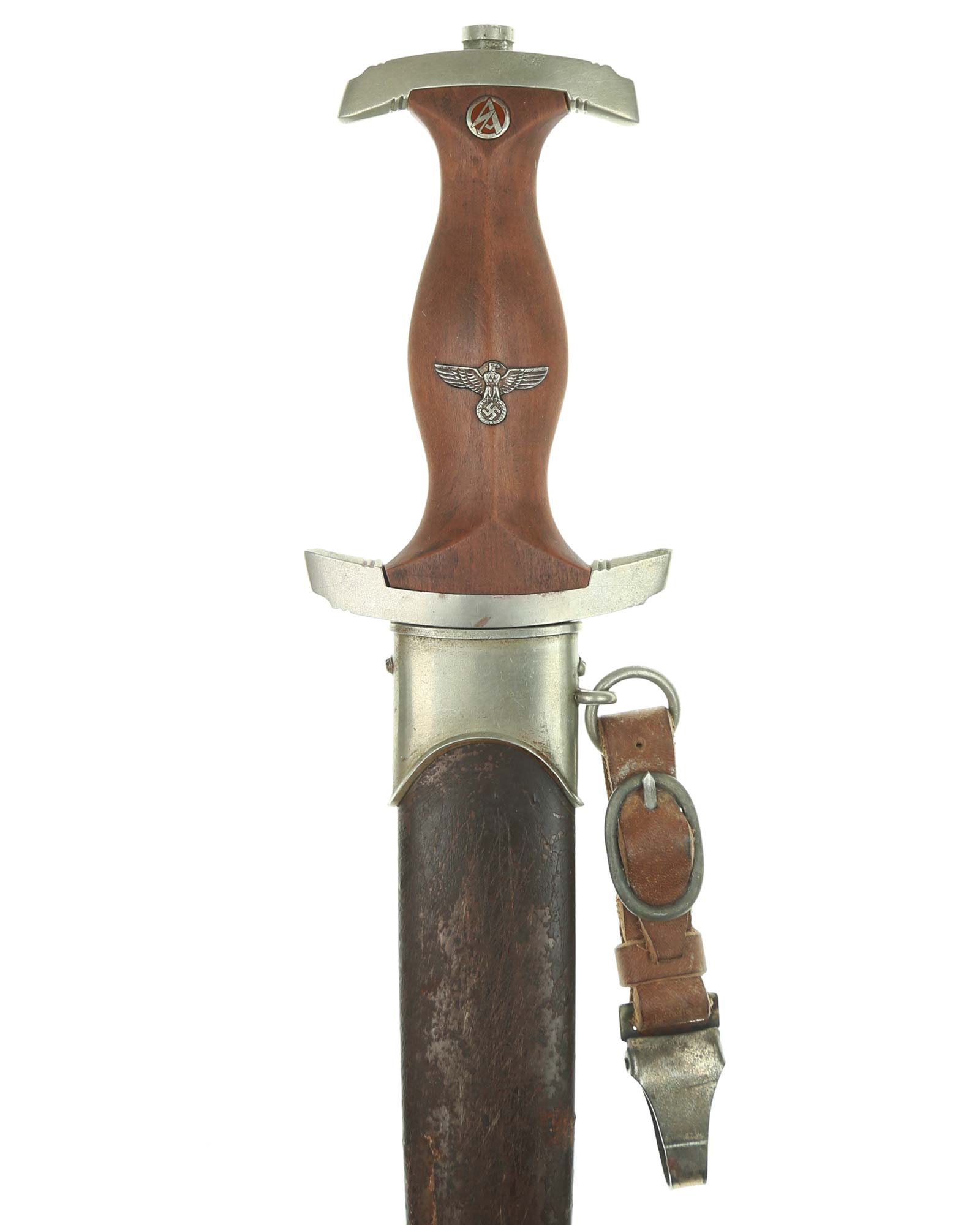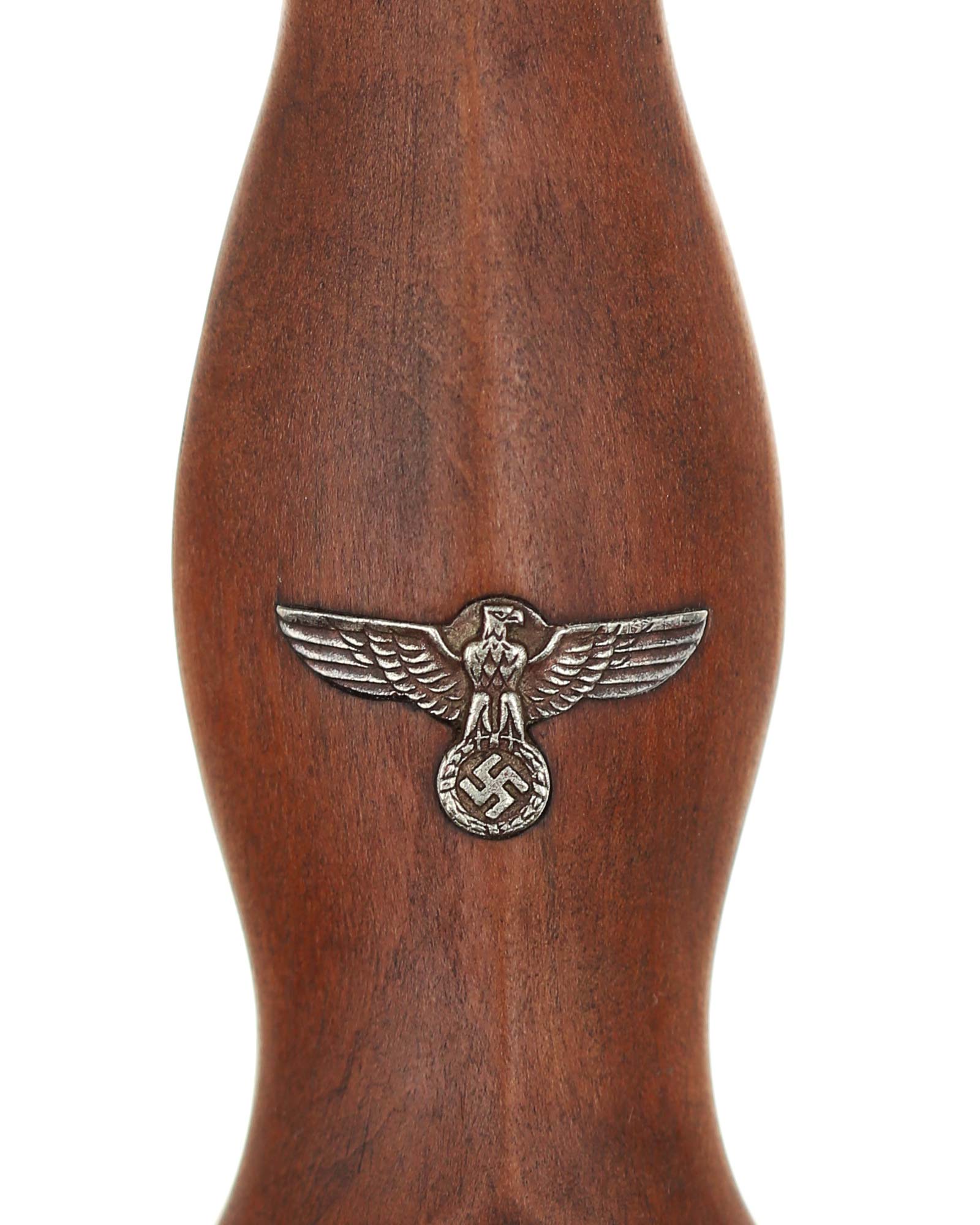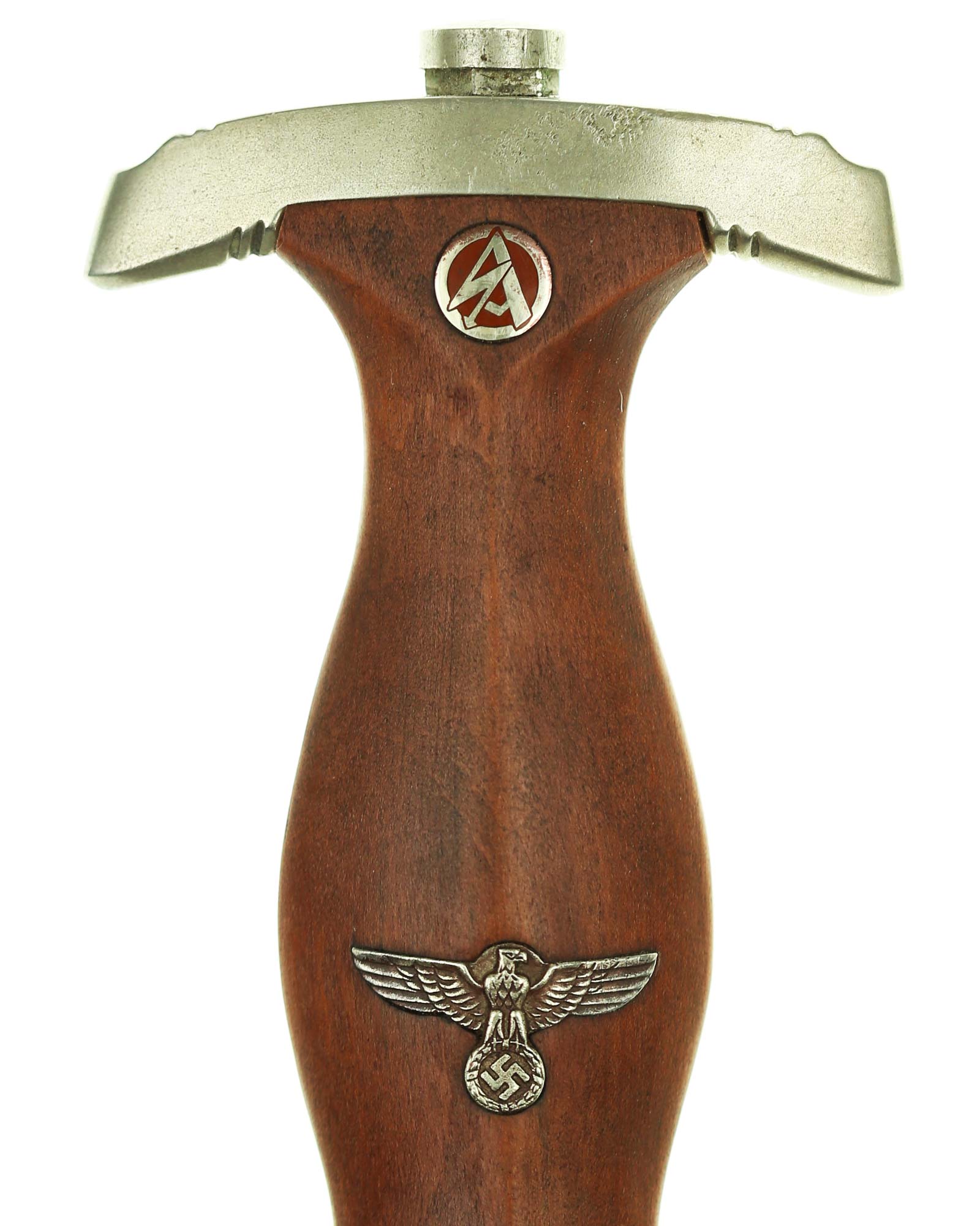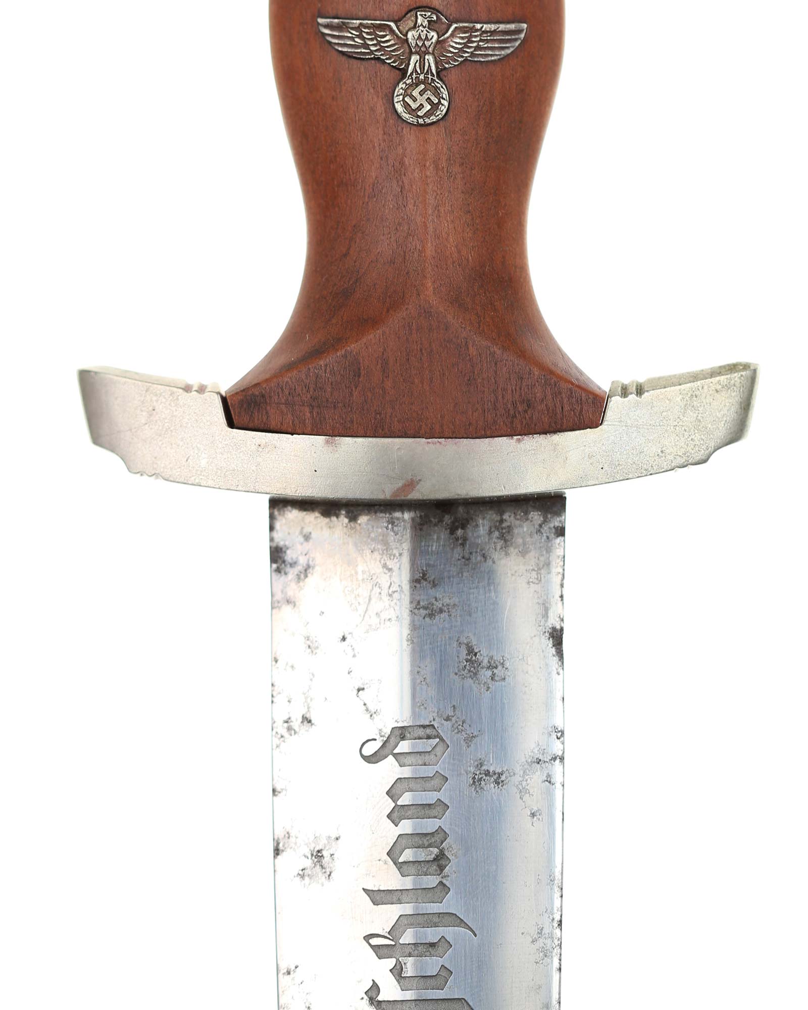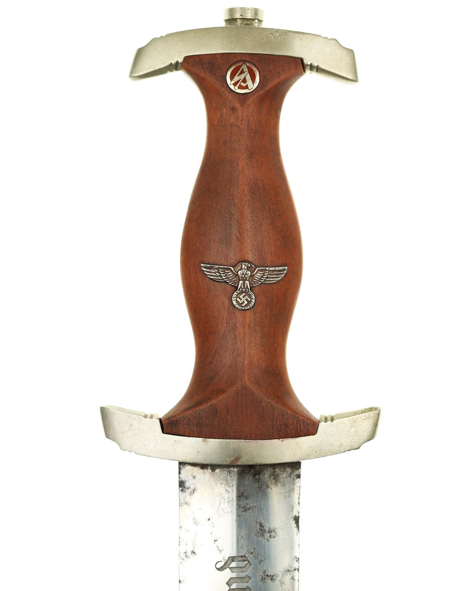 Griff: Brauner Holzgriff, mit Hoheitsadler im Griff, darüber befindet sich das emaillierte SA-Emblem, diese sind innen geklammert. Beide Parierstangen sind aus Nickel.
