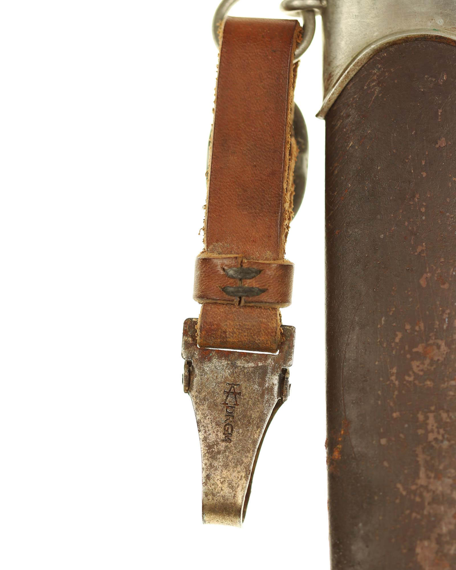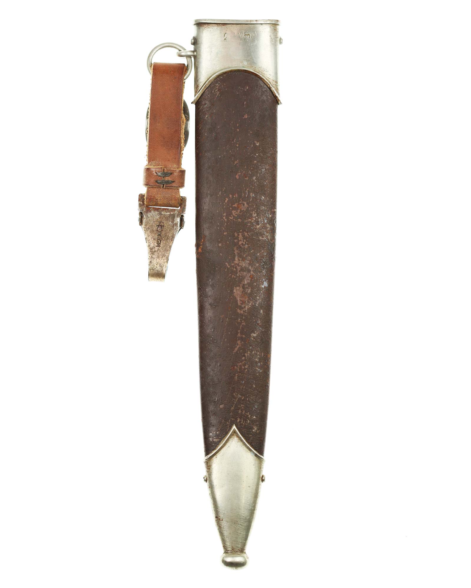 Scheide: Die Scheide ist aus Eisen und ist orig. brüniert. Die beiden Scheidenbeschläge sind aus vernickeltem Stahlblech, der obere ist handgestanzt. Die Beschläge werden mit jeweils zwei Schräubchen seitlich gehalten.