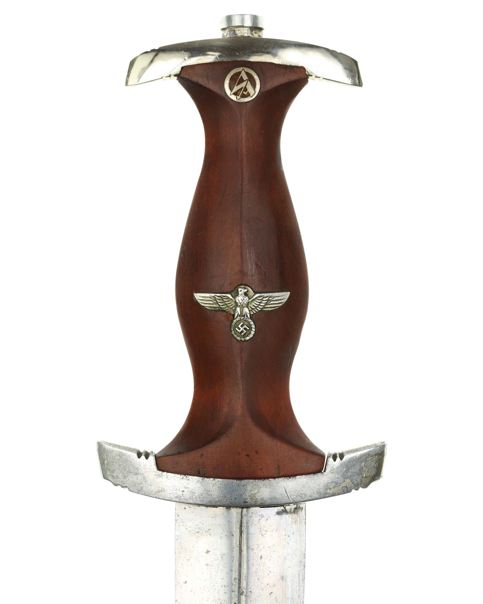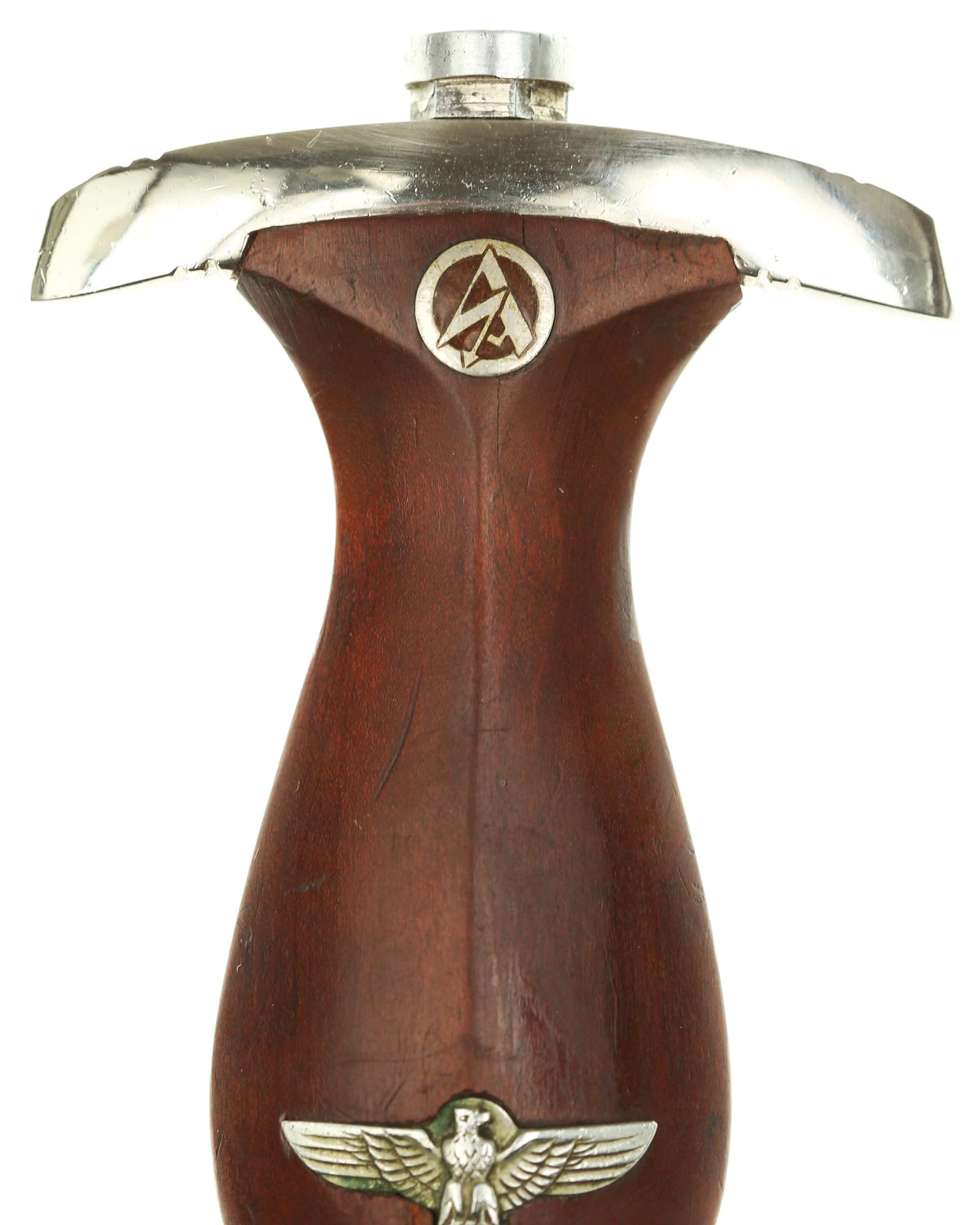 Griff: Brauner Holzgriff, der Hoheitsadler im Griff ist in Nickelausführung, darüber befindet sich das emaillierte SA-Emblem, diese sind innen geklammert.