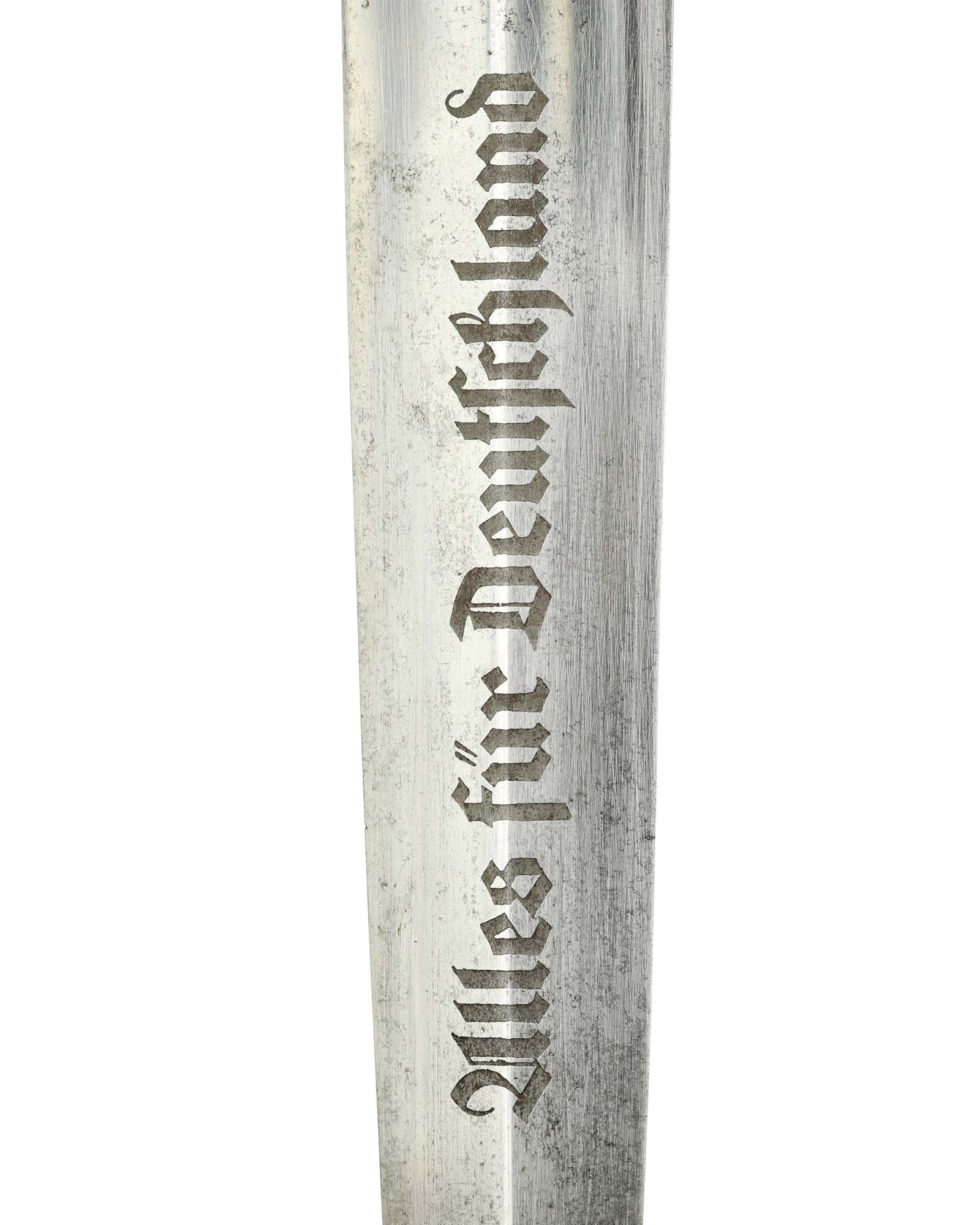 Klinge: Die Klinge ist zweischneidig und ohne Schäden. Die SA Devise «Alles für Deutschland» ist tief und zackig. Auf der Rückseite befindet sich das RZM Herstellerlogo: RZM M7/27 - Puma Solingen. Die Schultern der Klinge passen perfekt zu der oberen Parierstange, ohne Zwischenraum.