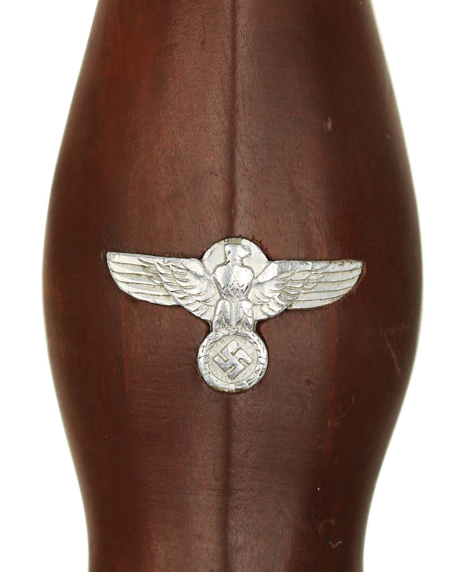 Griff: Brauner Holzgriff, mit Hoheitsadler im Griff, darüber befindet sich das emaillierte SA-Emblem, diese sind innen geklammert.