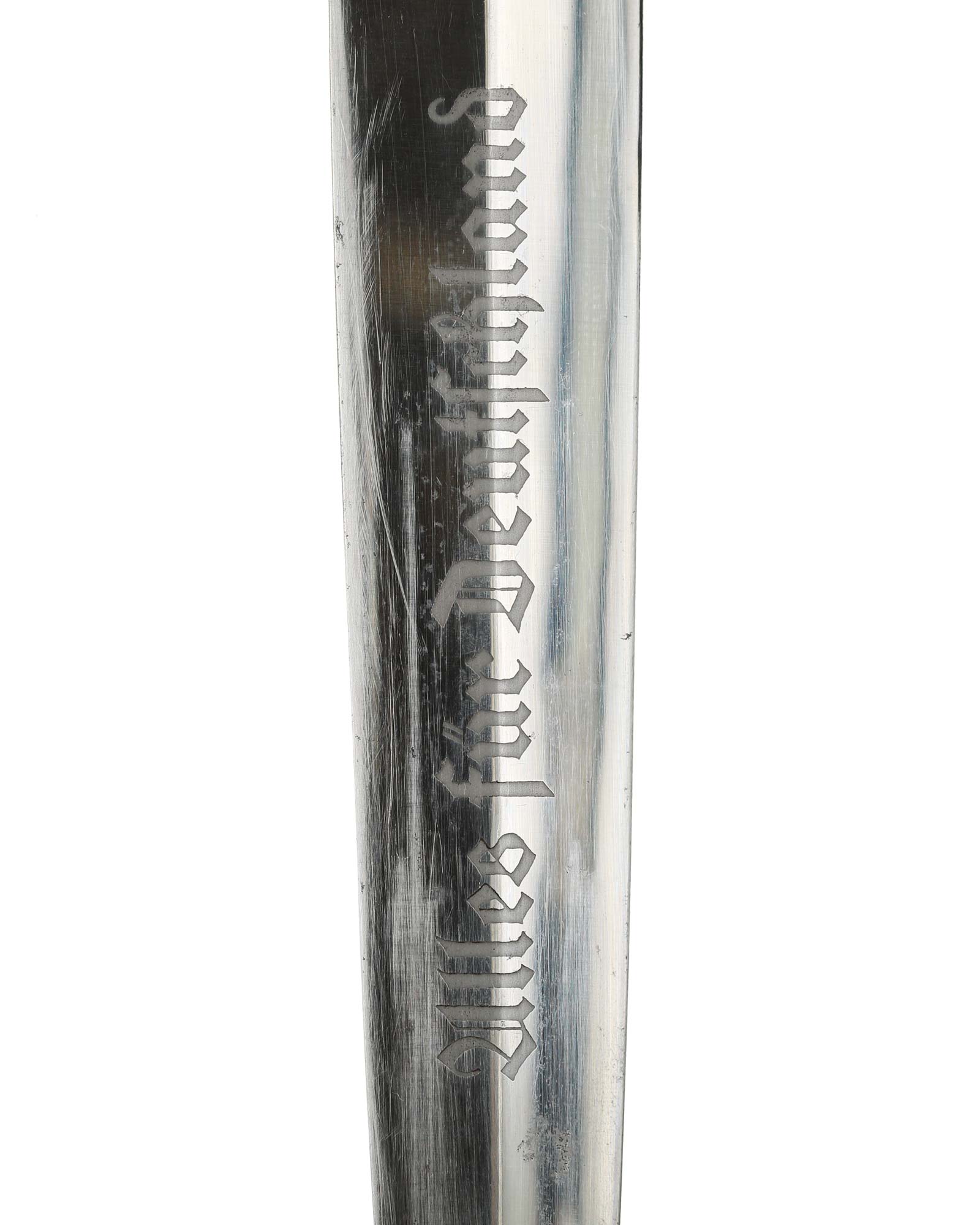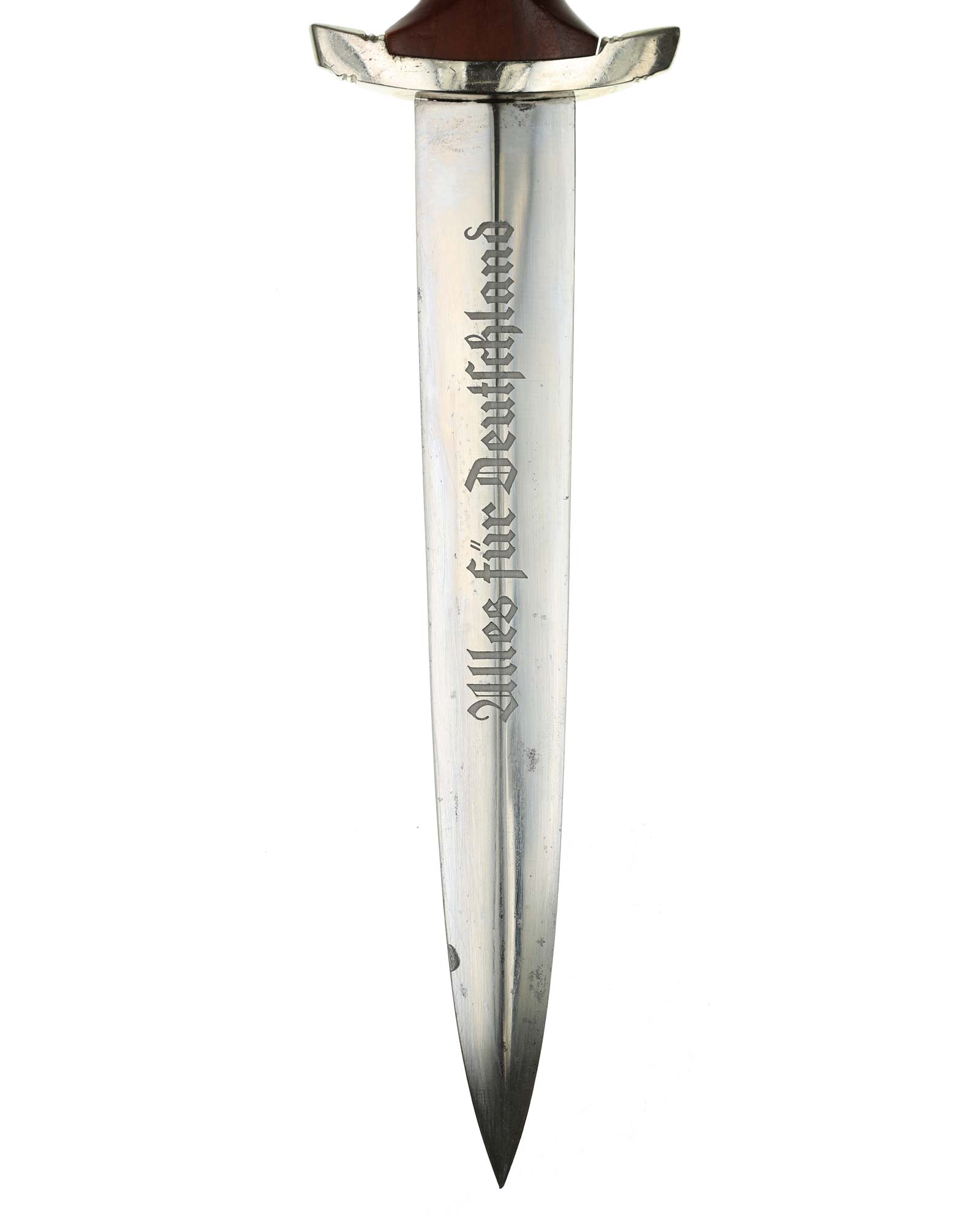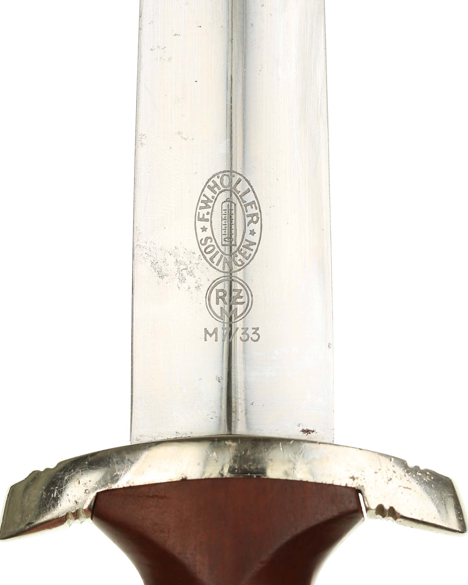 Klinge: Die Klinge ist zweischneidig. Auf der Vorderseite der Klinge befindet sich die SA Devise, mit der Inschrift: Alles für Deutschland. Auf der Rückseite befindet sich das Herstellerlogo F.W. Höller Solingen und der RZM Code: RZM M7/33. Die Klingenschultern passen perfekt zu der unteren Parierstange.
