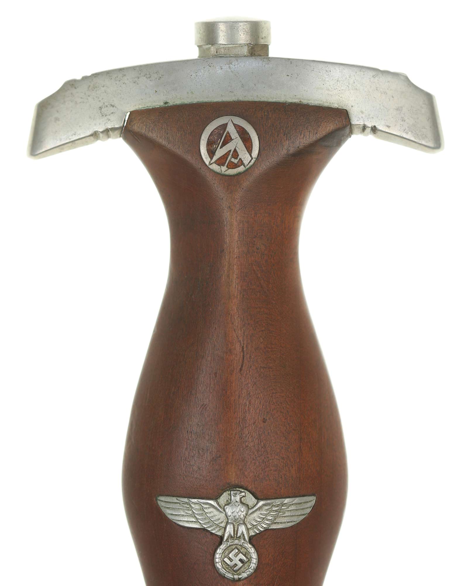 Griff: Brauner Holzgriff, mit Hoheitsadler im Griff, darüber befindet sich das emaillierte SA-Emblem, diese sind innen geklammert. Beide Parierstangen sind aus Nickel.