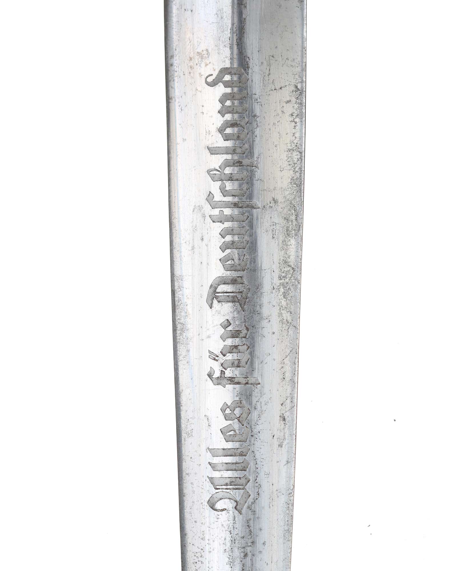 Klinge: Auf der Vorderseite der Klinge befindet sich die SA Devise, mit der Inschrift: Alles für Deutschland. Auf der Rückseite befindet sich das Herstellerlogo Wilh. Weltersbach Solingen. Die Klingenschultern passen perfekt zu der unteren Parierstange.