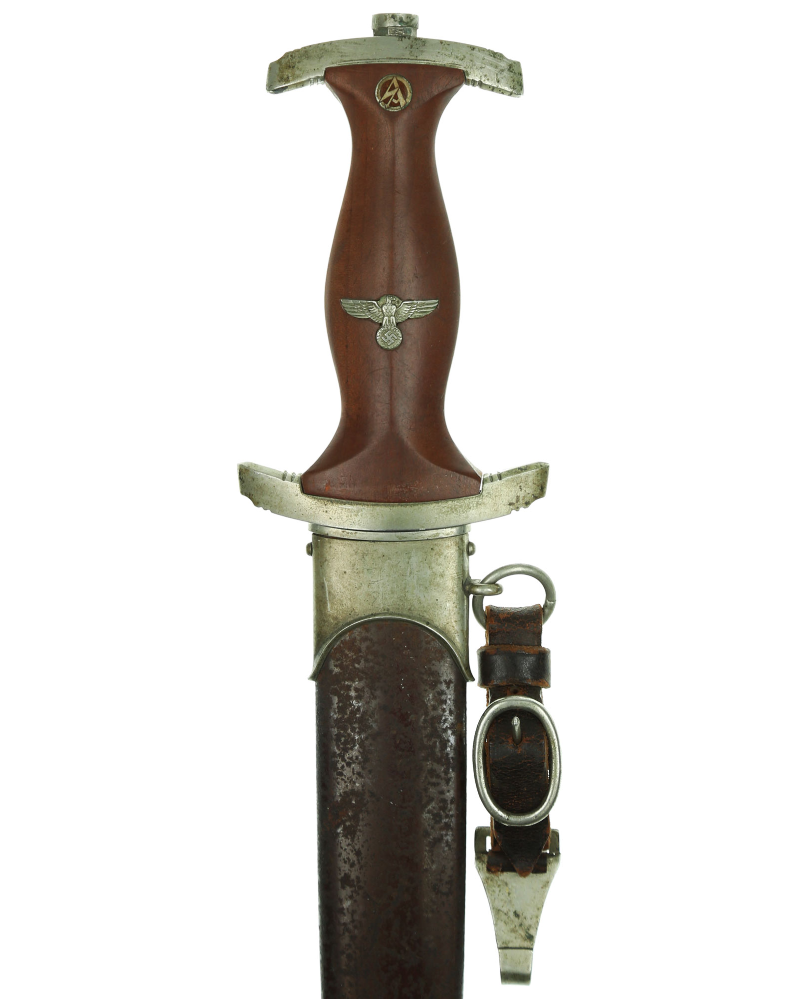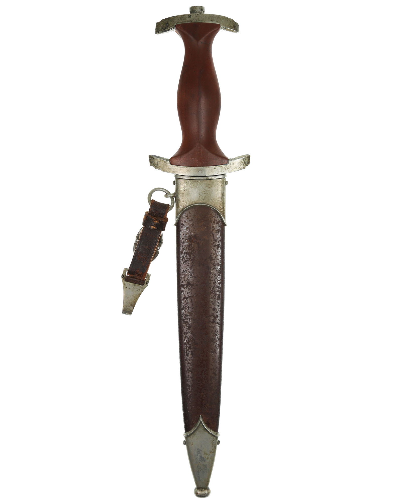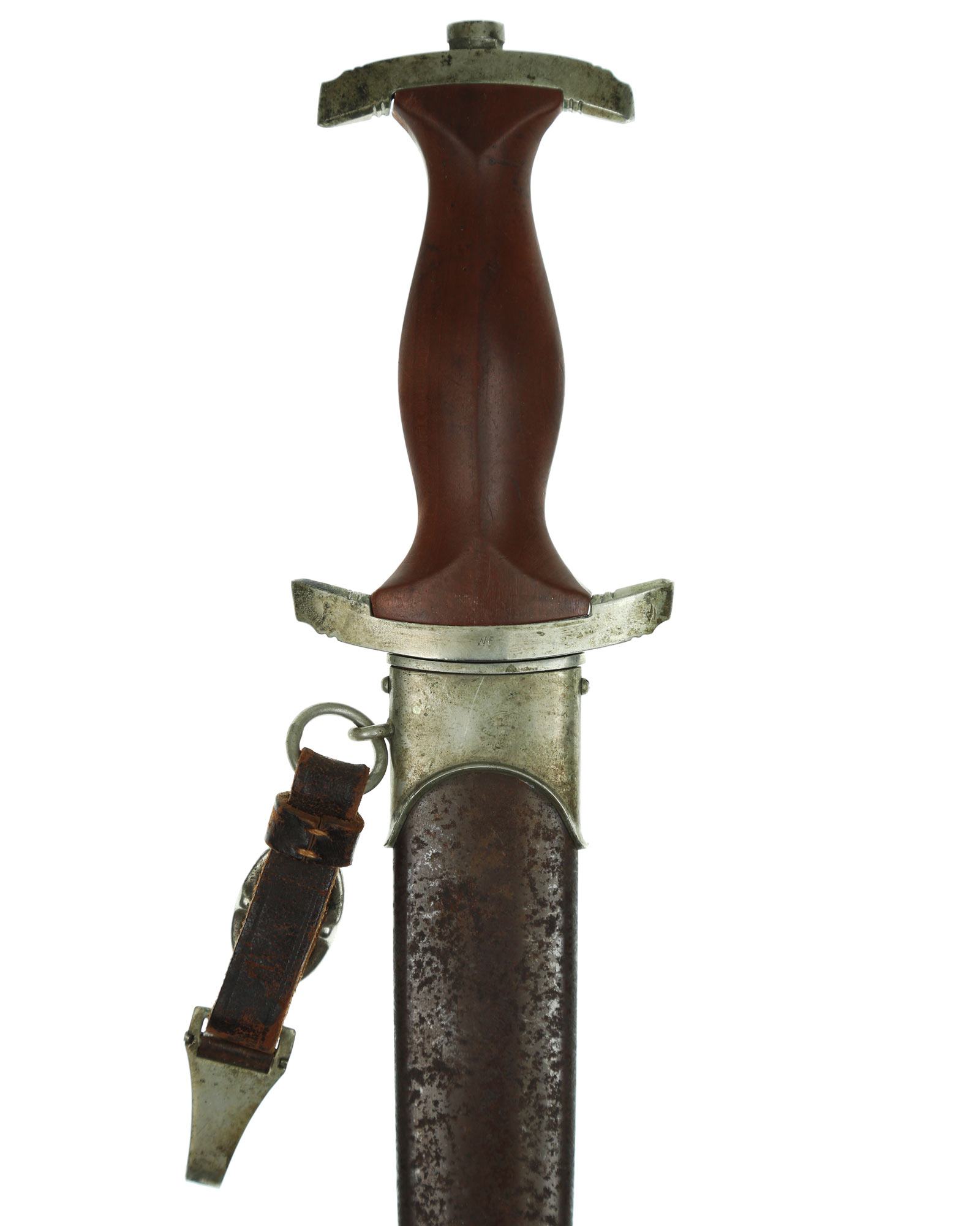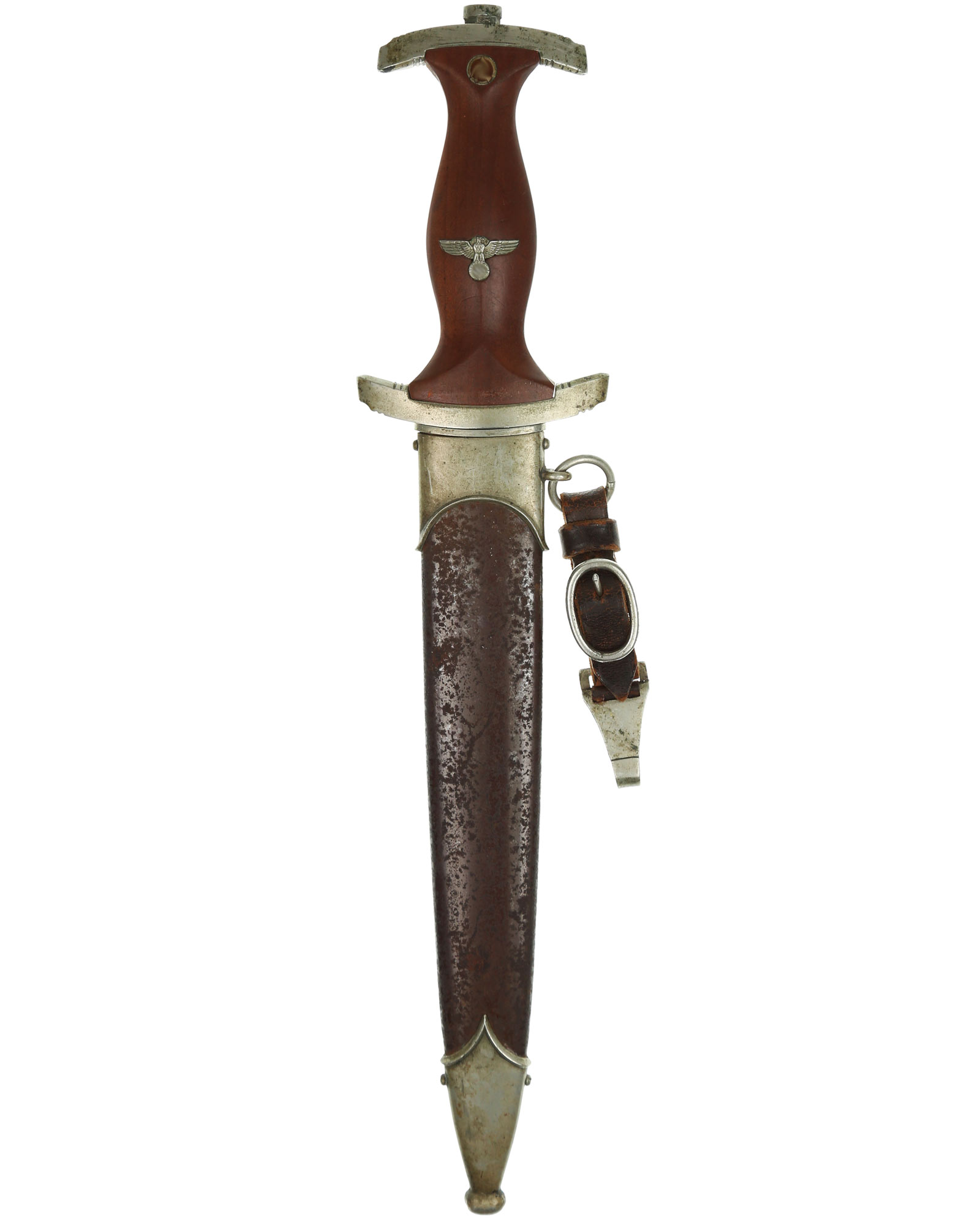 Dienstdolch der Sturmabteilung [SA] mit Leder-Gehänge, in früher Fertigung 1933-1935. Die Rückseite der Klinge ist mit dem Hersteller: Carl Schmidt & Sohn Solingen.