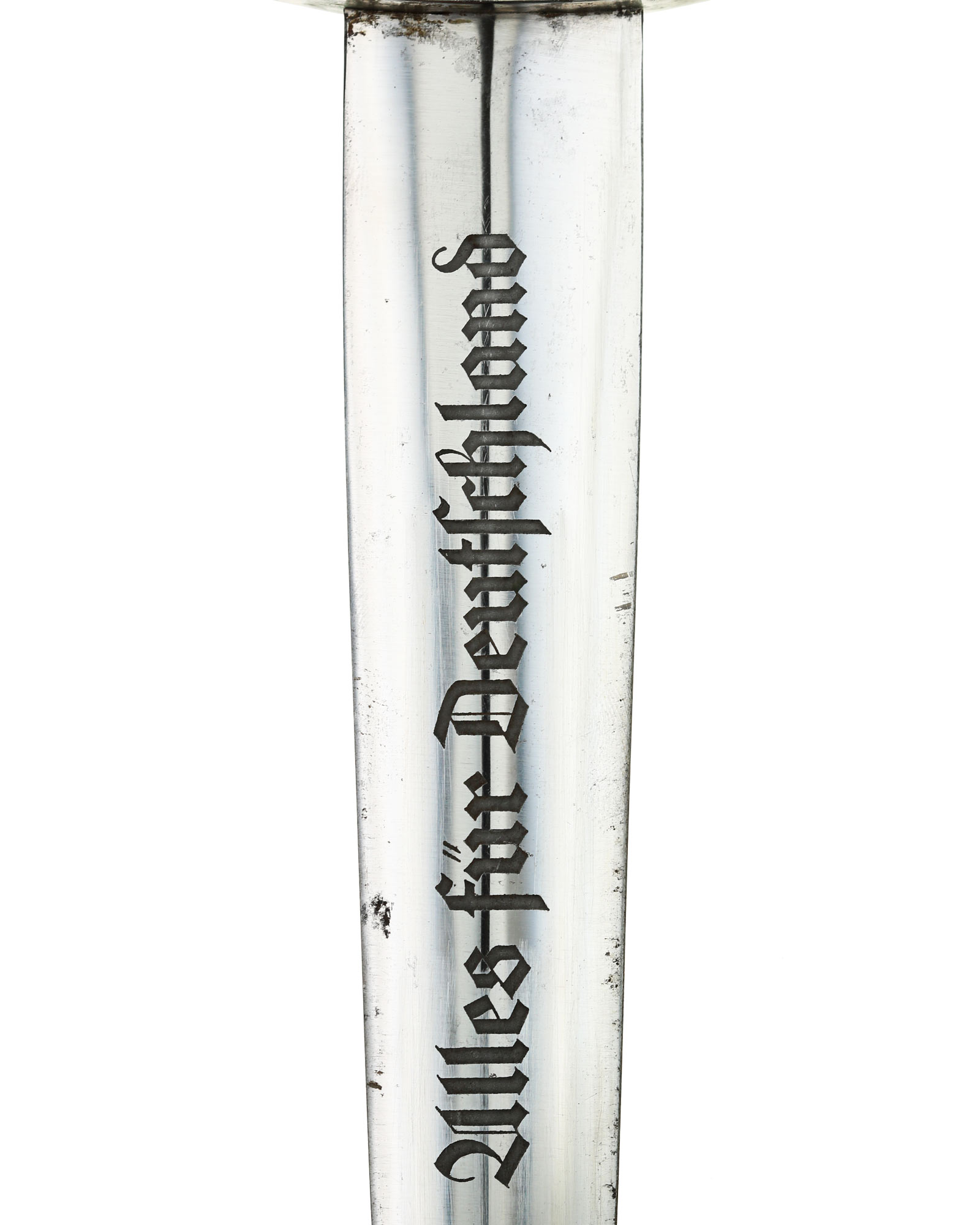 Klinge: Die Klinge ist blank und unbeschliffen. Das sog. "Crossgrain" ist zu 100% erhalten. Auf der Vorderseite der Klinge befindet sich die SA Devise, diese ist dunkel und zackig, mit der Inschrift: Alles für Deutschland, die Rückseite hat das Herstellerlogo: Carl Schmidt & Sohn Solingen. Die Klingenschultern passen perfekt auf die untere Parierstange.