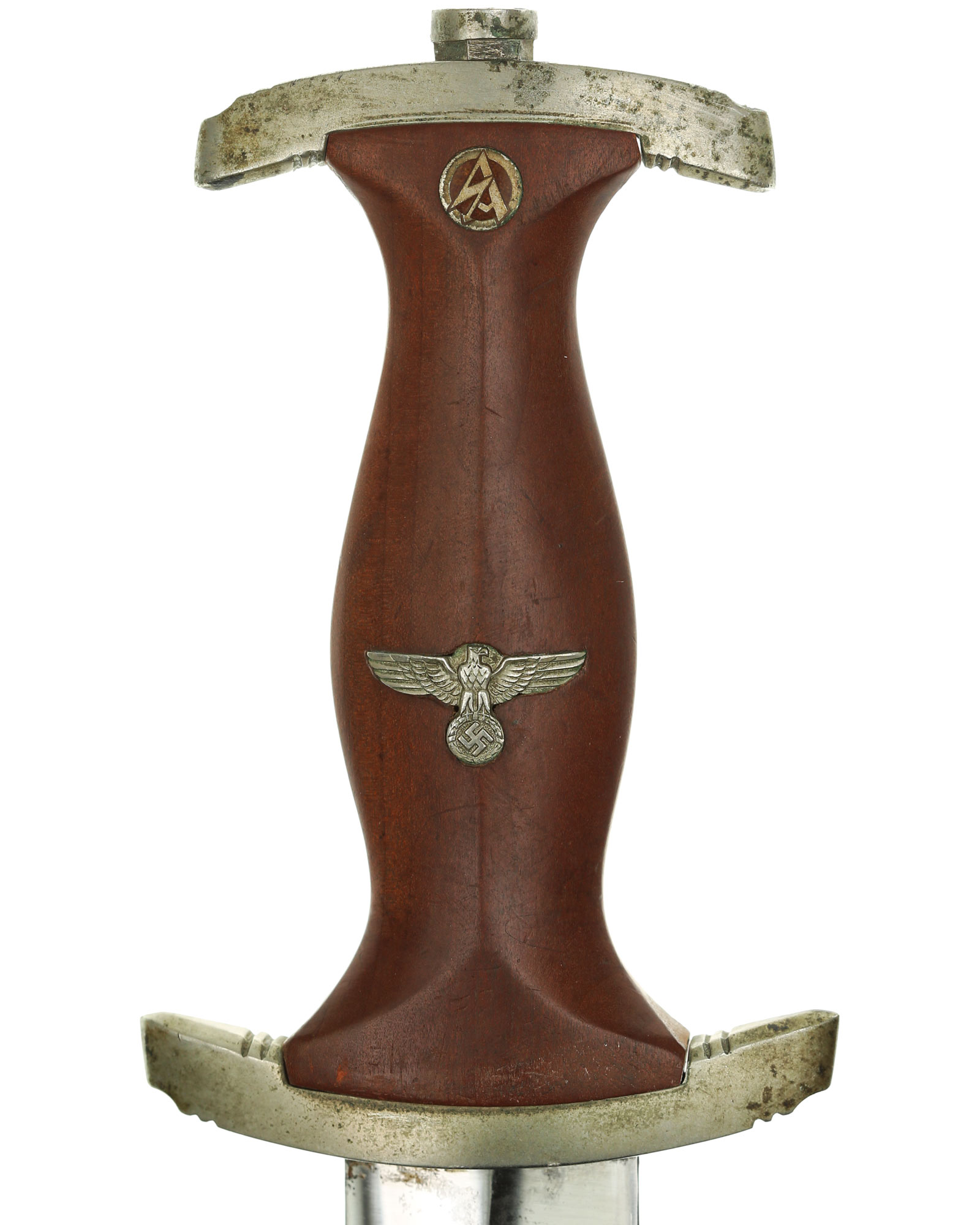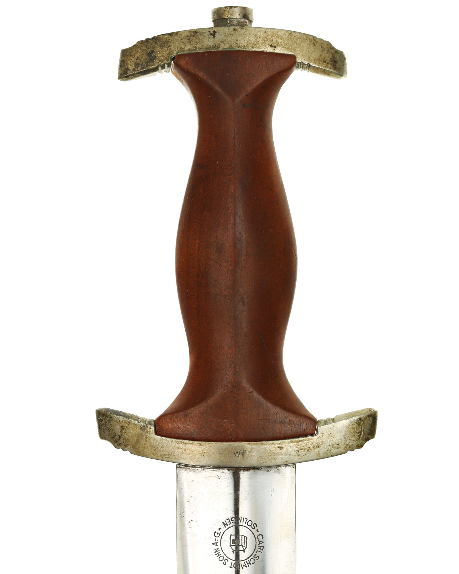 Griff: Brauner Holzgriff, der Hoheitsadler im Griff ist in Nickelausführung, darüber befindet sich das emaillierte SA-Emblem, diese sind innen geklammert. Beide Parierstangen sind aus Nickel. Die untere Parierstange ist auf der Rückseite mit dem Gruppenstempel Wf [Westfalen] handgestanzt, was zum diesem Hersteller passt.