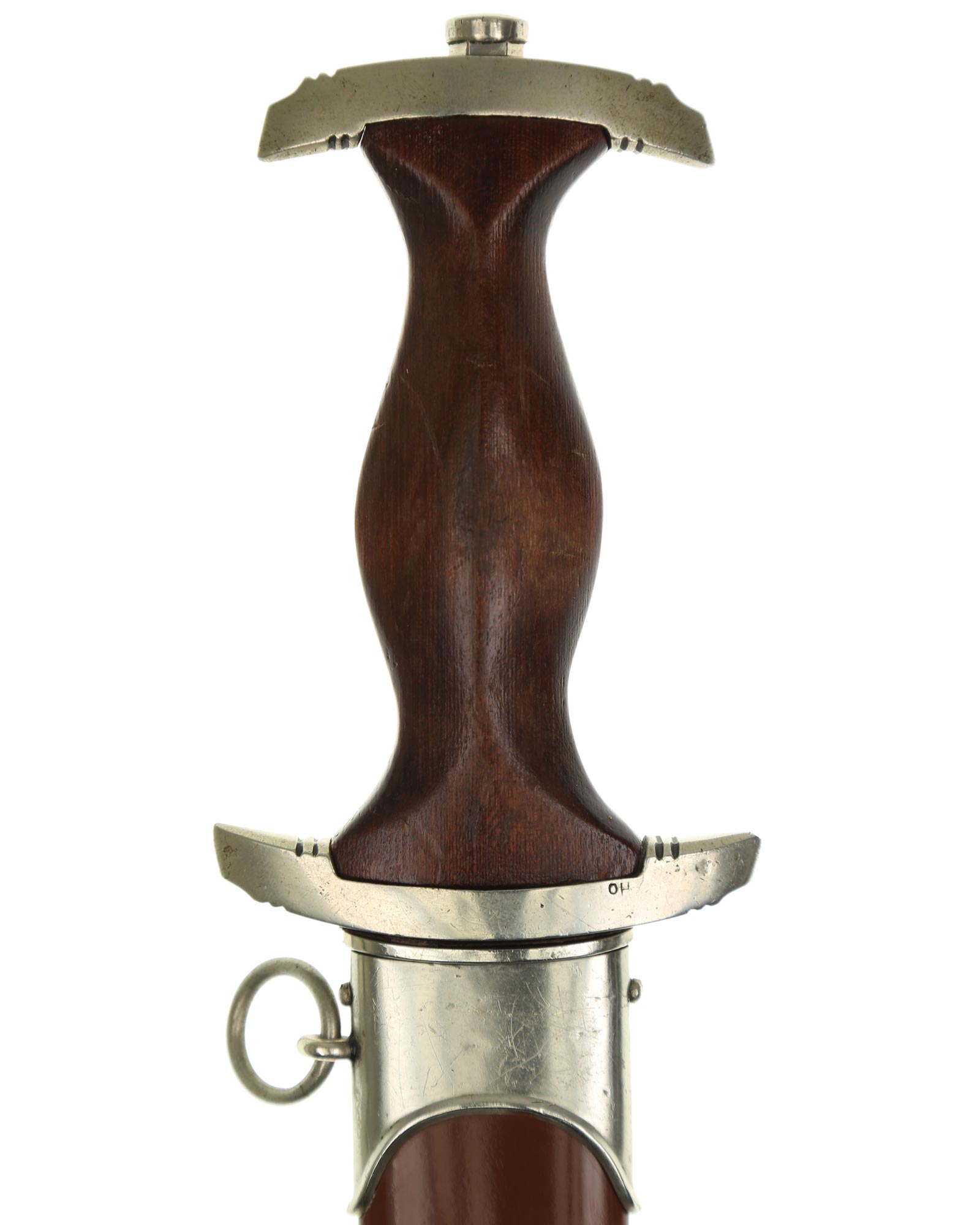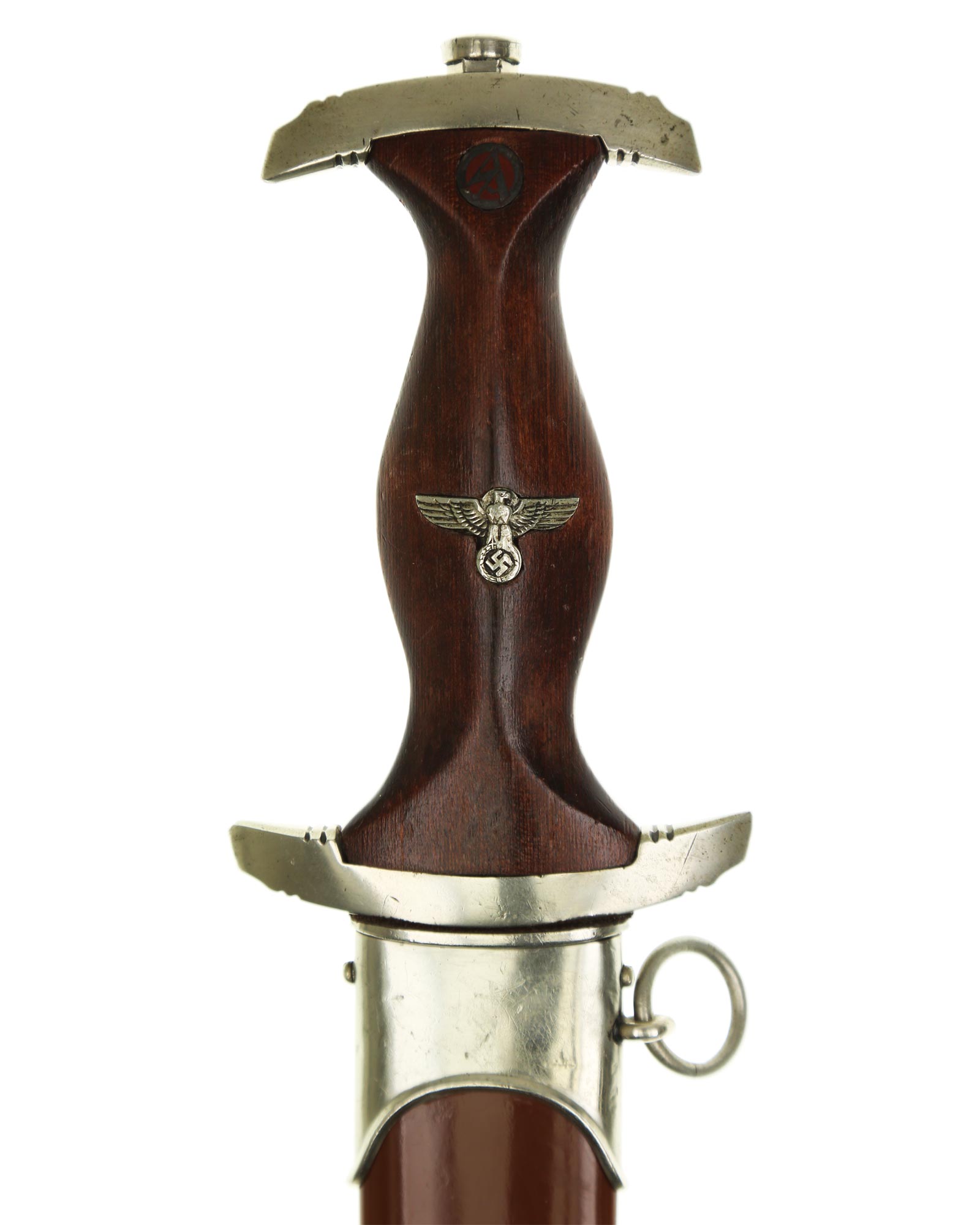 Griff: Brauner Holzgriff, der Hoheitsadler im Griff ist in Nickelausführung. Über dem Adler befindet sich das emaillierte SA-Emblem. Der Holzgriff wurde mit einer Schutzschicht versiegelt, diese ist zum Teil noch vorhanden. Beide Parierstangen sind aus Nickel. Die untere Parierstange ist auf der Rückseite mit dem Gruppenstempel Ho [Hochland] handgestanzt.