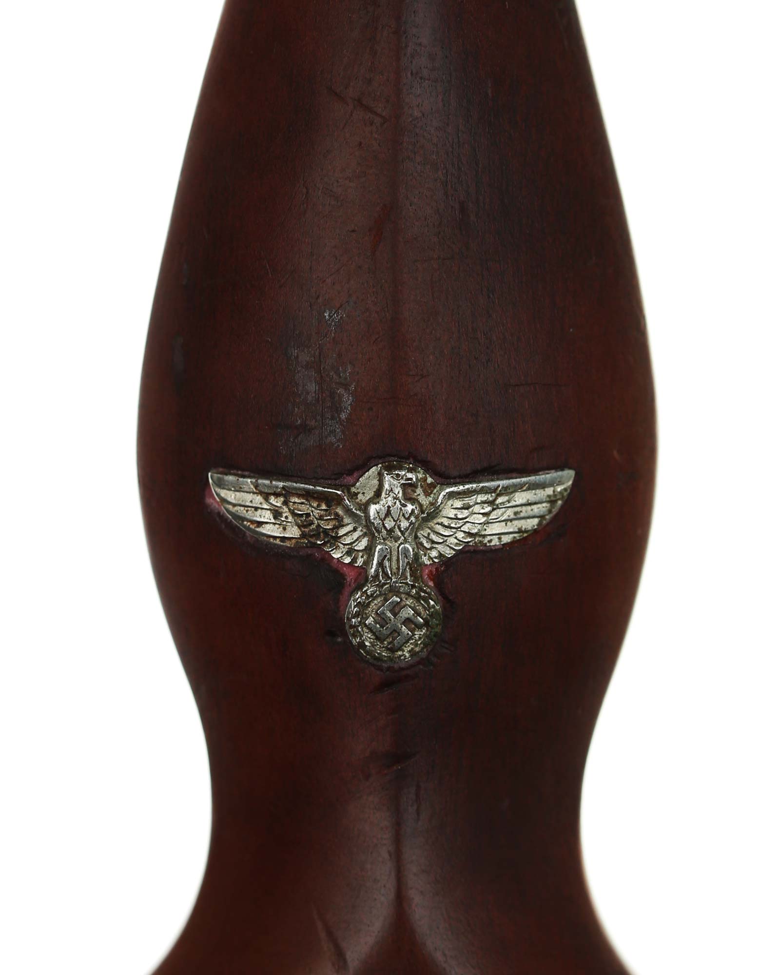 Griff: Brauner Holzgriff, mit Hoheitsadler im Griff, darüber befindet sich das emaillierte SA-Emblem, diese sind innen geklammert. Beide Parierstangen sind aus Nickel. Untere Parierstange mit Reichsgau Stempel «Wm» Westmark.