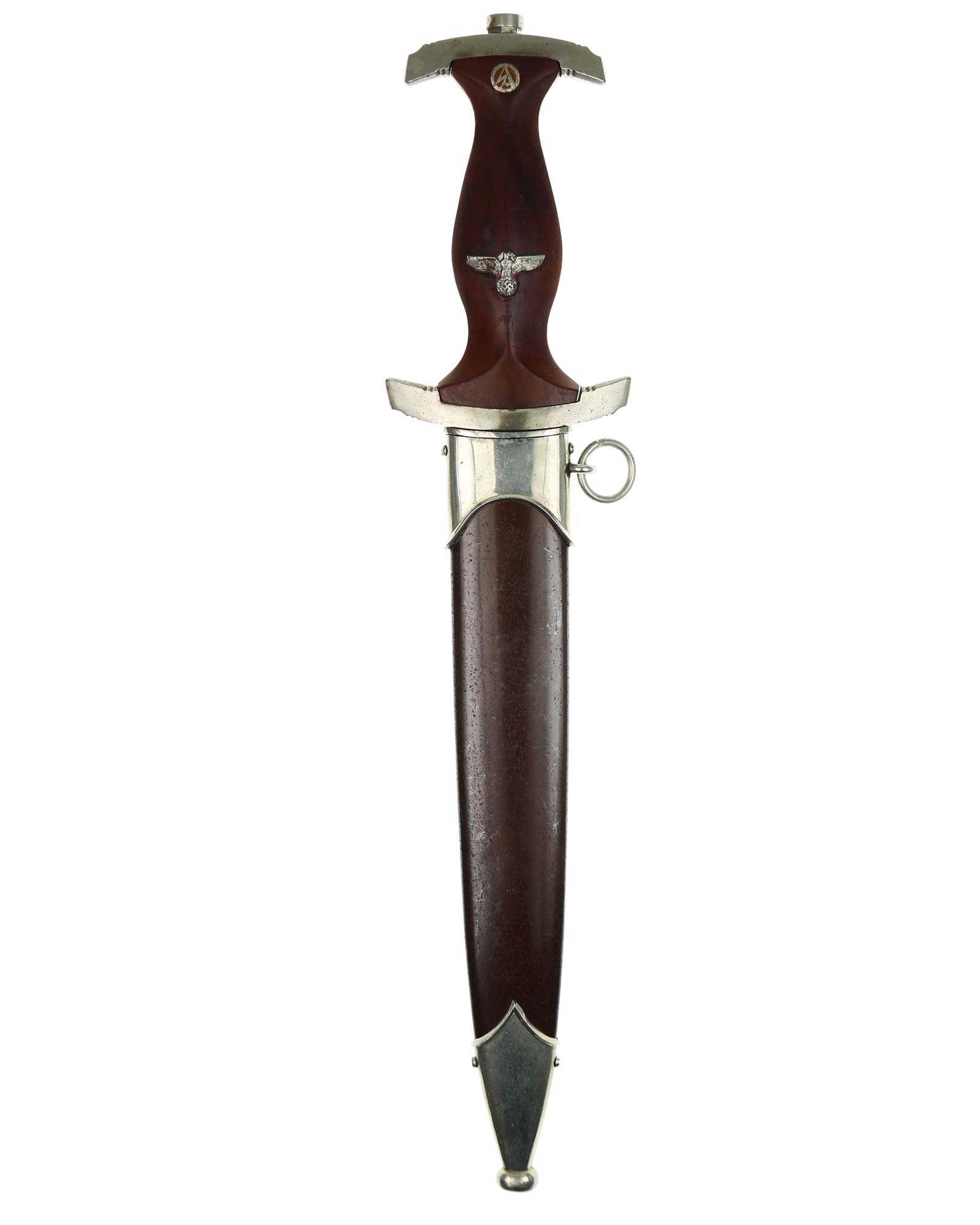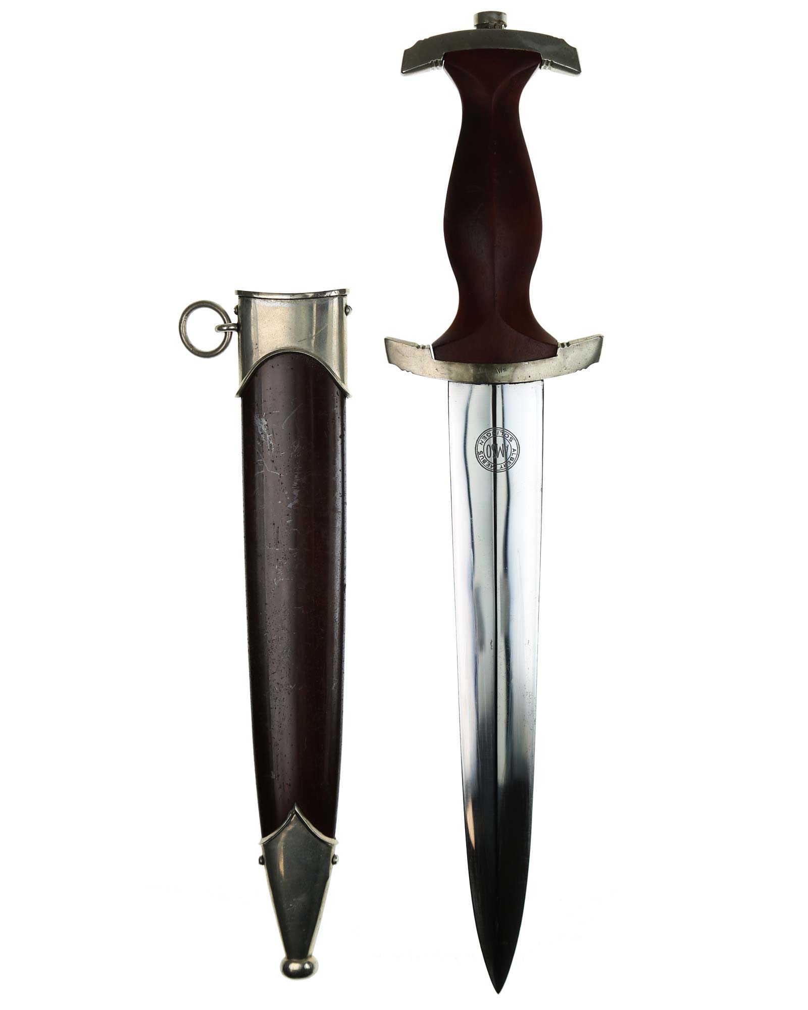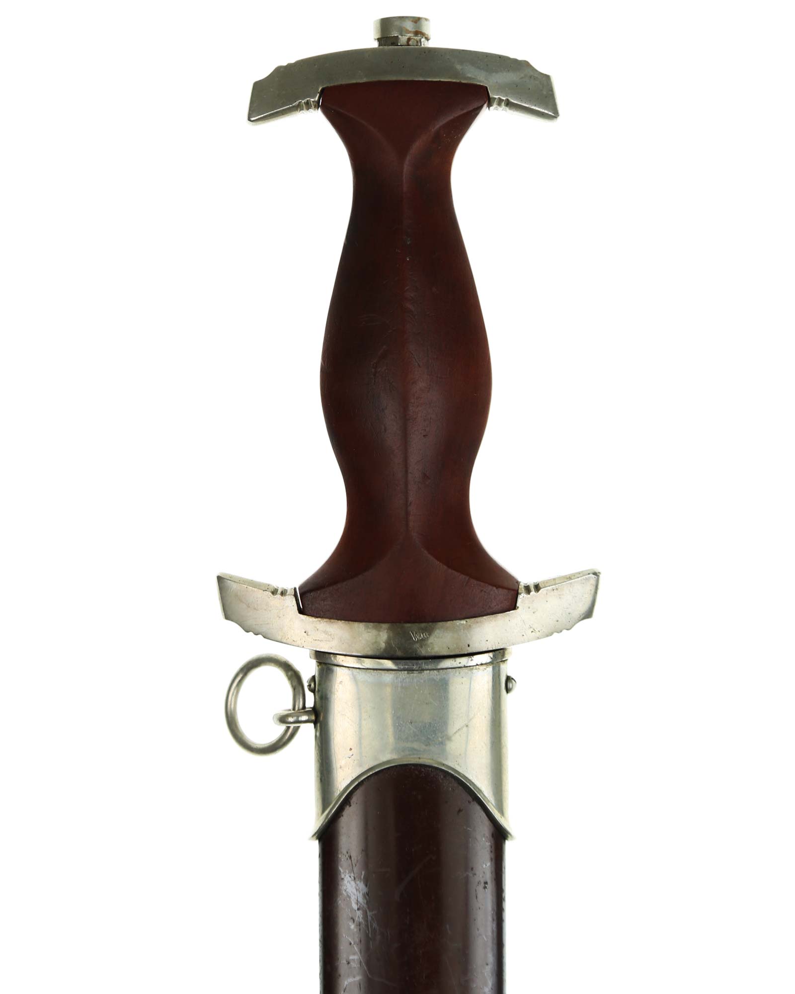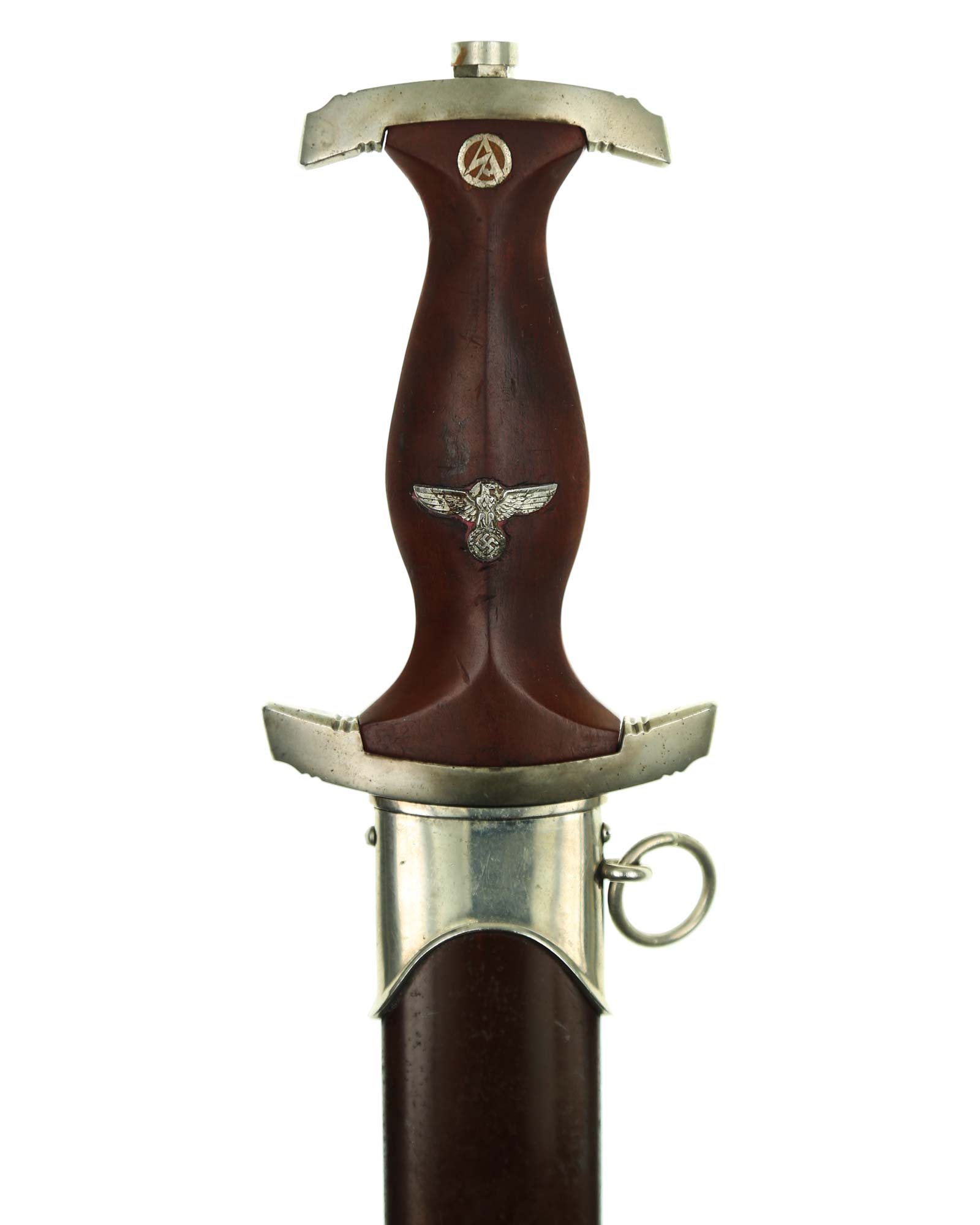 Dienstdolch der Sturmabteilung [SA] in früher Fertigung 1933-1935. SA Dolch mit sehr seltenem Hersteller: Albert Mebus (AMSO) Solingen. Untere Parierstange mit Gruppenstempelung «Wm» Westmark.