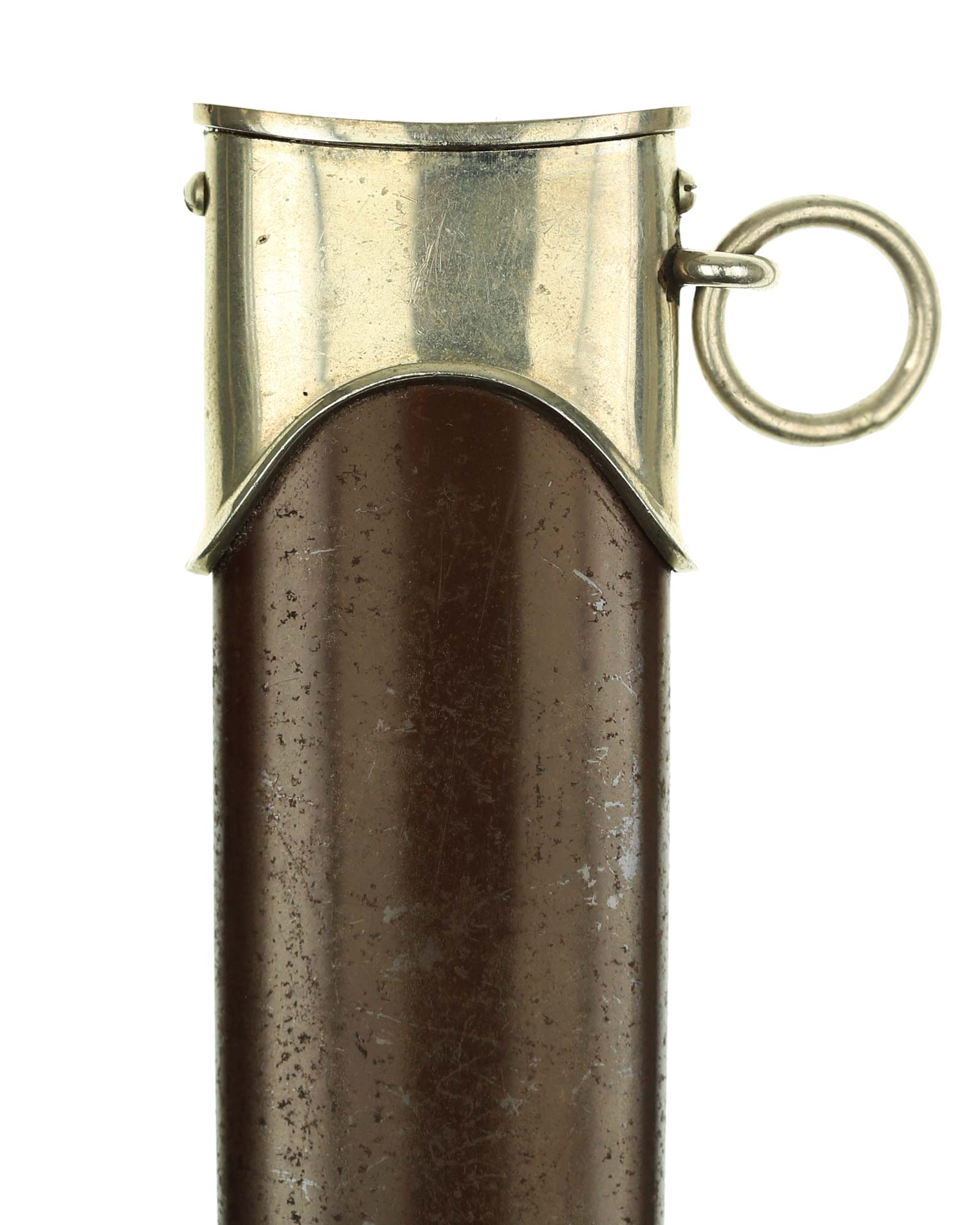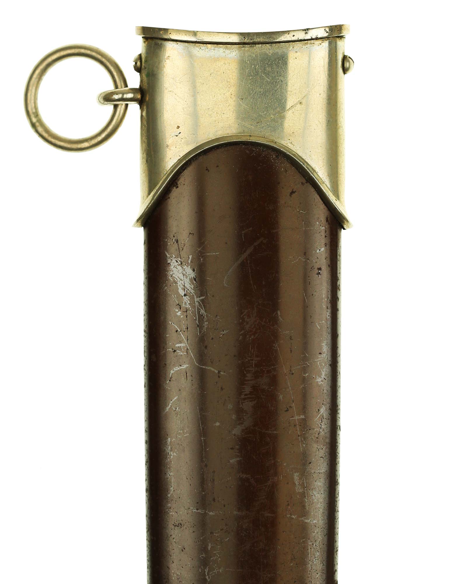 Scheide: Die Scheide ist aus Eisen und mit brauner Brünierung. Die Scheide ist gerade ohne Dellen oder Beulen. Die beiden Scheidenbeschläge sind aus vernickeltem Stahlblech. Die Beschläge werden mit jeweils zwei Schräubchen seitlich gehalten. Am oberen Beschlag befindet sich der Ring für das Tragegehänge.