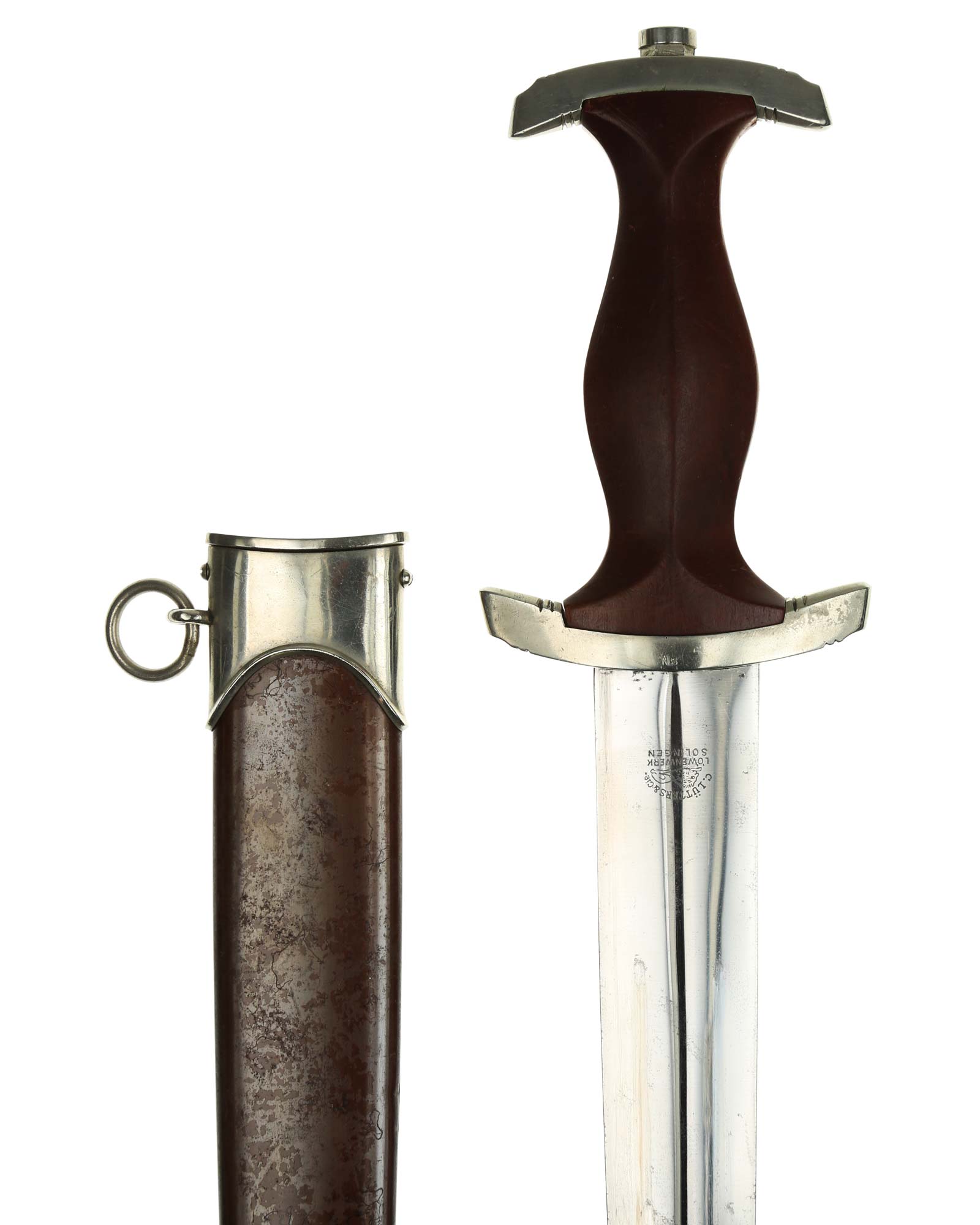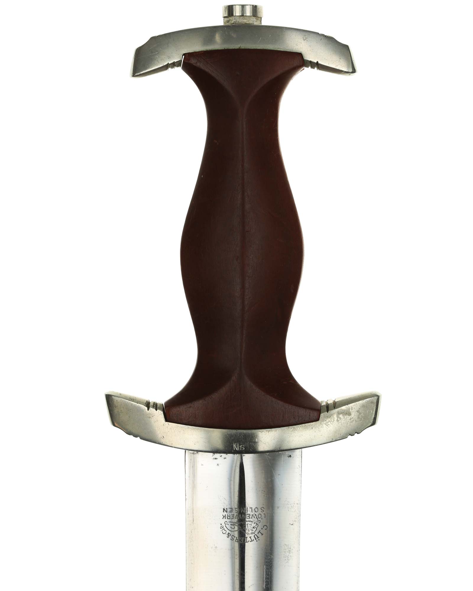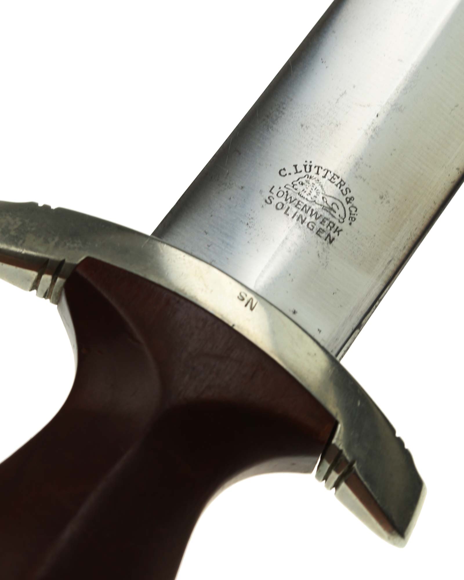 Dienstdolch der Sturmabteilung [SA] in früher Fertigung 1933-1935. SA Dolch mit sehr seltenem Hersteller: C. Lütters & Cie. (Löwenwerk) Solingen (Seltenheit 5/5). Untere Parierstange mit passender Gruppenstempelung «Ns» Niedersachsen.