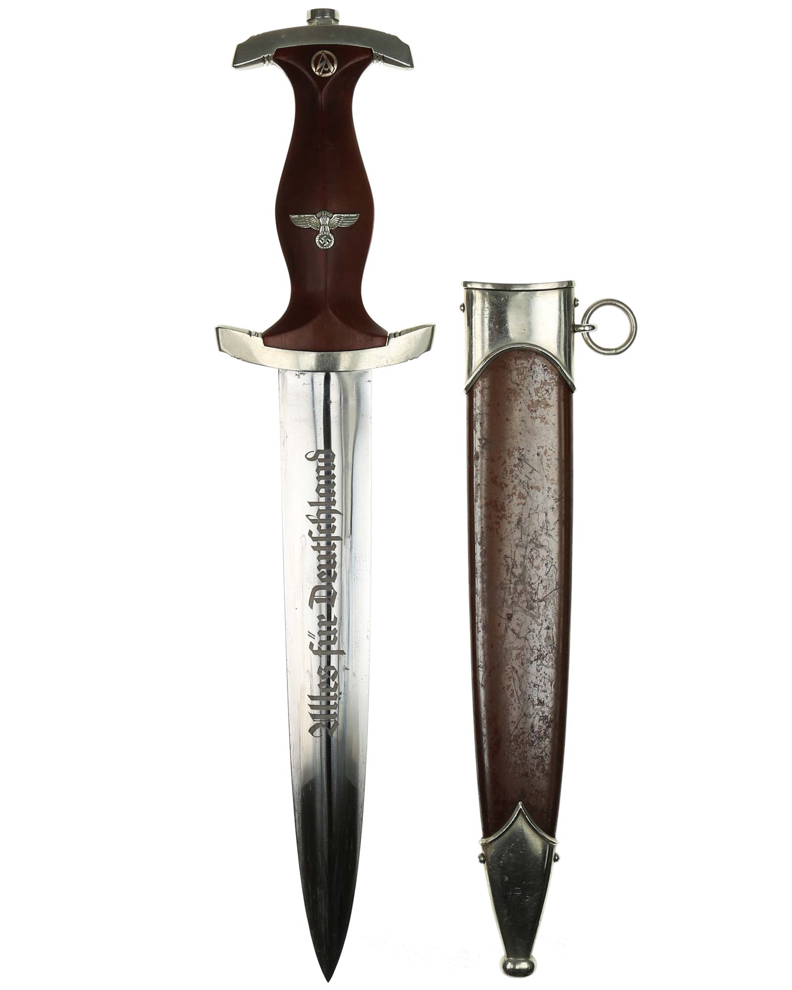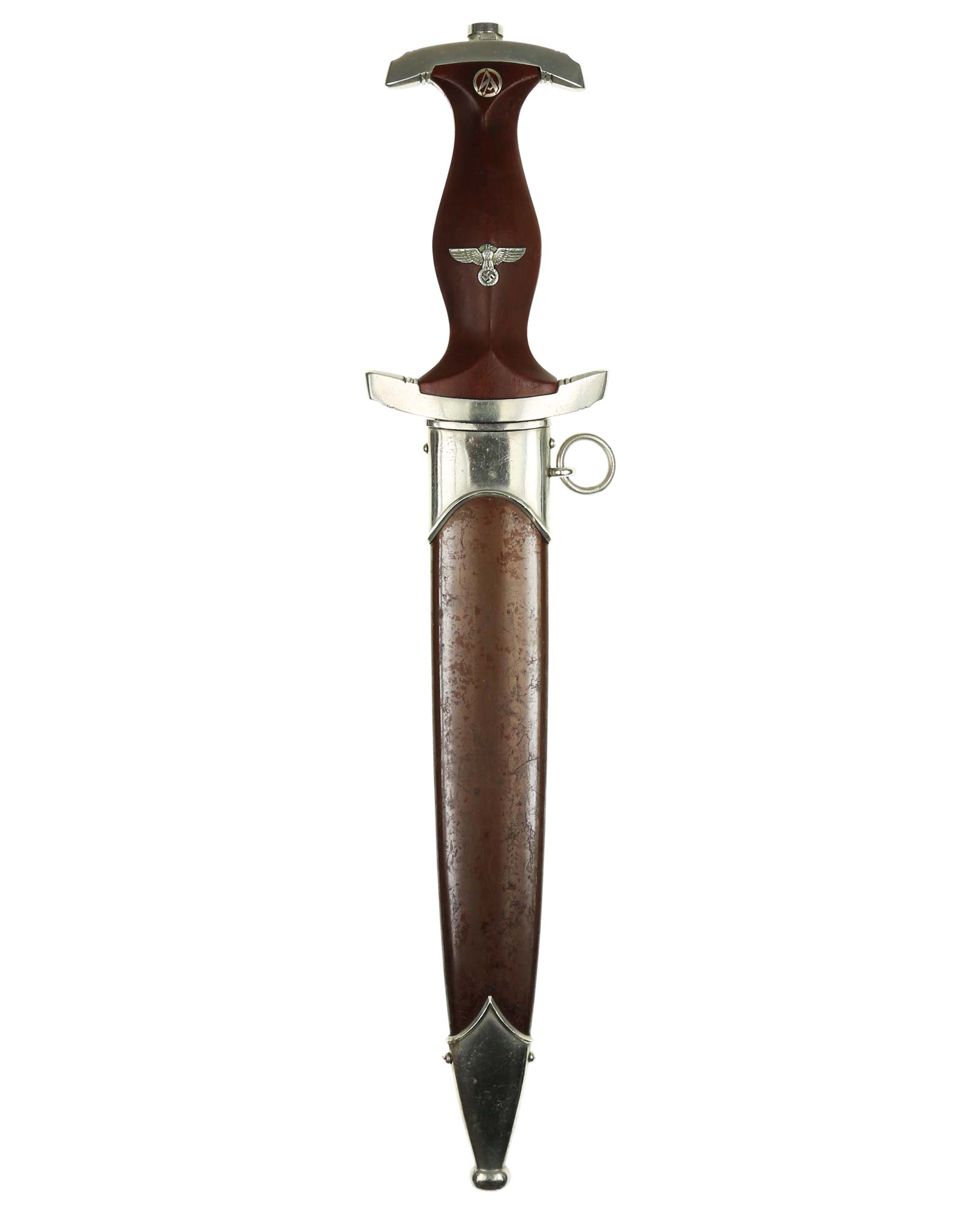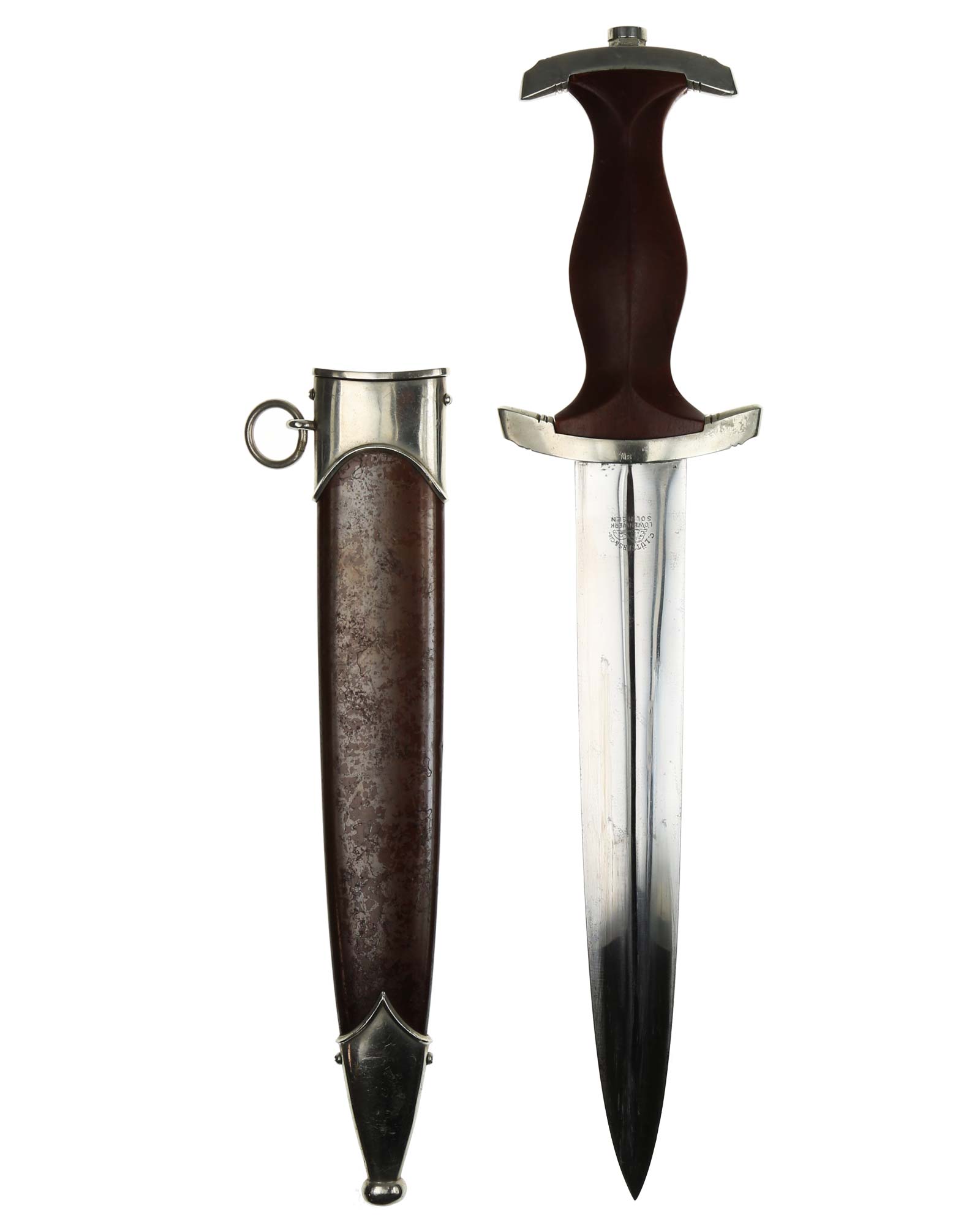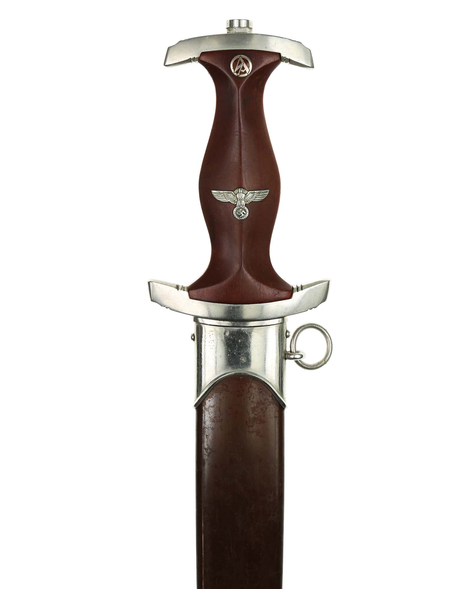 Dienstdolch der Sturmabteilung [SA] in früher Fertigung 1933-1935. SA Dolch mit sehr seltenem Hersteller: C. Lütters & Cie. (Löwenwerk) Solingen (Seltenheit 5/5). Untere Parierstange mit passender Gruppenstempelung «Ns» Niedersachsen.