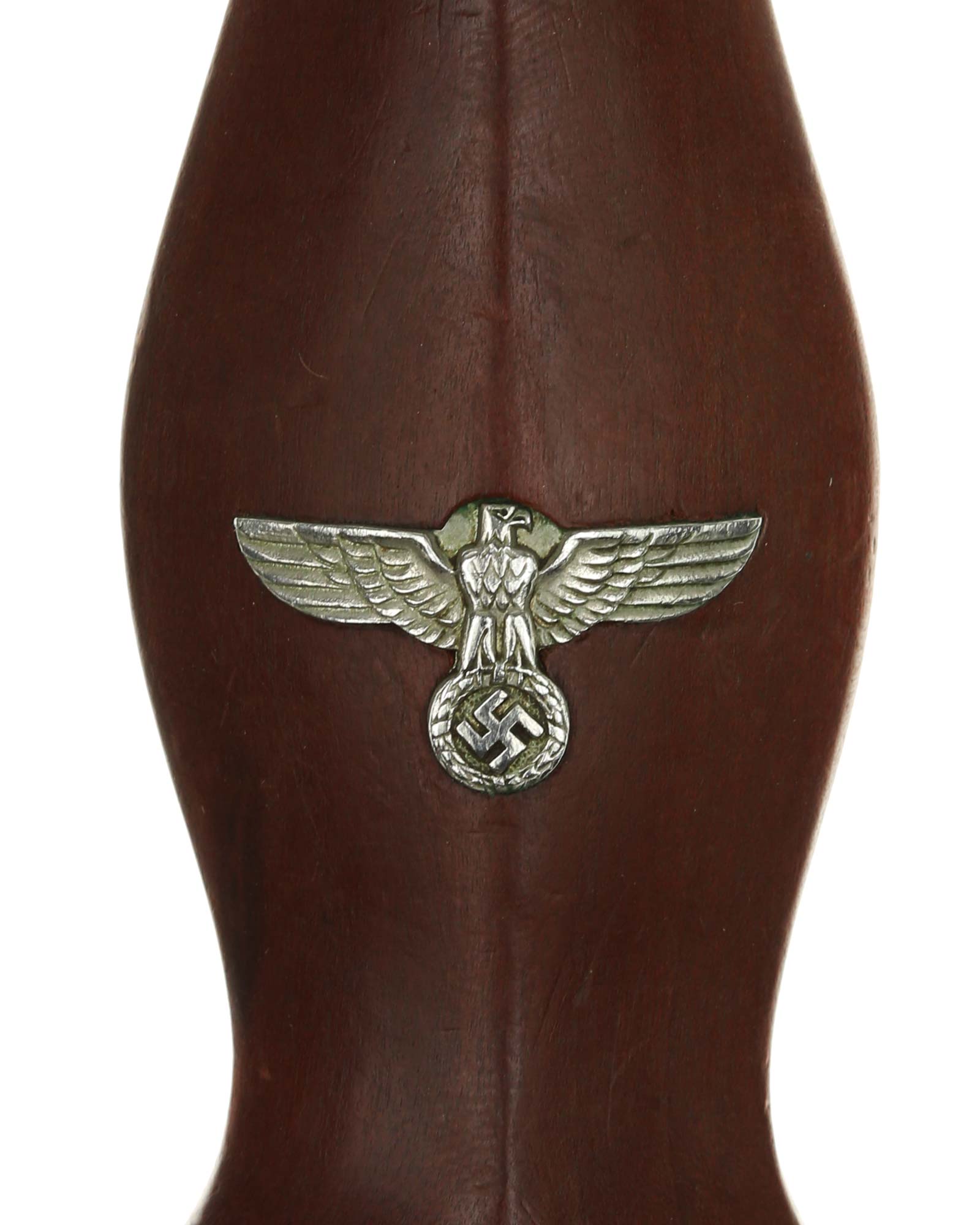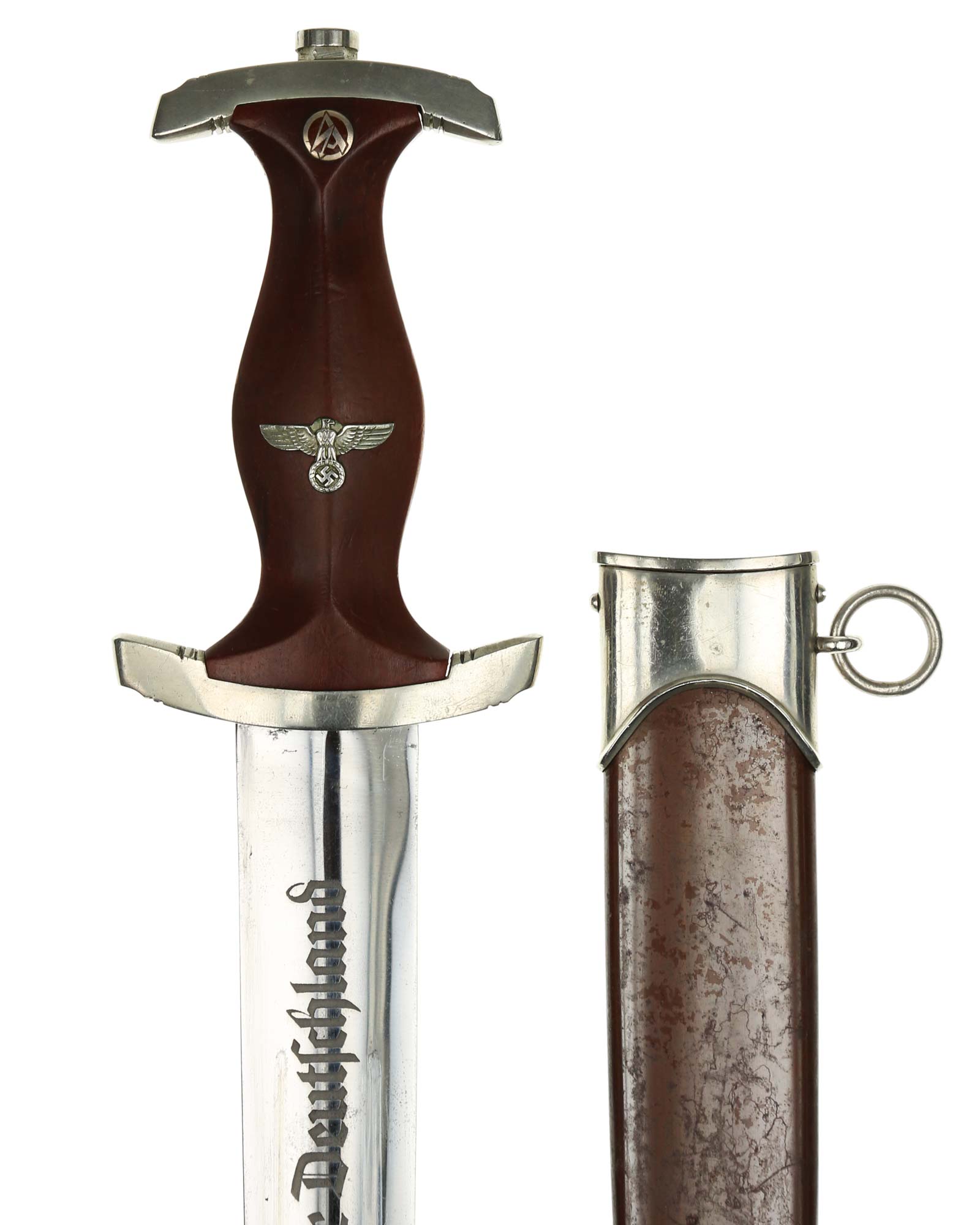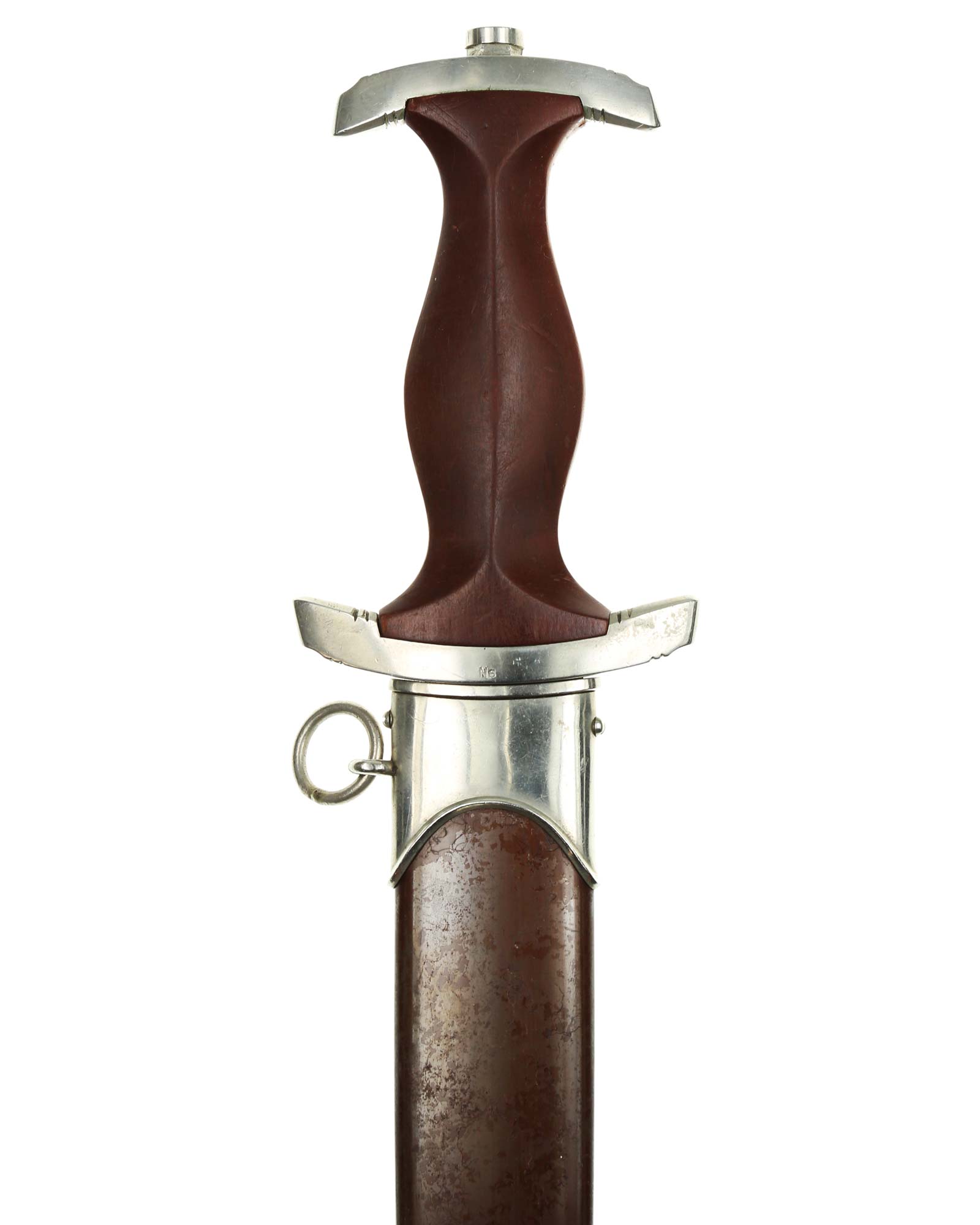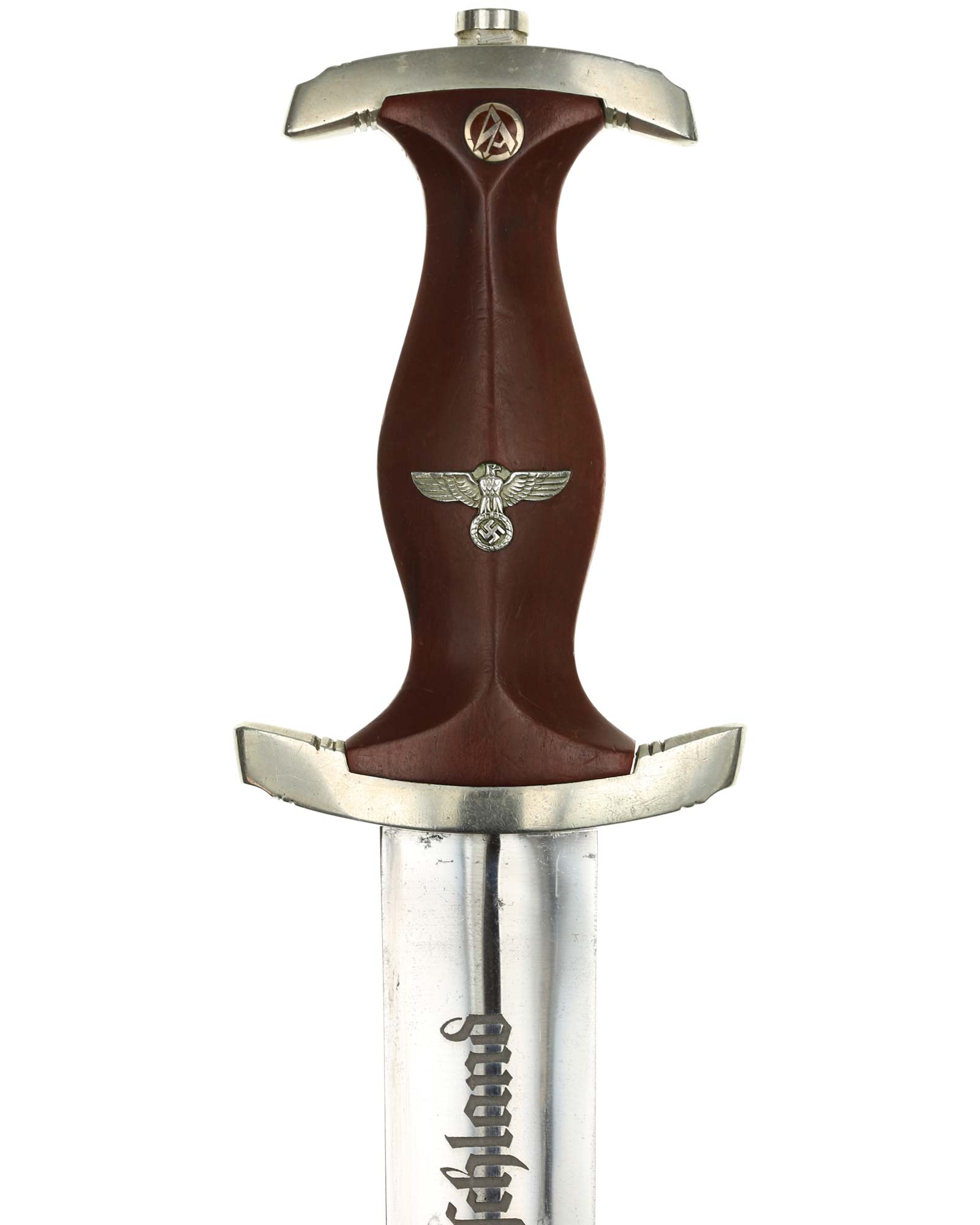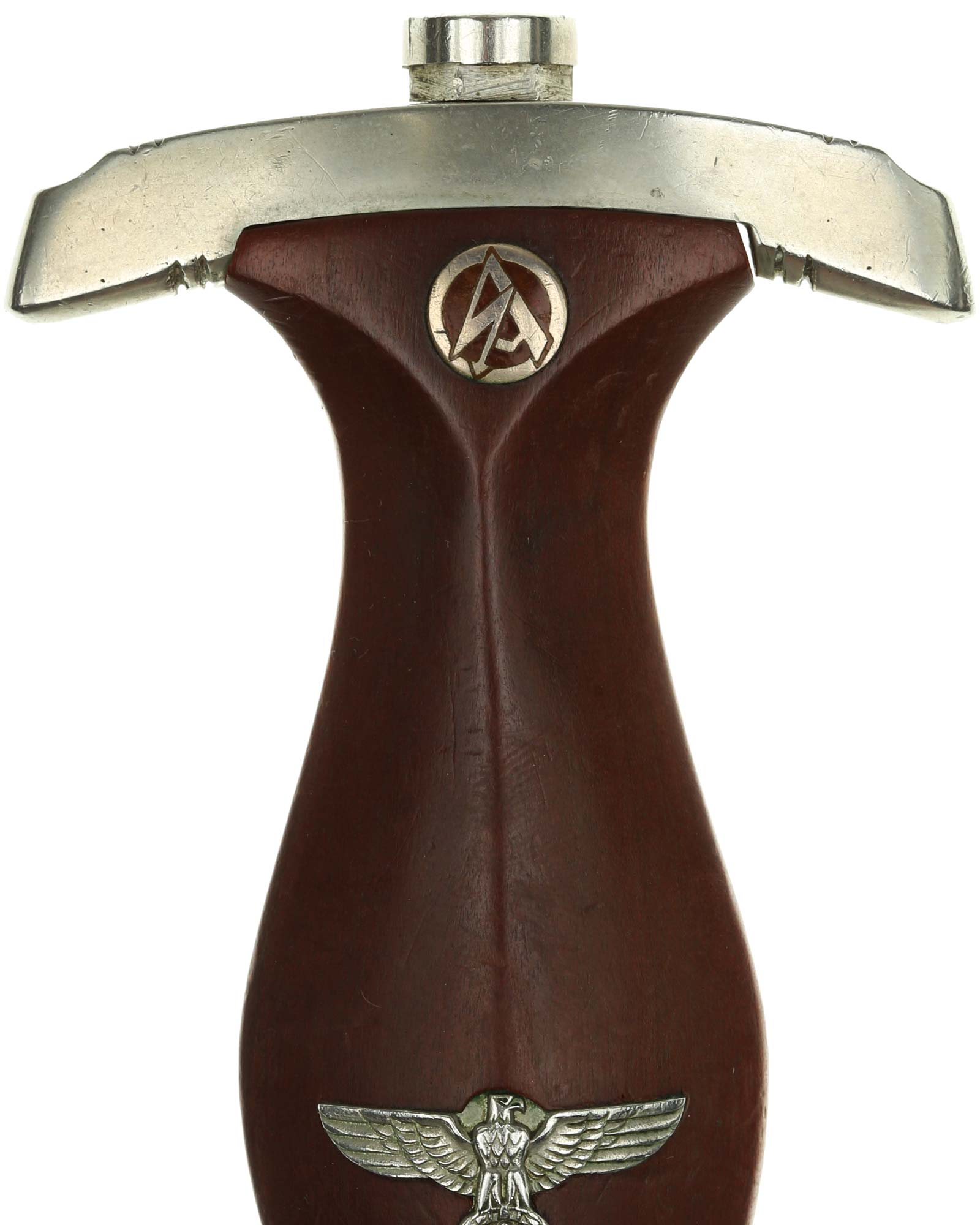 Griff: Brauner Holzgriff, mit Hoheitsadler im Griff, darüber befindet sich das emaillierte SA-Emblem, diese sind innen geklammert. Beide Parierstangen sind aus Nickel. Untere Parierstange mit Reichsgau Stempel «Ns» Niedersachsen.