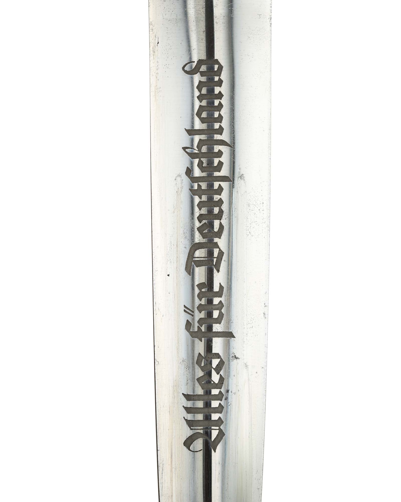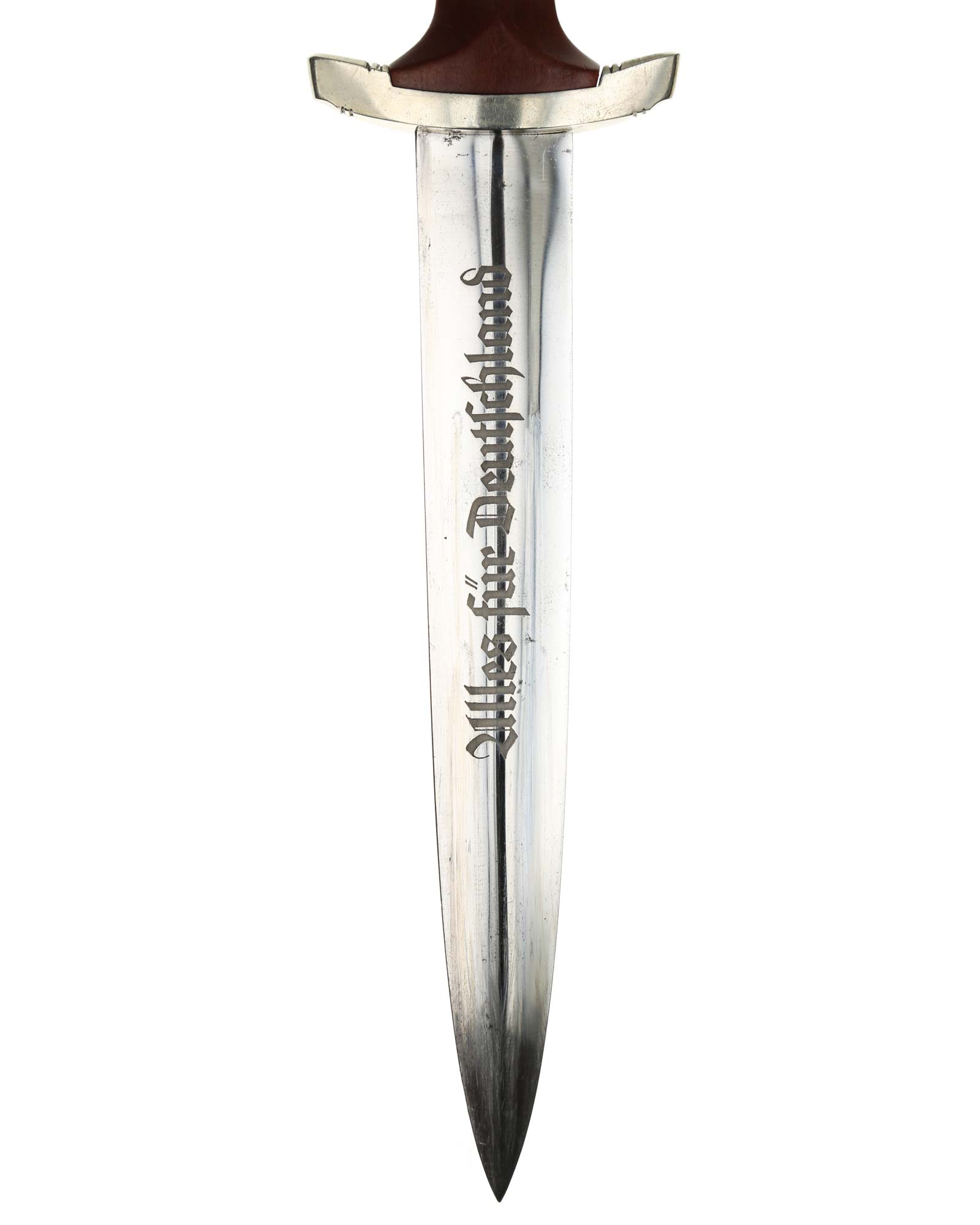 Klinge: Die Klinge ist blank, auf der Vorderseite der Klinge befindet sich die SA Devise, mit der Inschrift: Alles für Deutschland, diese ist tief und zackig. Auf der Rückseite befindet sich das Herstellerlogo Carl Lütters & Cie. (Löwenwerk) Solingen). Die Klingenschultern passen perfekt zu der unteren Parierstange.