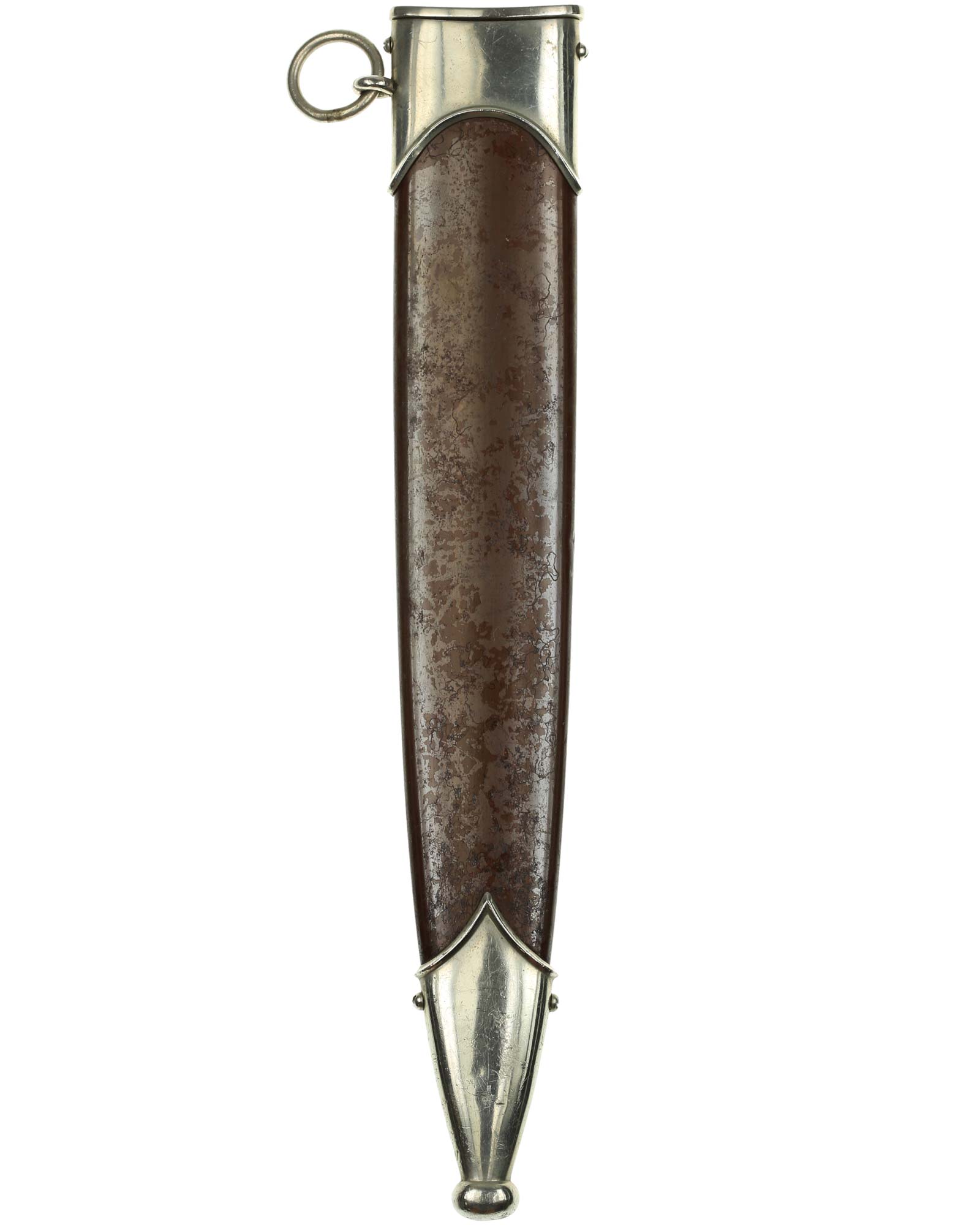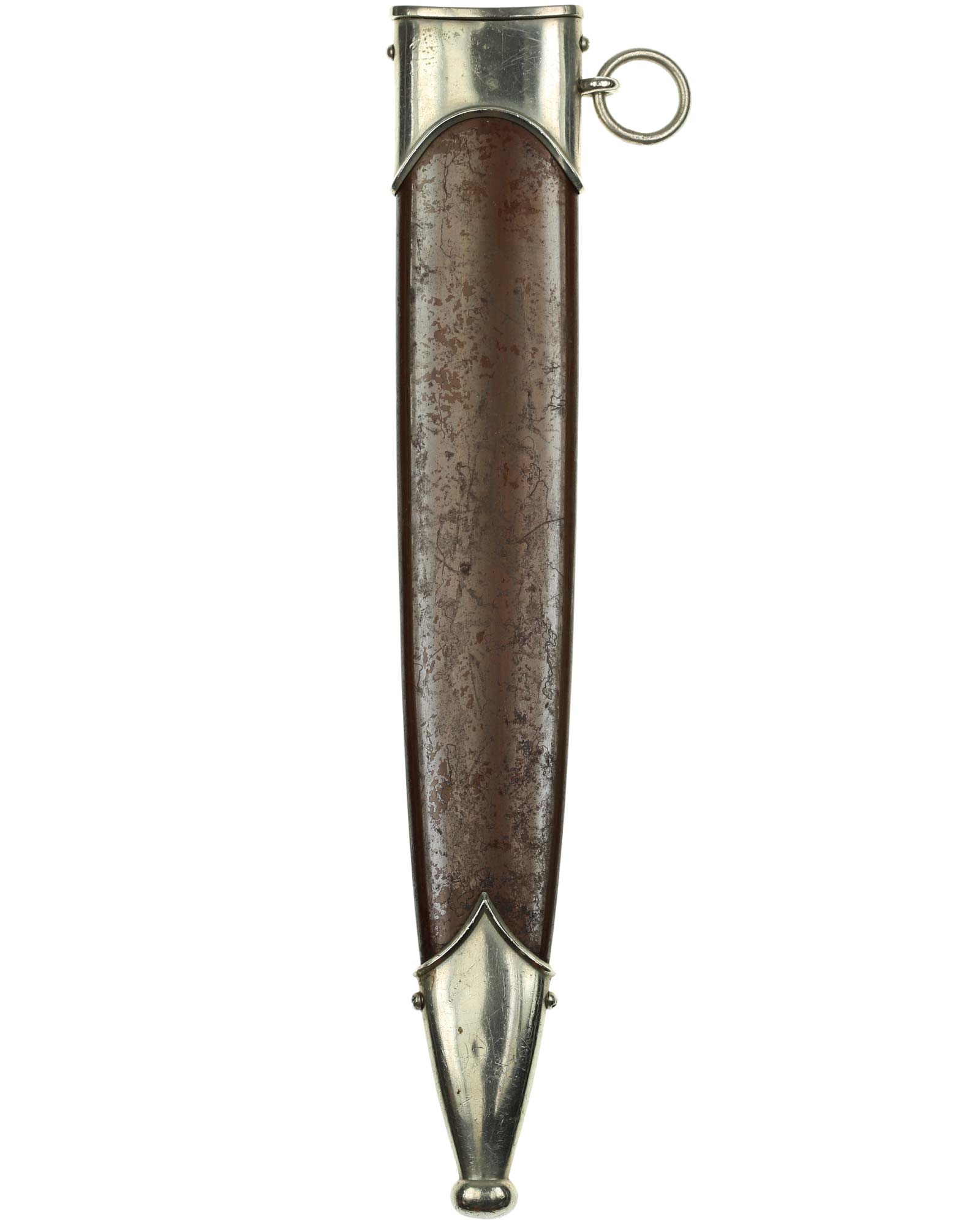 Scheide: Die Scheide ist aus Eisen und mit brauner Brünierung. Die Scheide ist gerade ohne Dellen oder Beulen. Die beiden Scheidenbeschläge sind aus vernickeltem Stahlblech. Die Beschläge werden mit jeweils zwei Schräubchen seitlich gehalten. Am oberen Beschlag befindet sich der Ring für das Tragegehänge.