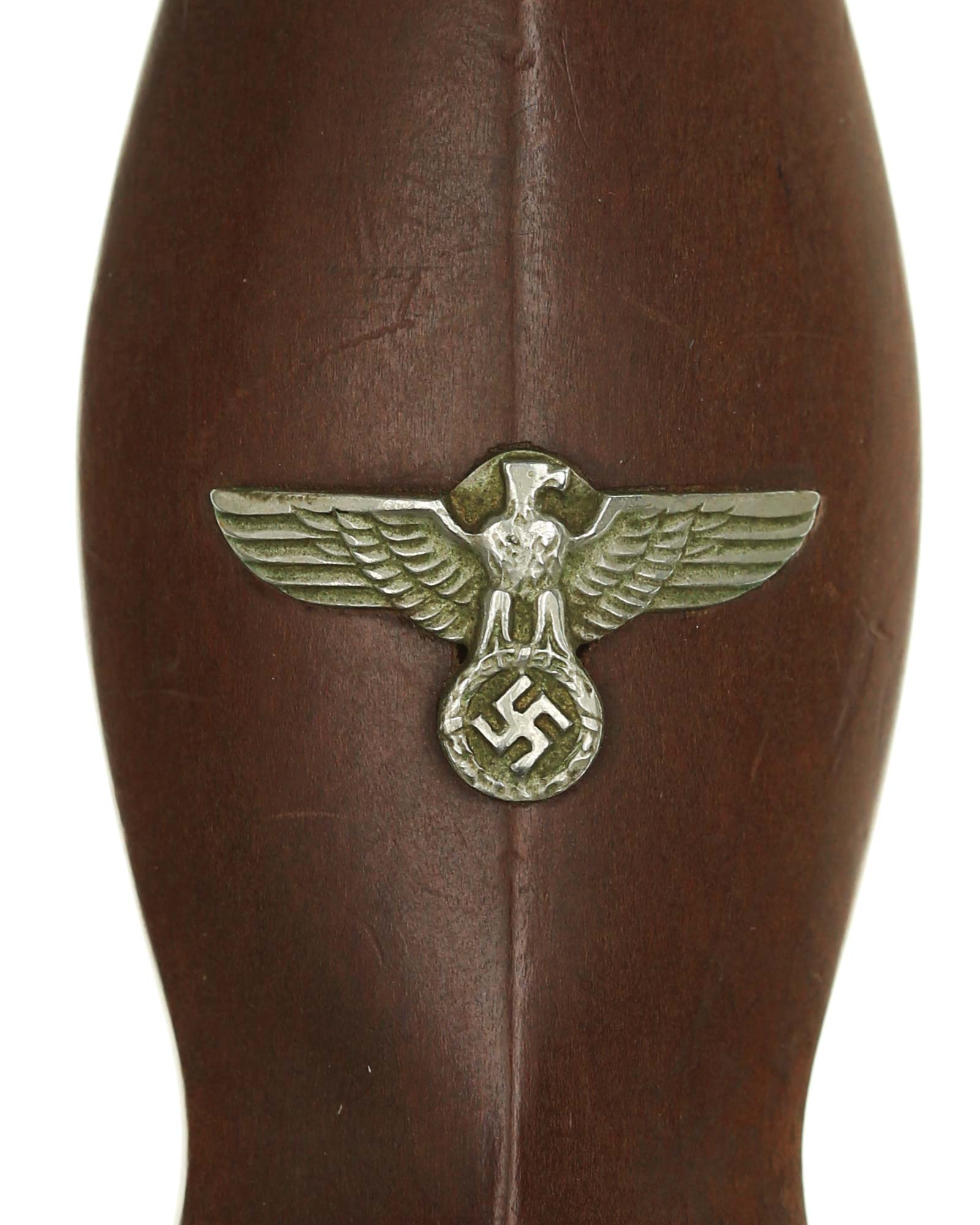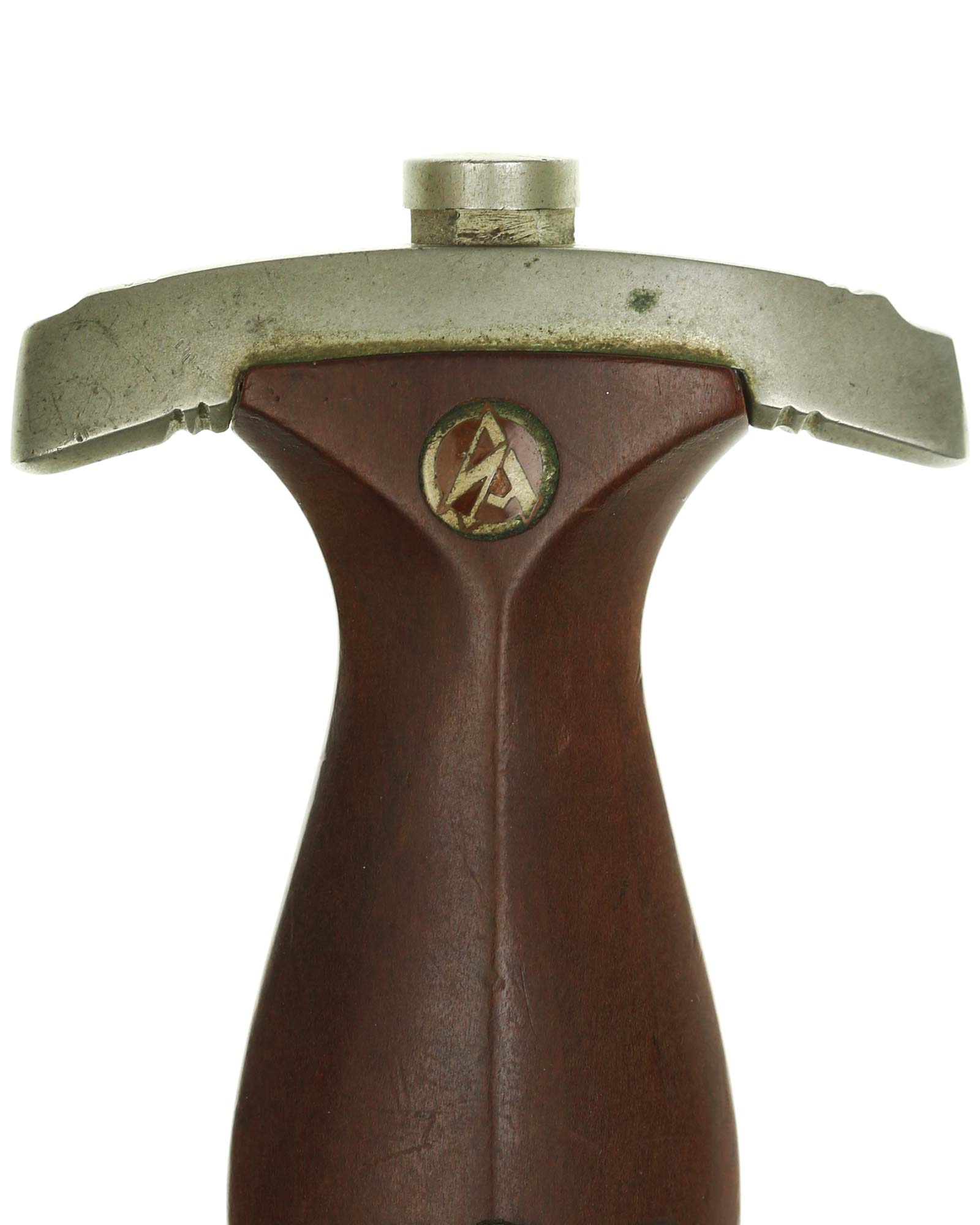 Griff: Brauner Holzgriff, mit Hoheitsadler im Griff, darüber befindet sich das emaillierte SA-Emblem, diese sind innen geklammert. Beide Parierstangen sind aus Nickel. Untere Parierstange mit Reichsgau Stempel «Nm» Nordmark.