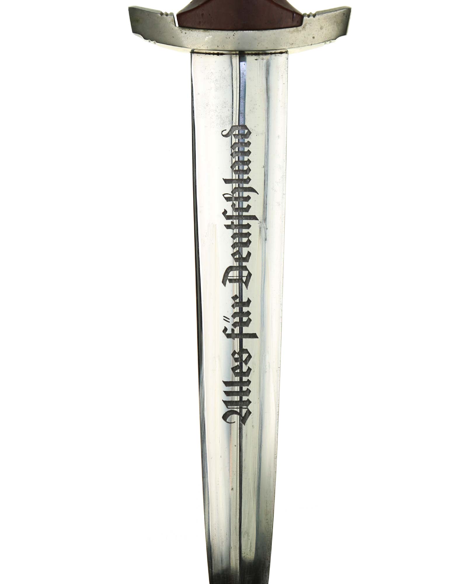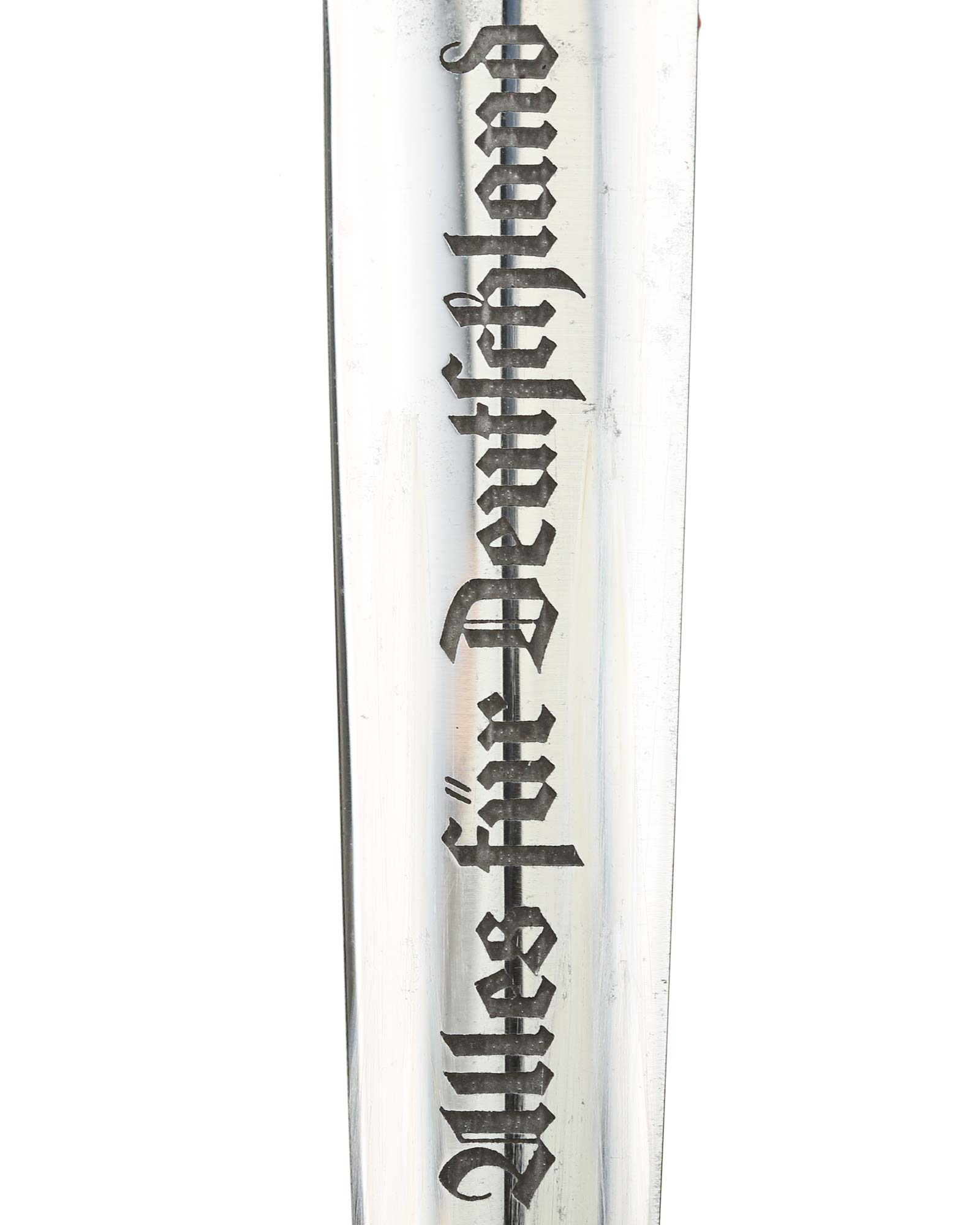 Klinge: Die Klinge ist spiegelblank im Zustand 1, sog. "Crossgrain" ist vorhanden. Auf der Vorderseite der Klinge befindet sich die SA Devise, mit der Inschrift: Alles für Deutschland, diese ist tief und zackig. Auf der Rückseite befindet sich das Herstellerlogo Carl Grah Solingen-Ohligs. Die Klingenschultern passen perfekt zu der unteren Parierstange.
