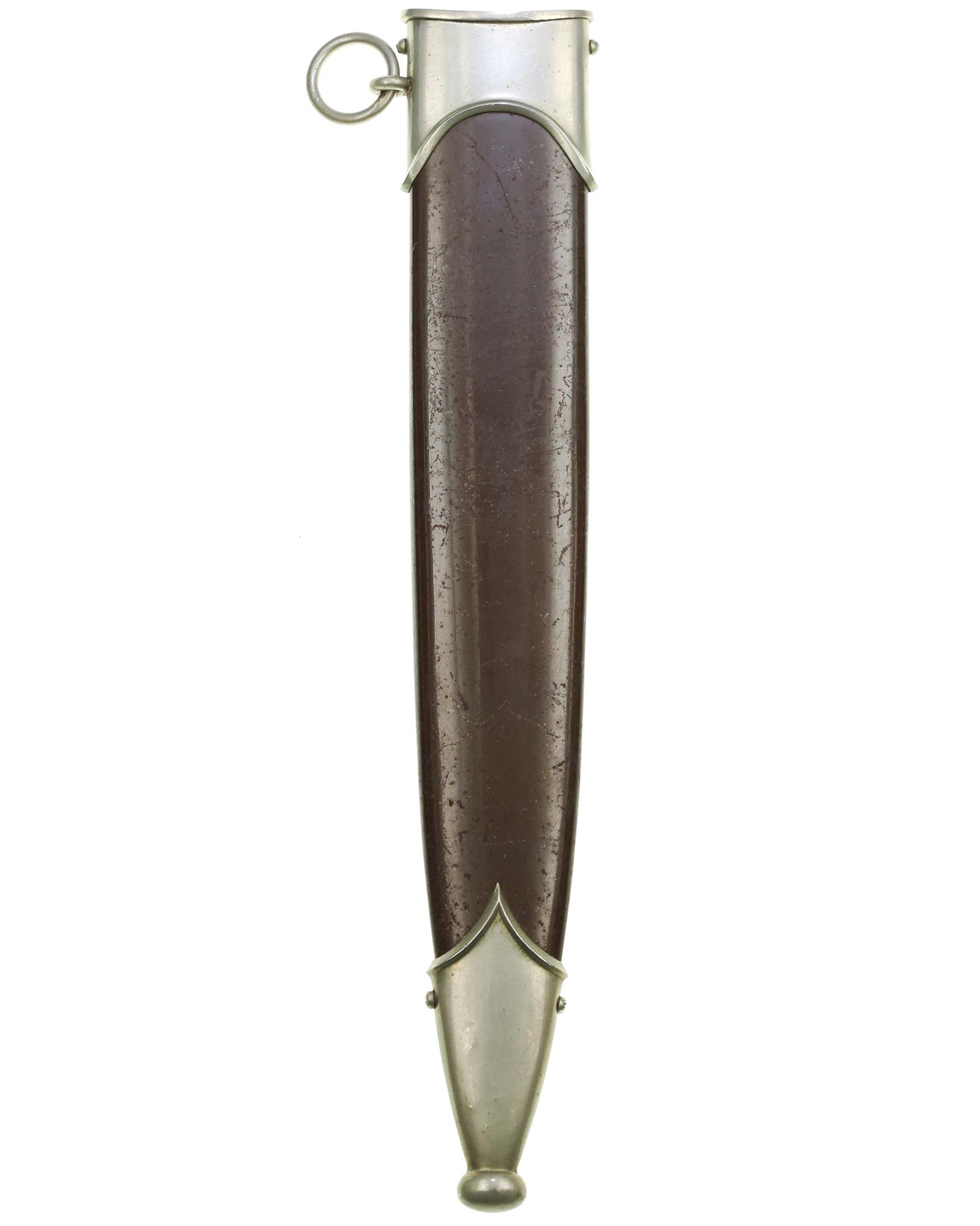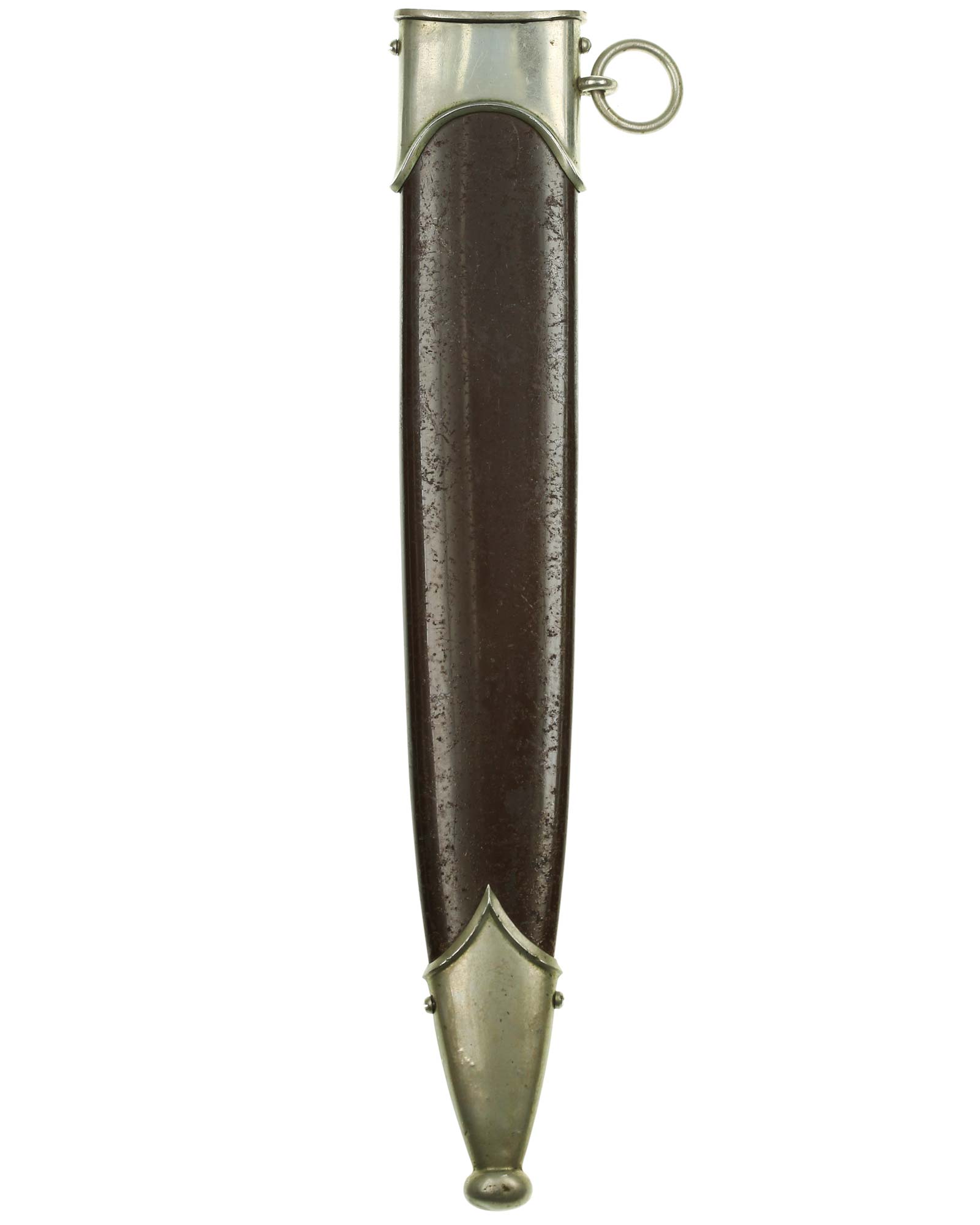 Scheide: Die Scheide ist aus Eisen und mit brauner Brünierung. Die Scheide ist gerade ohne Dellen oder Beulen. Die beiden Scheidenbeschläge sind aus vernickeltem Stahlblech. Die Beschläge werden mit jeweils zwei Schräubchen seitlich gehalten. Am oberen Beschlag befindet sich der Ring für das Tragegehänge.