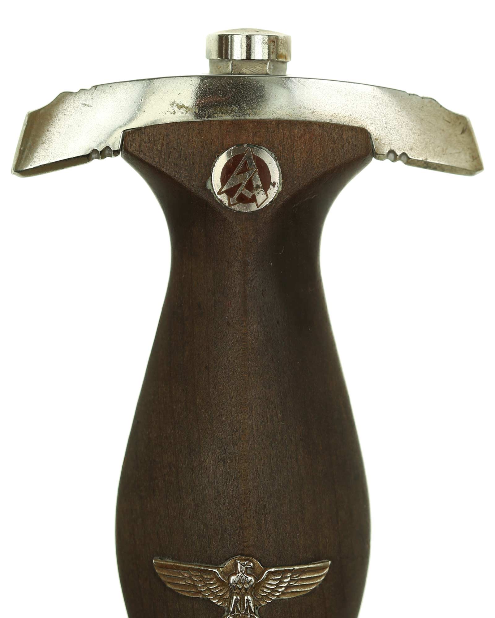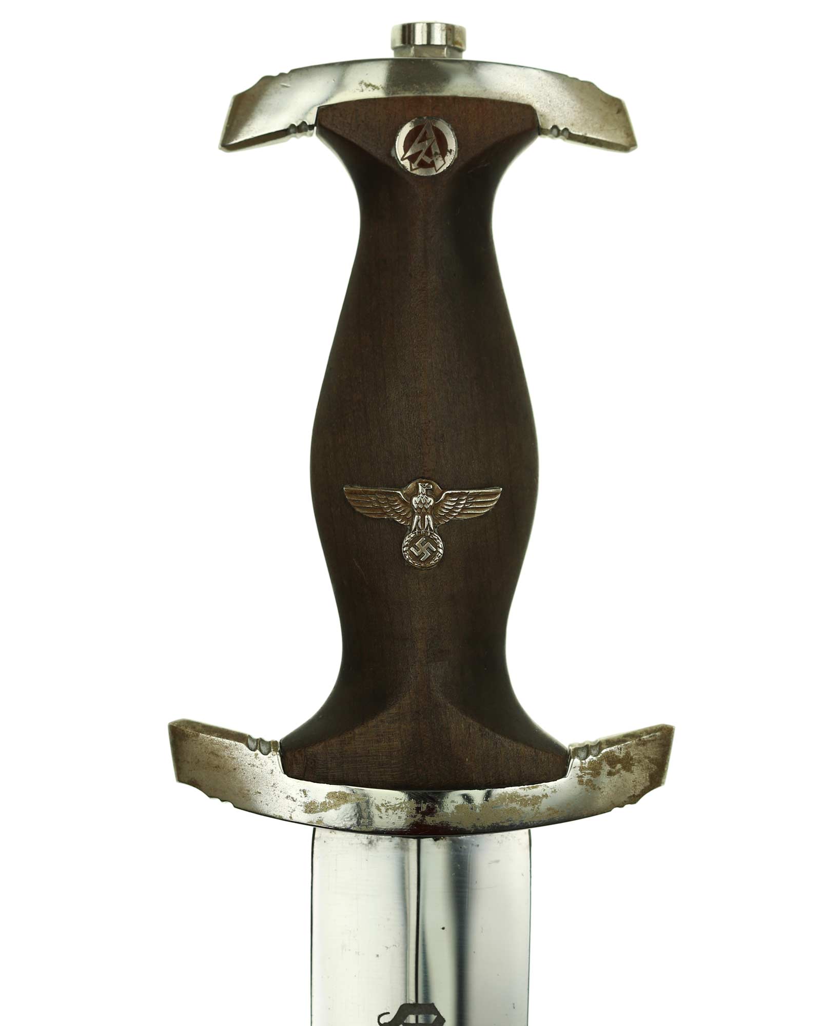 Griff: Brauner Holzgriff, mit Hoheitsadler im Griff, darüber befindet sich das emaillierte SA-Emblem, diese sind innen geklammert. Beide Parierstangen sind aus Nickel. Untere Parierstange mit Reichsgau Stempel «Ha» Hansa.