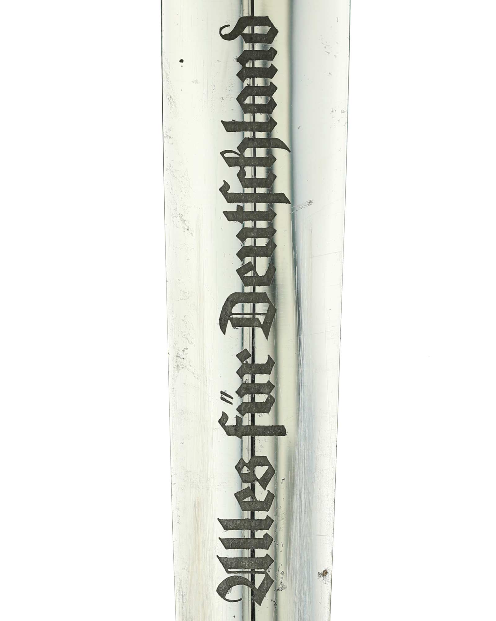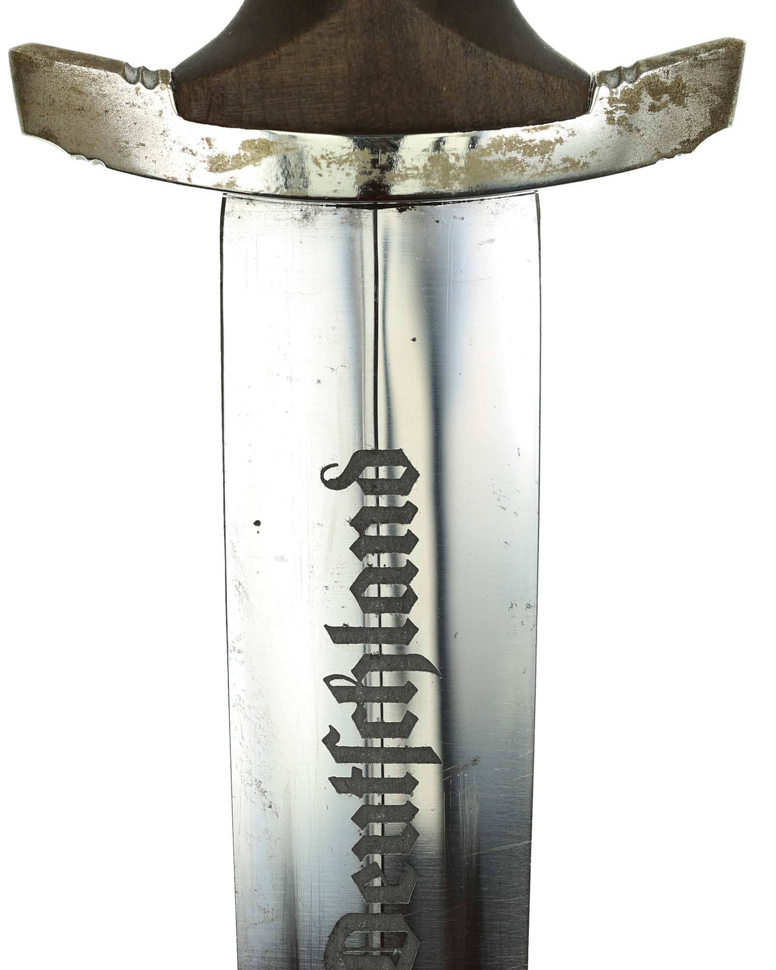 Klinge: Die Klinge ist spiegelbalnk, ohne Rost und Kerben, sog. "Crossgrain" ist zu 100% vorhanden. Auf der Vorderseite der Klinge befindet sich die SA Devise, mit der Inschrift: Alles für Deutschland, diese ist tief und zackig. Auf der Rückseite befindet sich das Herstellerlogo C.&R. Linder Solingen-Weyer. Die Klingenschultern passen perfekt zu der unteren Parierstange.