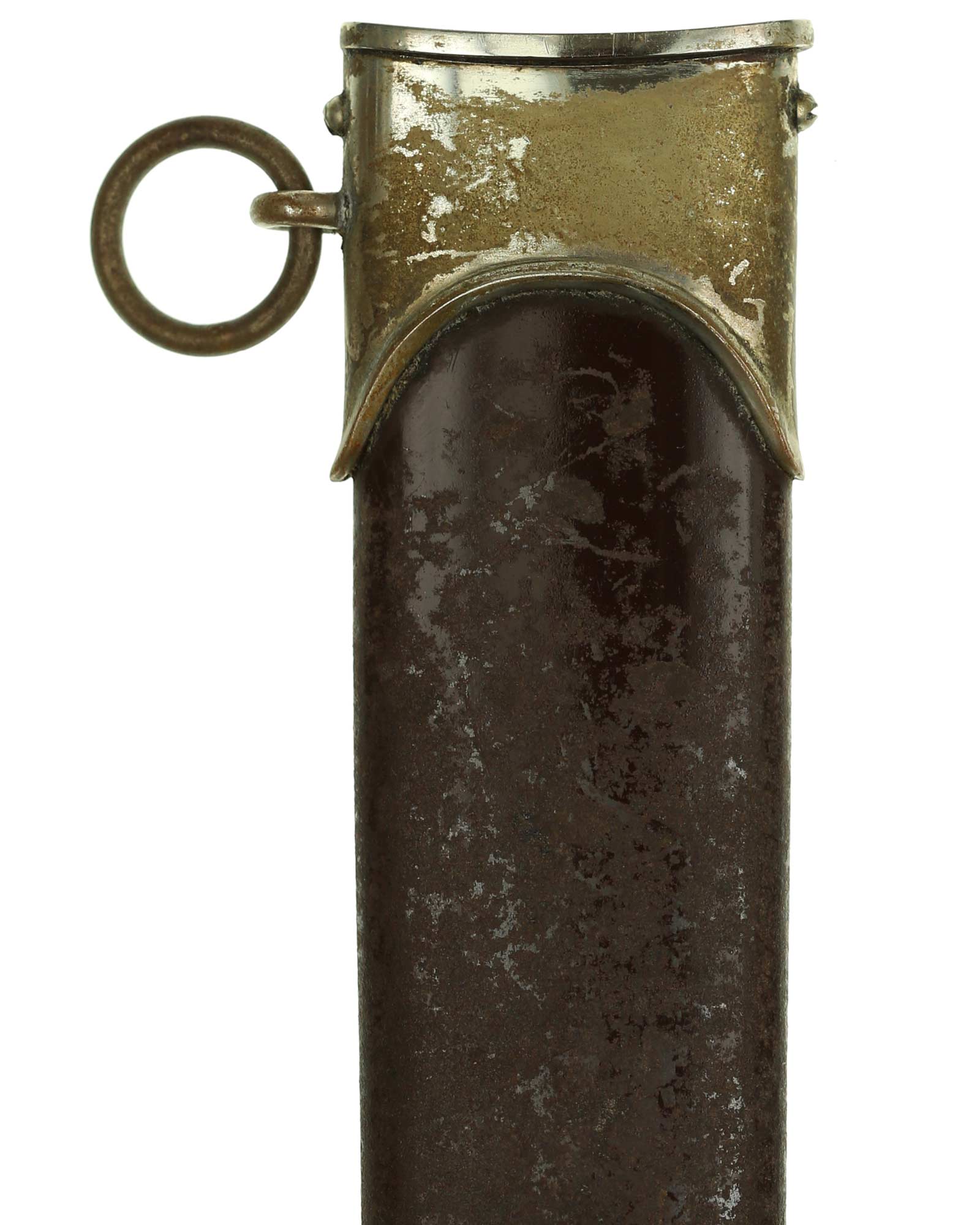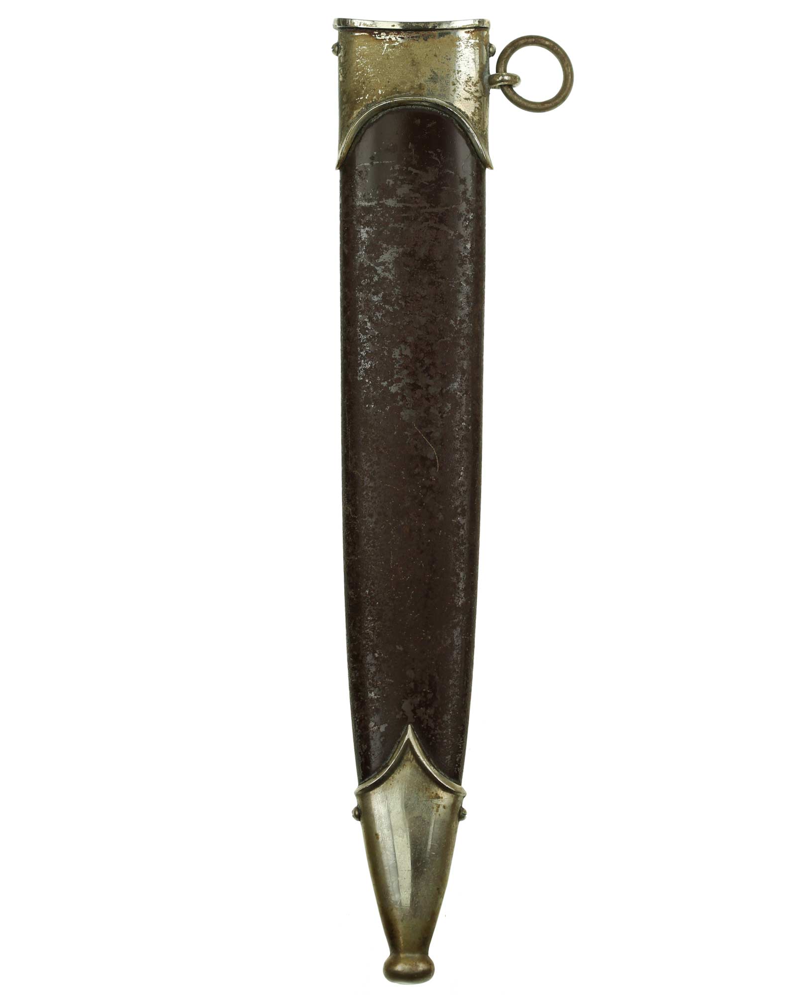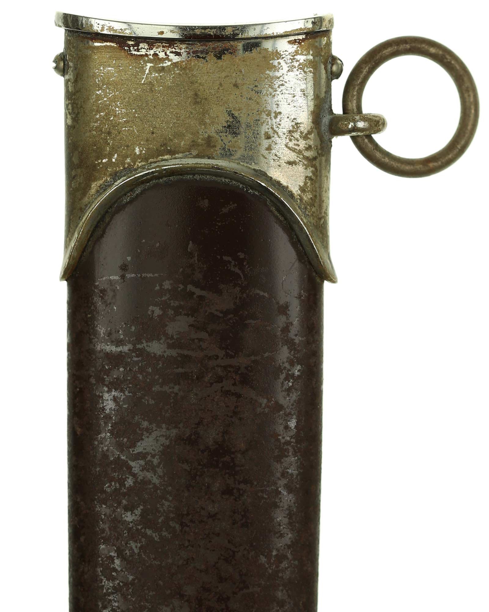 Scheide: Die Scheide ist aus Eisen und mit brauner Brünierung. Die Scheide ist gerade ohne Dellen oder Beulen. Lediglich der untere Beschlag ist leicht eingedrückt. Die beiden Scheidenbeschläge sind aus vernickeltem Stahlblech. Die Beschläge werden mit jeweils zwei Schräubchen seitlich gehalten. Am oberen Beschlag befindet sich der Ring für das Tragegehänge.