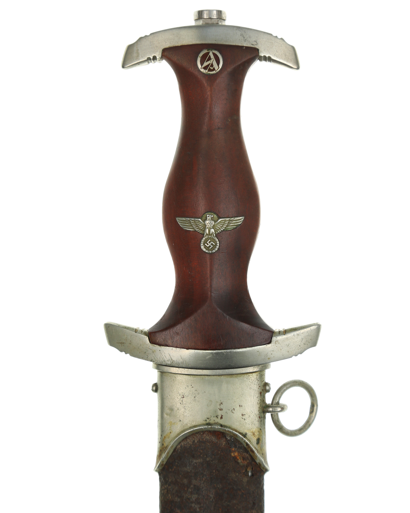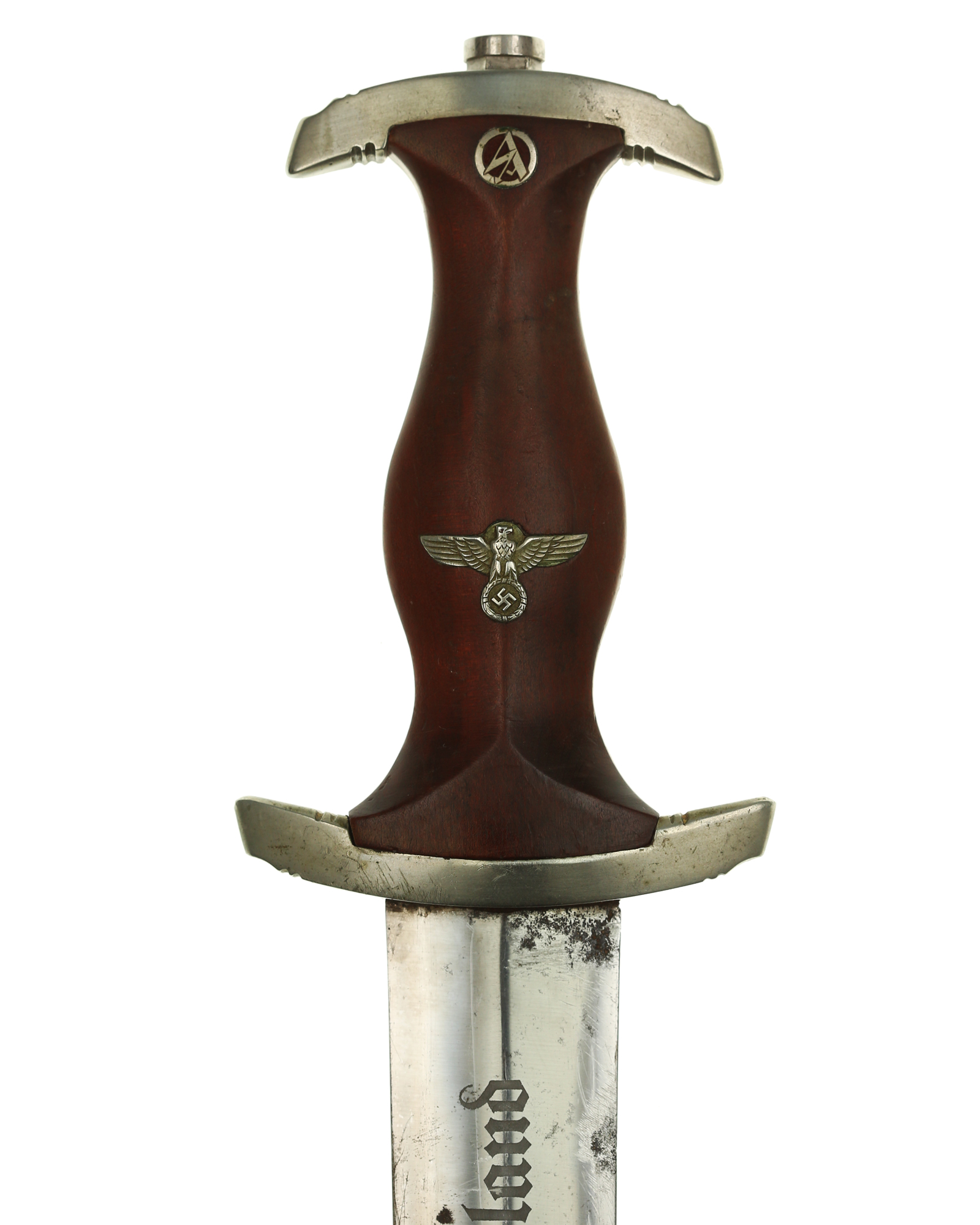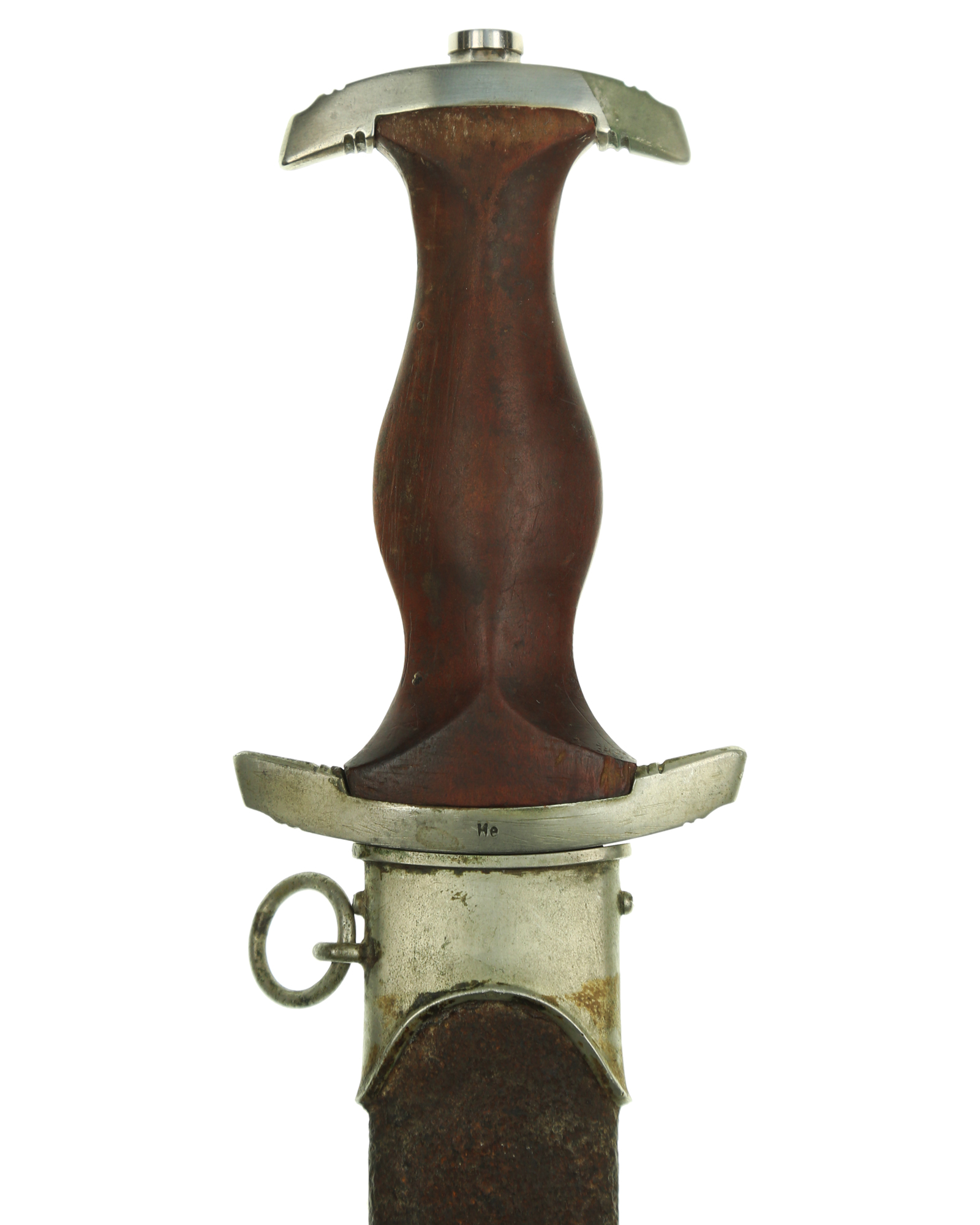 Griff: Brauner Holzgriff, mit Hoheitsadler im Griff, darüber befindet sich das emaillierte SA-Emblem, diese sind innen geklammert. Beide Parierstangen sind aus Nickel. Untere Parierstange mit Reichsgau Stempel «He».