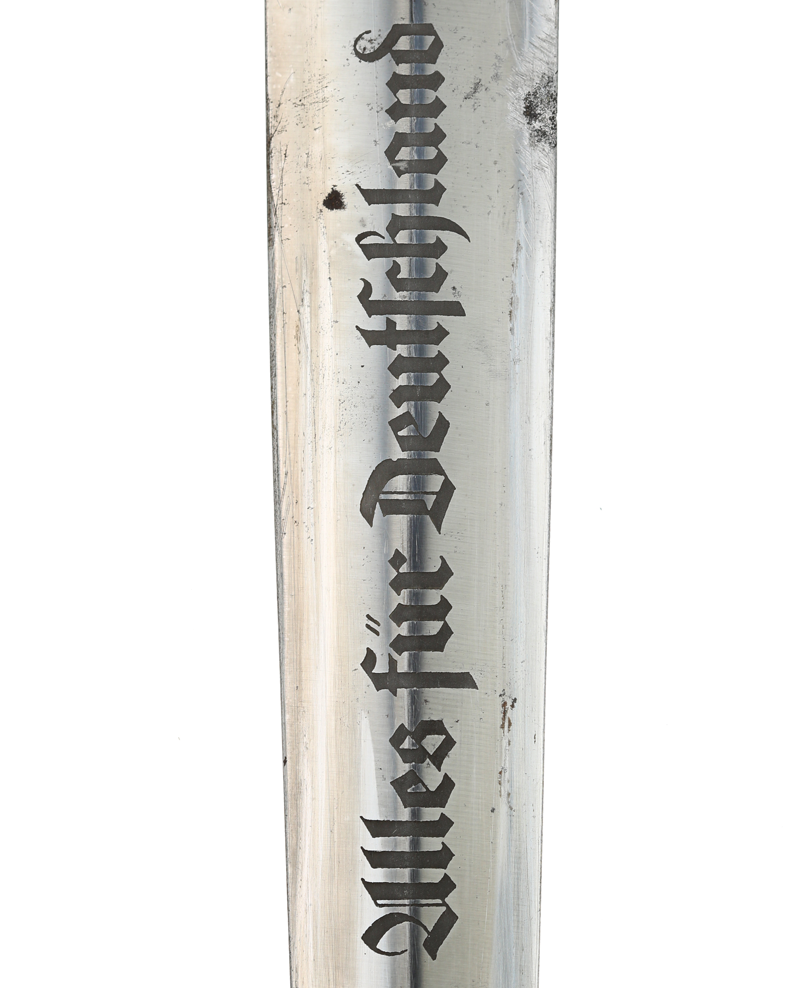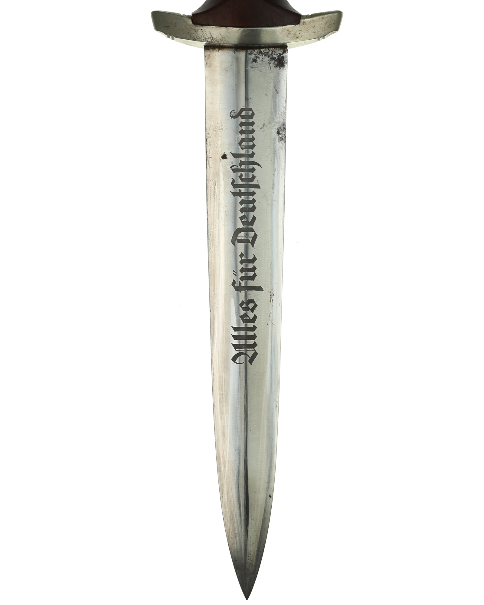 Klinge: Die Klinge ist blank, sog. "Crossgrain" ist zu 100% vorhanden. Auf der Vorderseite der Klinge befindet sich die SA Devise, mit der Inschrift: Alles für Deutschland, diese ist tief und zackig. Auf der Rückseite befindet sich das Herstellerlogo Ed. Wüsthof Solingen. Die Klingenschultern passen perfekt zu der unteren Parierstange.