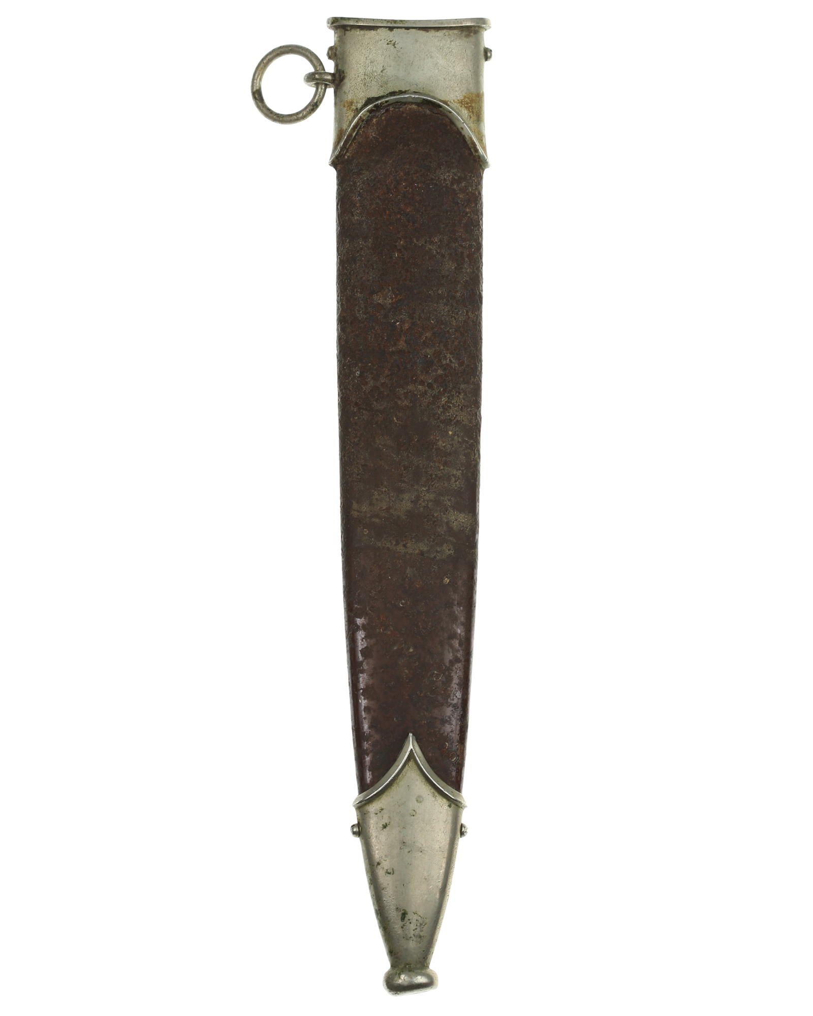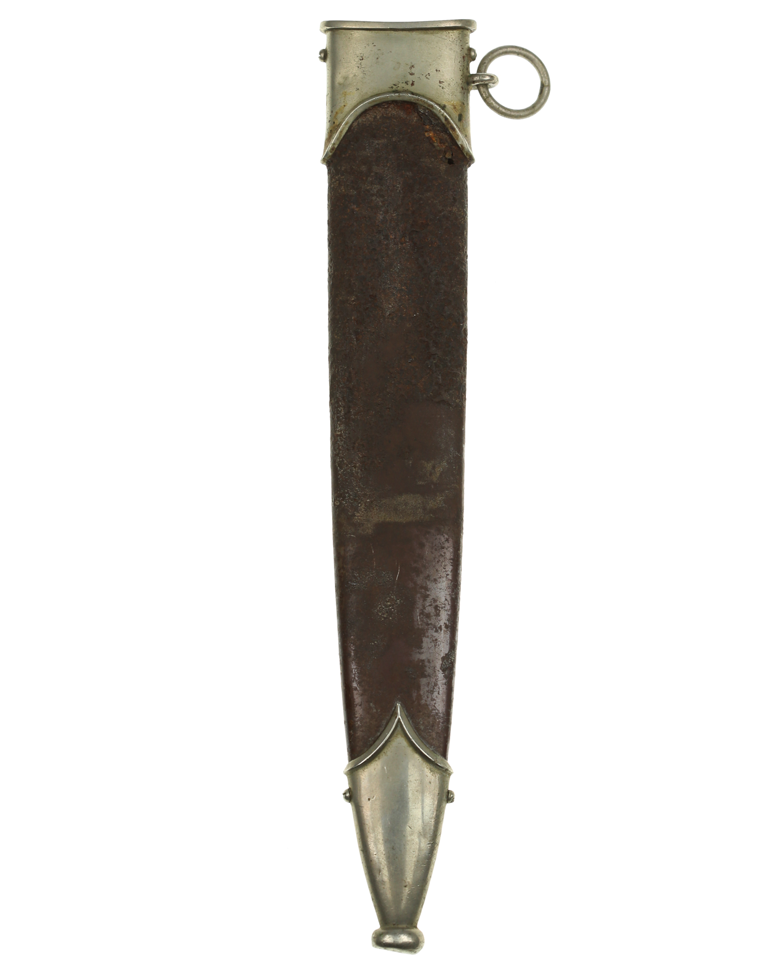Scheide: Die Scheide ist aus Eisen und mit brauner Brünierung, die Scheide ist komplett unbearbeitet. Die beiden Scheidenbeschläge sind aus vernickeltem Stahlblech. Die Beschläge werden mit jeweils zwei Schräubchen seitlich gehalten. Am oberen Beschlag befindet sich der Ring für das Tragegehänge.