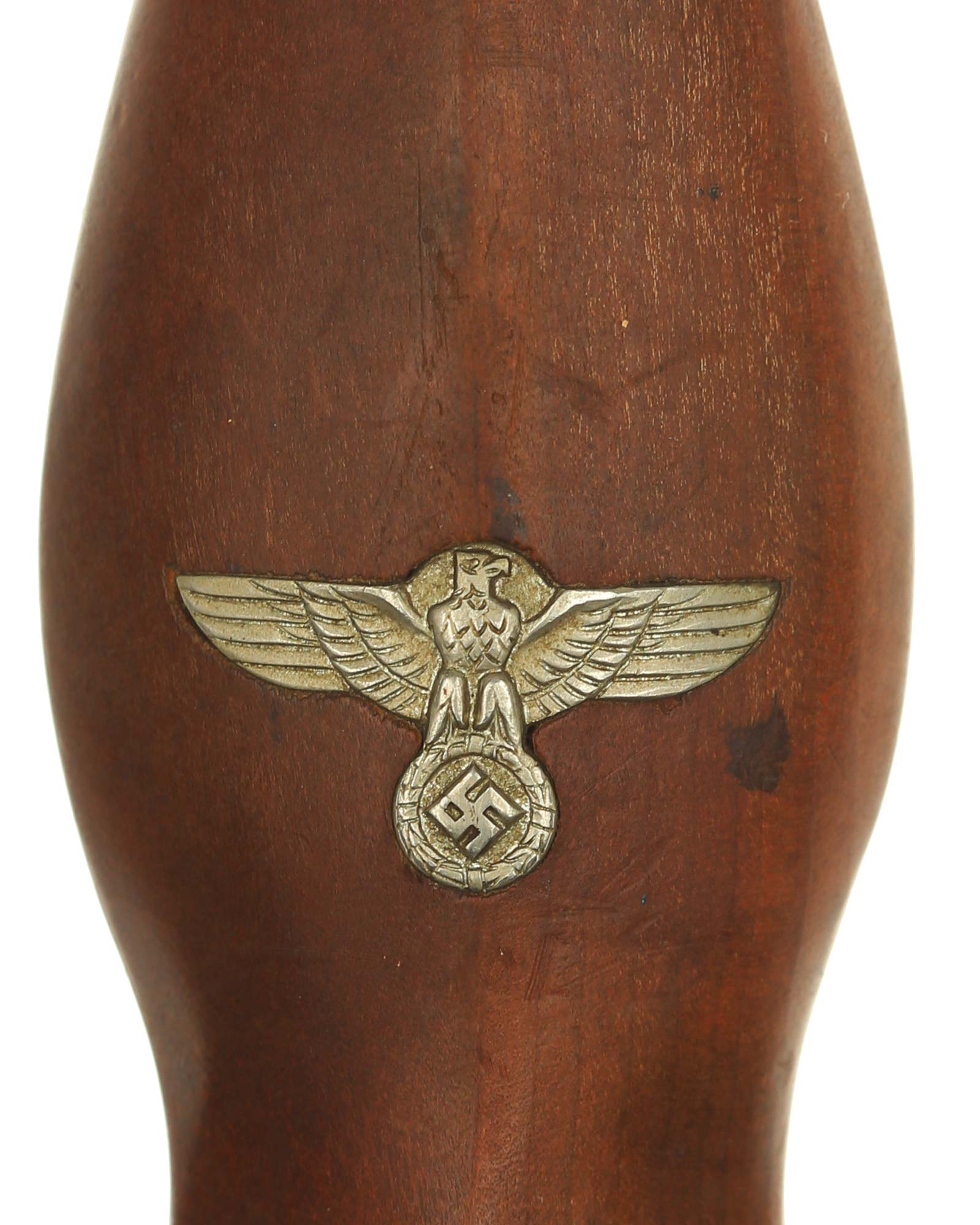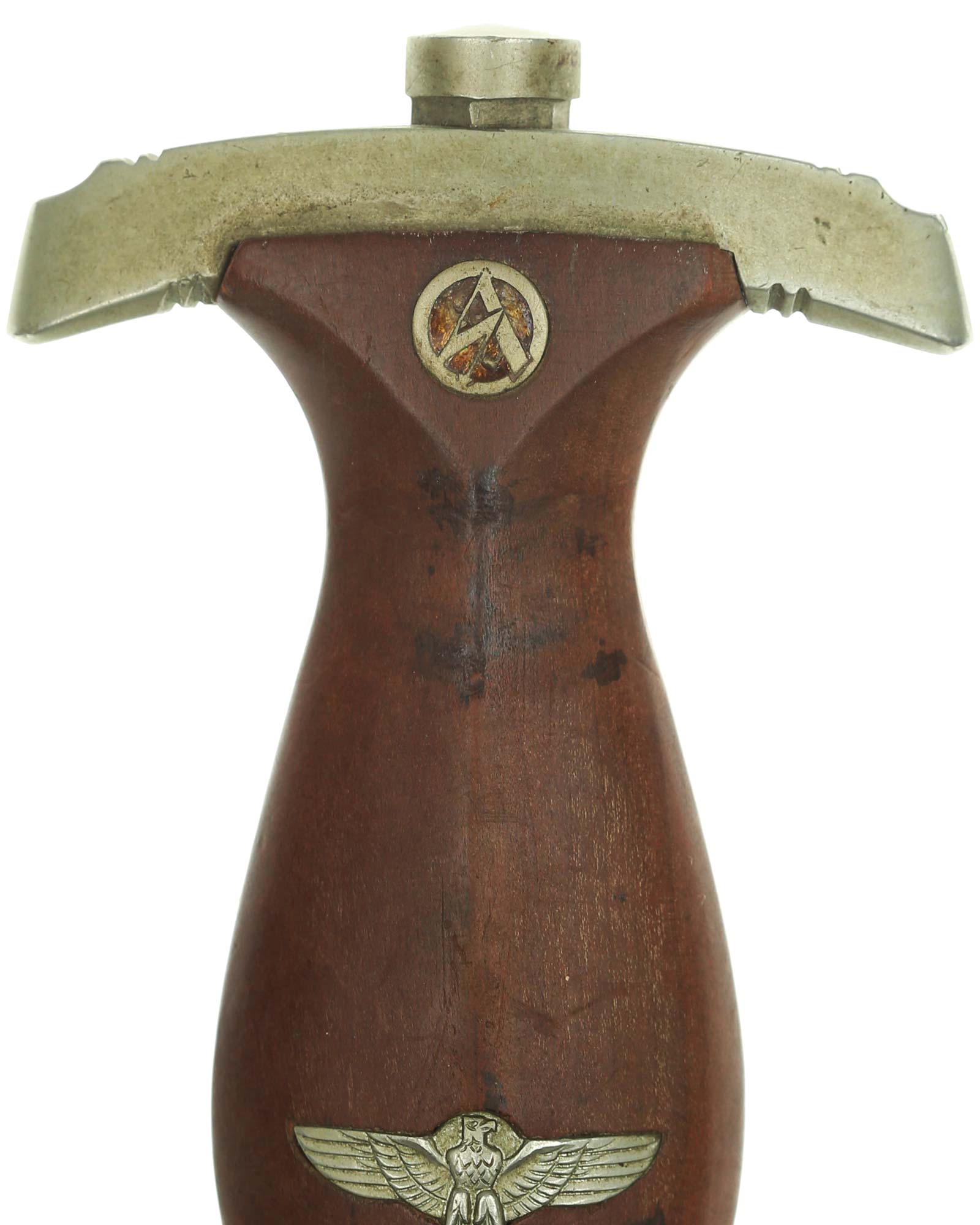 Griff: Brauner Holzgriff, mit Hoheitsadler im Griff, darüber befindet sich das emaillierte SA-Emblem, diese sind innen geklammert. Beide Parierstangen sind aus Nickel. Untere Parierstange mit GAU Stempel «Nm» Nordmark.