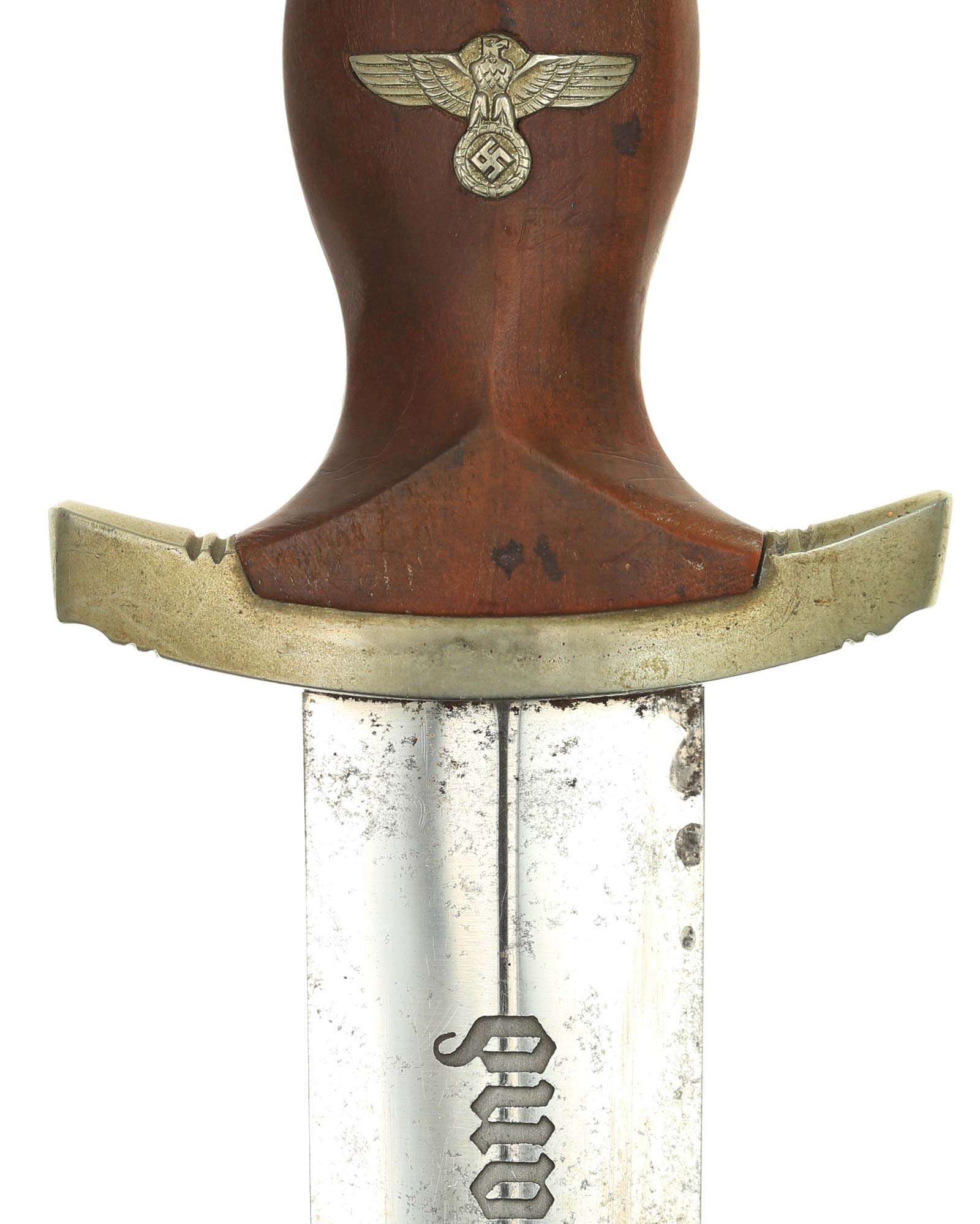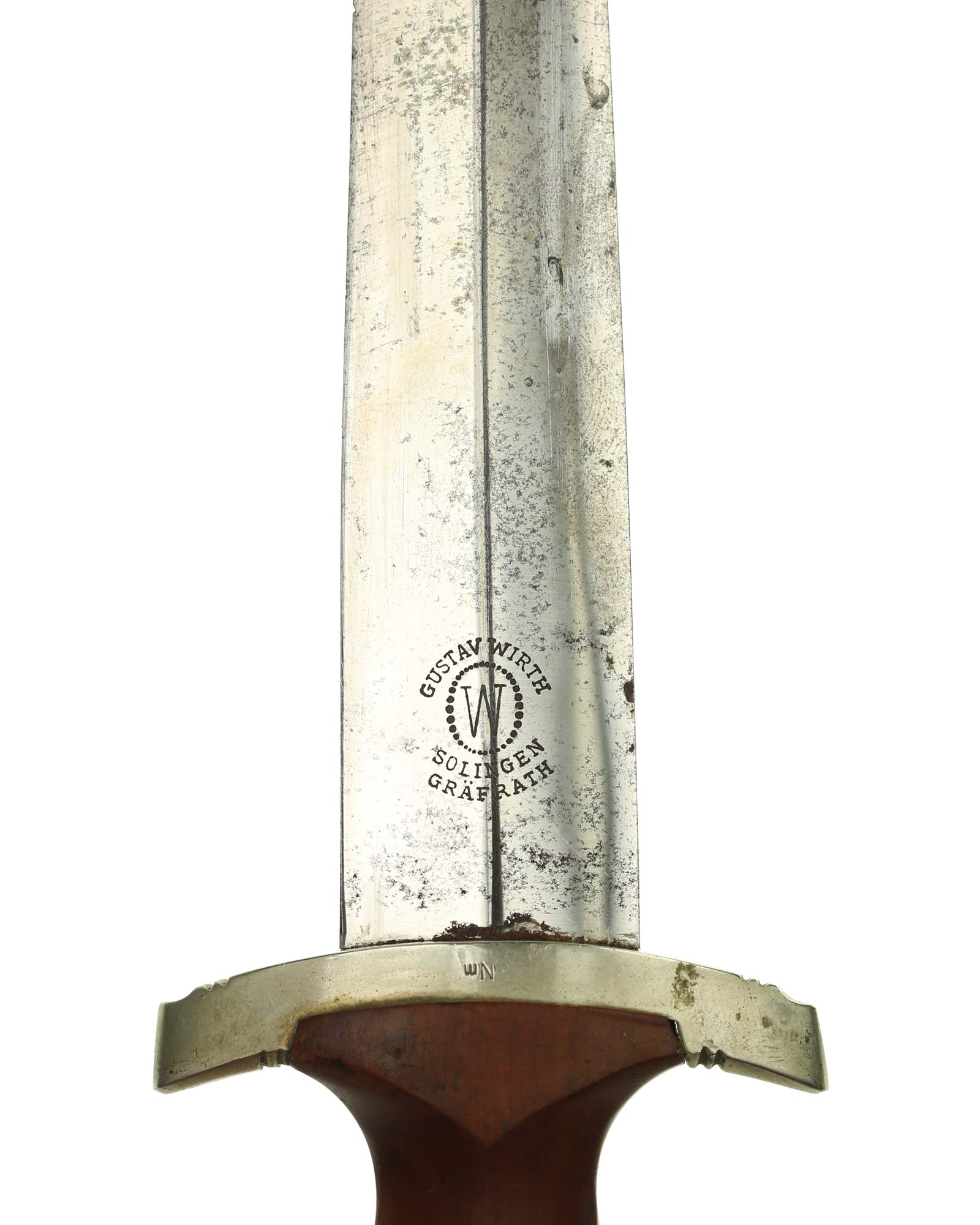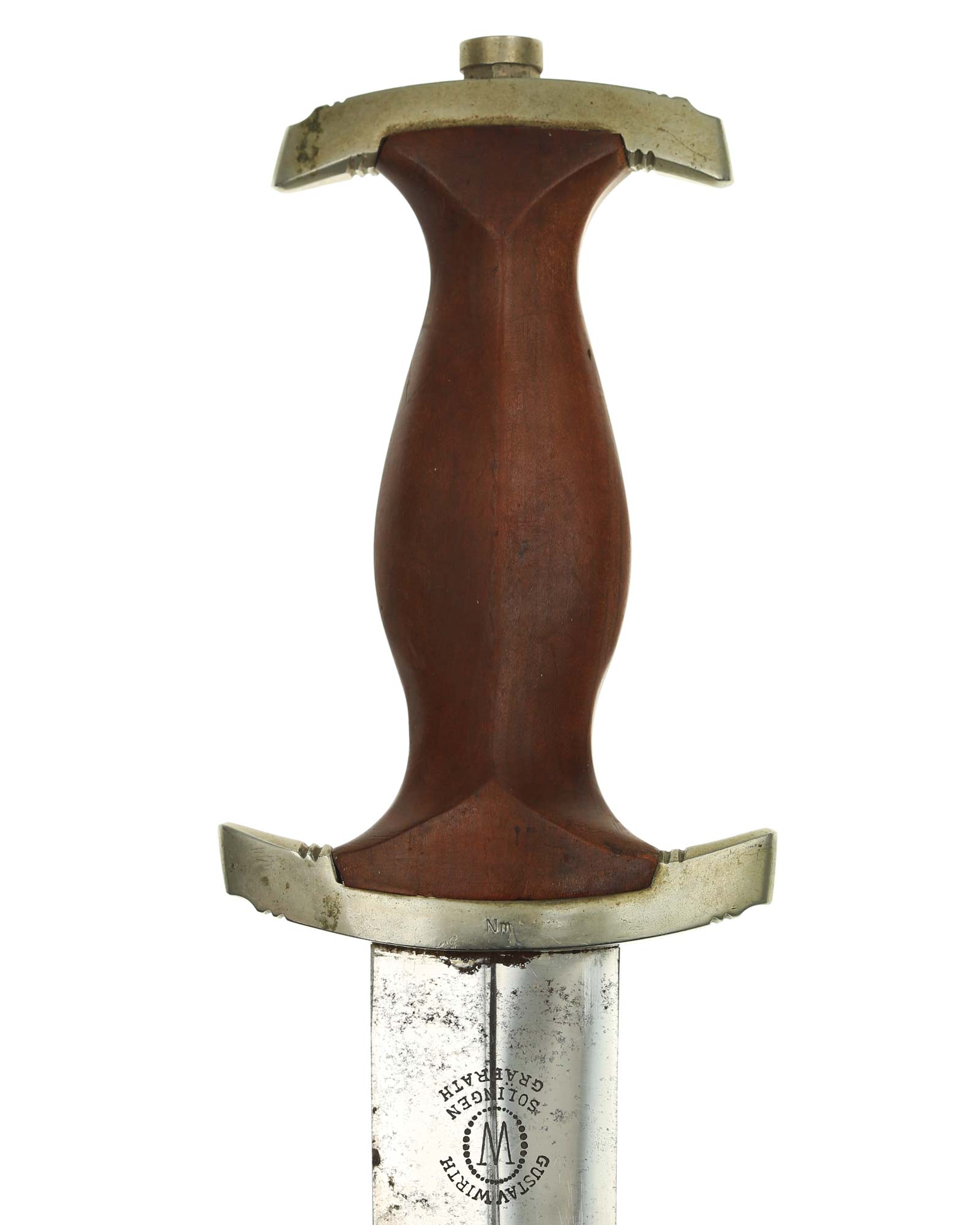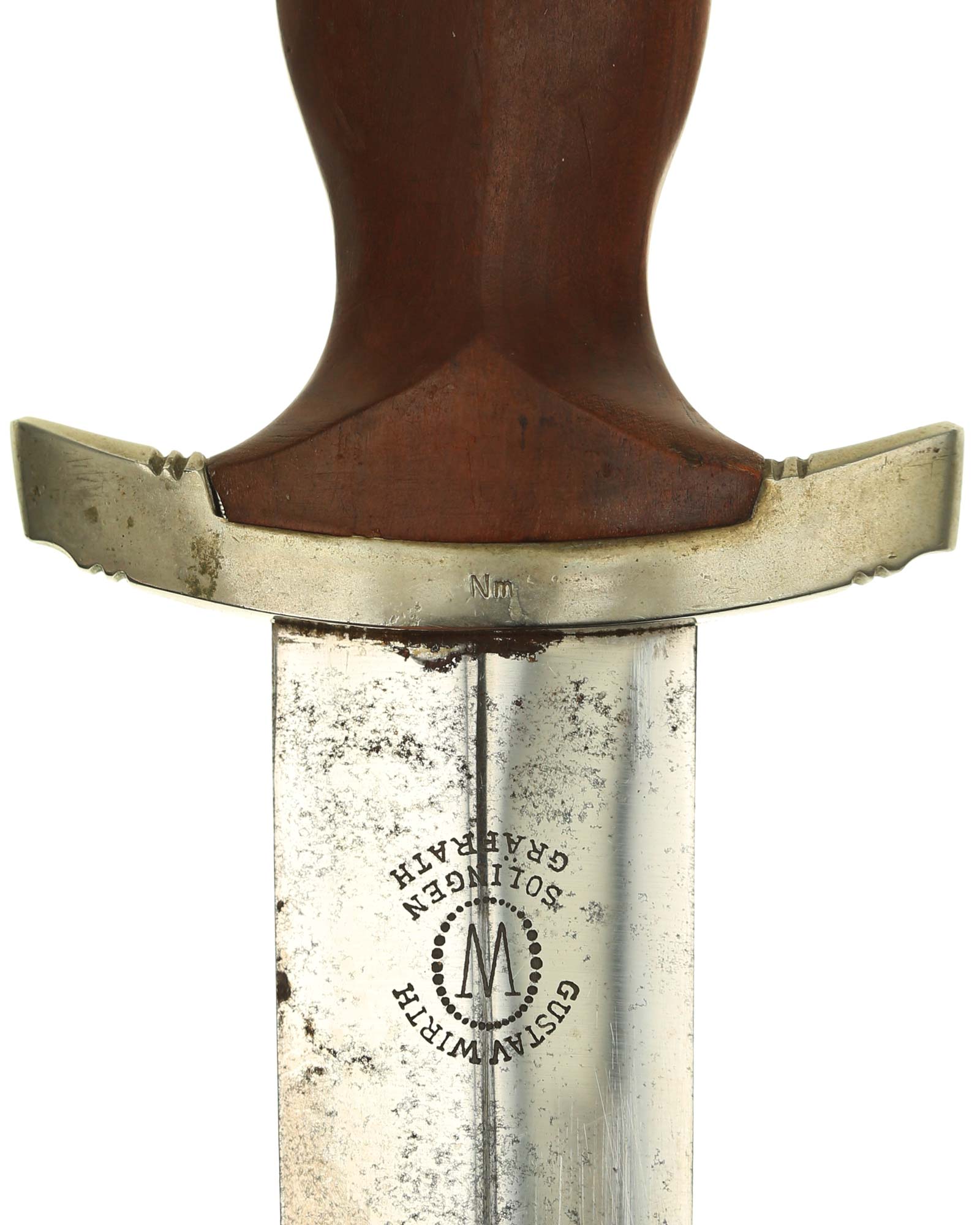 Dienstdolch der Sturmabteilung [SA] in früher Fertigung 1933-1935, mit sehr seltenem Hersteller: Gustav Wirth Solingen-Gräfrath. Untere Parierstange mit passender Gruppenstempelung «Nm» Nordmark.