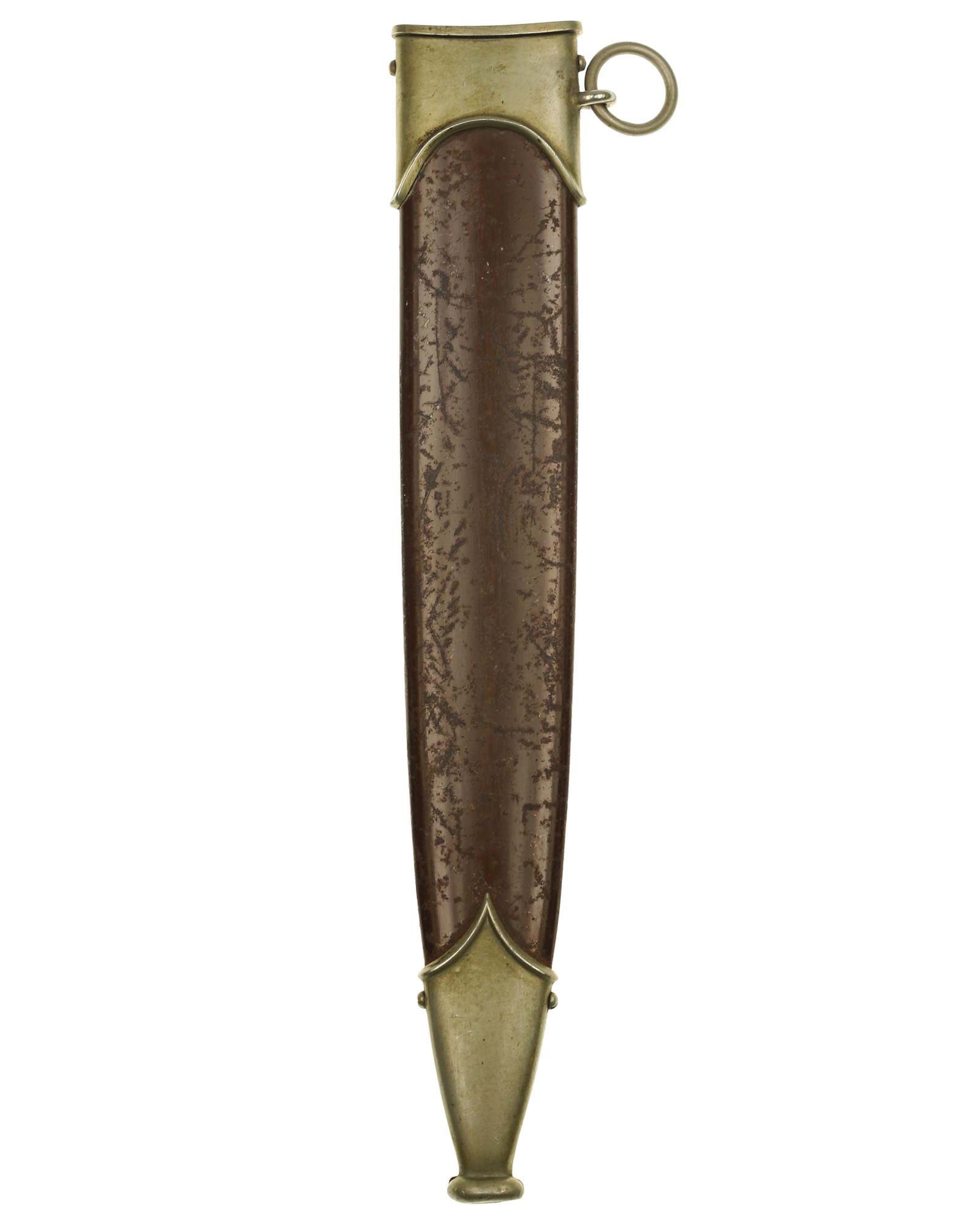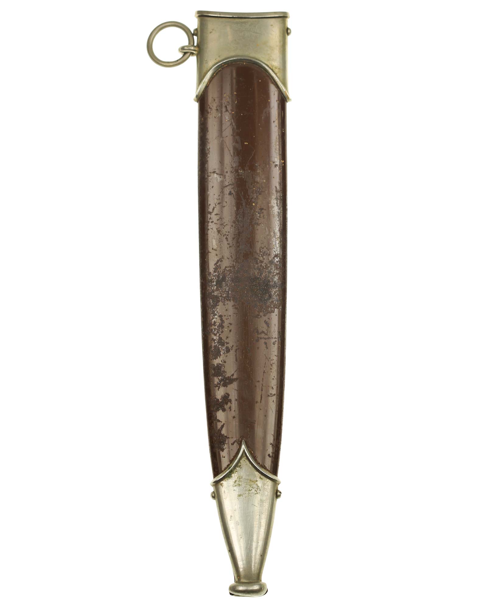 Scheide: Die Scheide ist aus Eisen und mit Originalbrünierung. Die beiden Scheidenbeschläge sind aus vernickeltem Stahlblech. Die Beschläge werden mit jeweils zwei Schräubchen seitlich gehalten. Am oberen Beschlag befindet sich der Ring für das Tragegehänge.