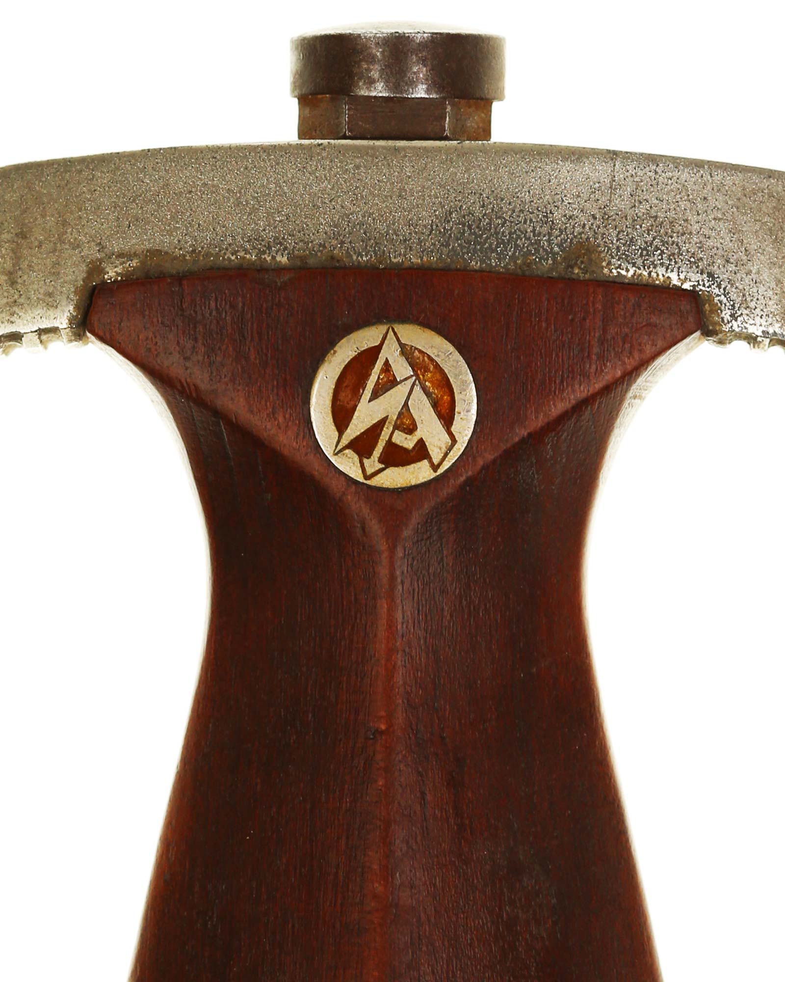 Griff: Brauner Holzgriff, mit Hoheitsadler im Griff, darüber befindet sich das emaillierte SA-Emblem, diese sind innen geklammert. Beide Parierstangen sind aus Nickel.