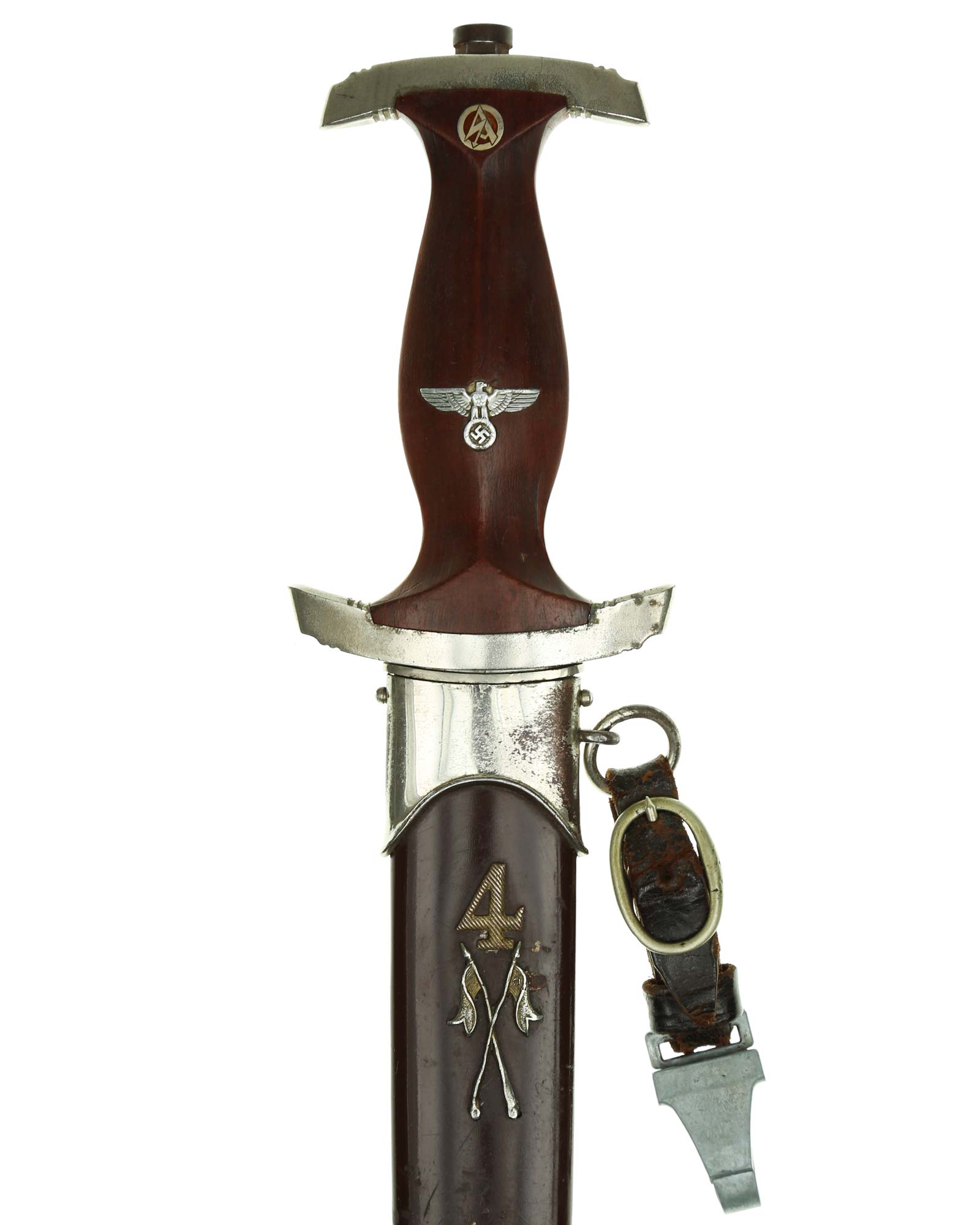 Dienstdolch der Sturmabteilung [SA] in früher Fertigung 1933-1935. Sehr seltener Hersteller auf der Klinge: Eickelnberg & Mack Solingen. Scheide mit Emblem (Fahnen, überkreuzt).
