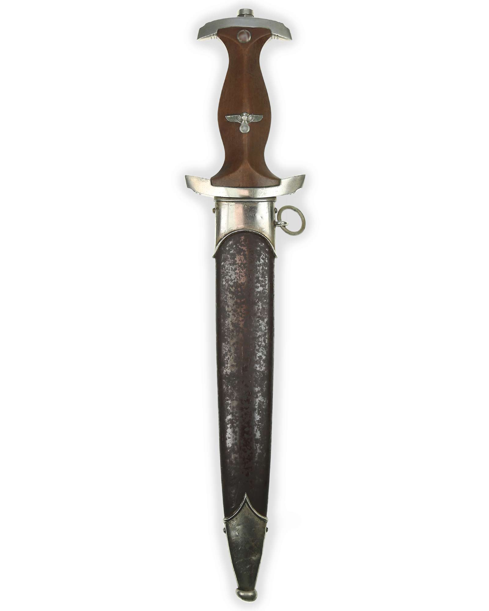 Griff: Heller Holzgriff, der Hoheitsadler im Griff ist in Nickelausführung und mit langem Hals, darüber befindet sich das emaillierte SA-Emblem, diese sind innen geklammert. Beide Parierstangen sind aus Nickel. Die untere Parierstange ist auf der Rückseite mit dem Gruppenstempel BO [Bayrische Ostmark] handgestanzt.