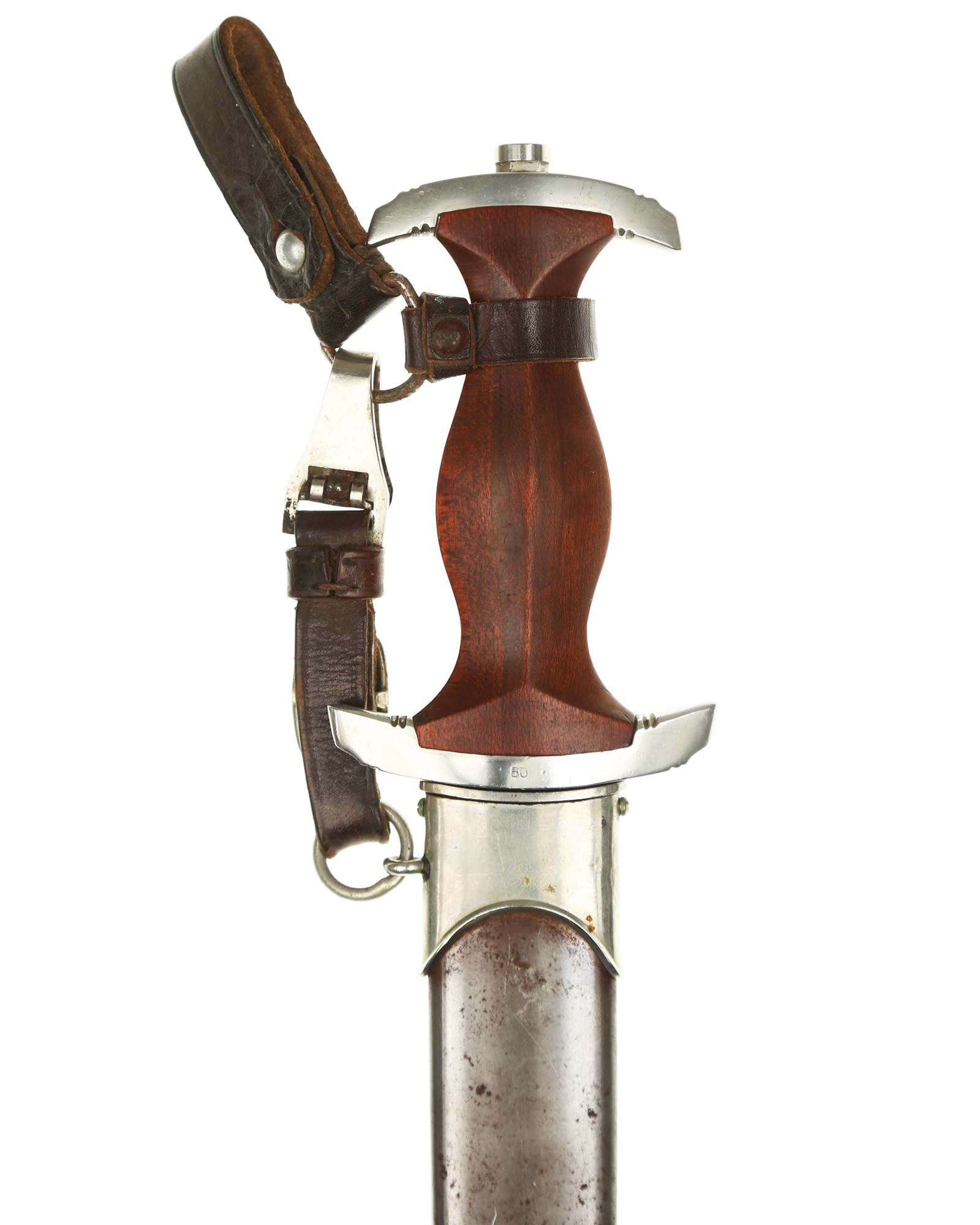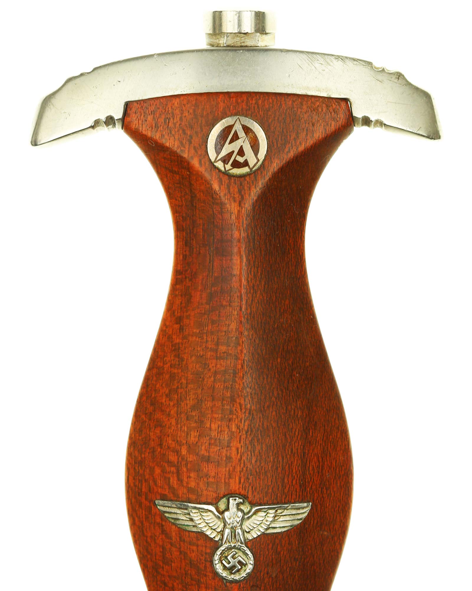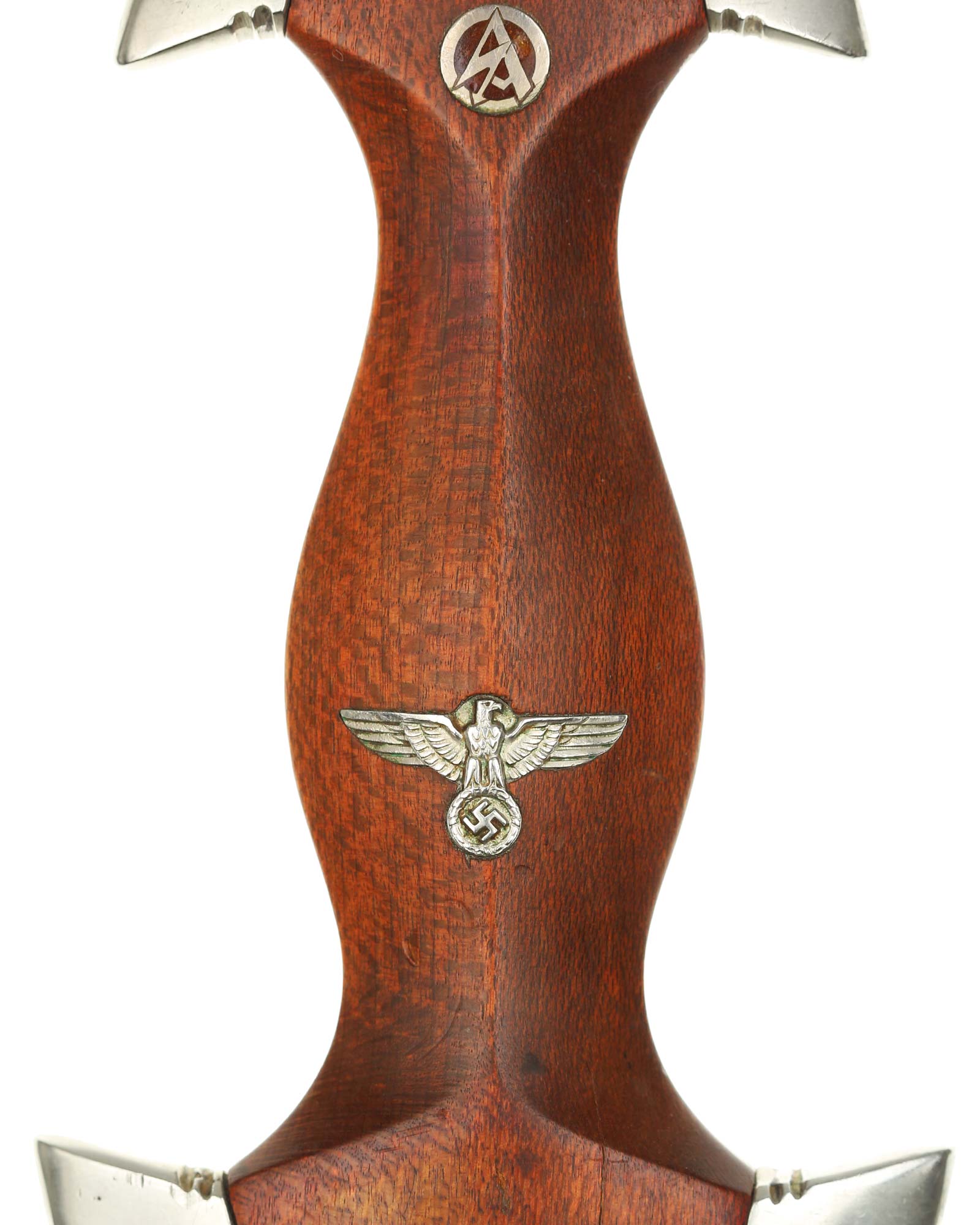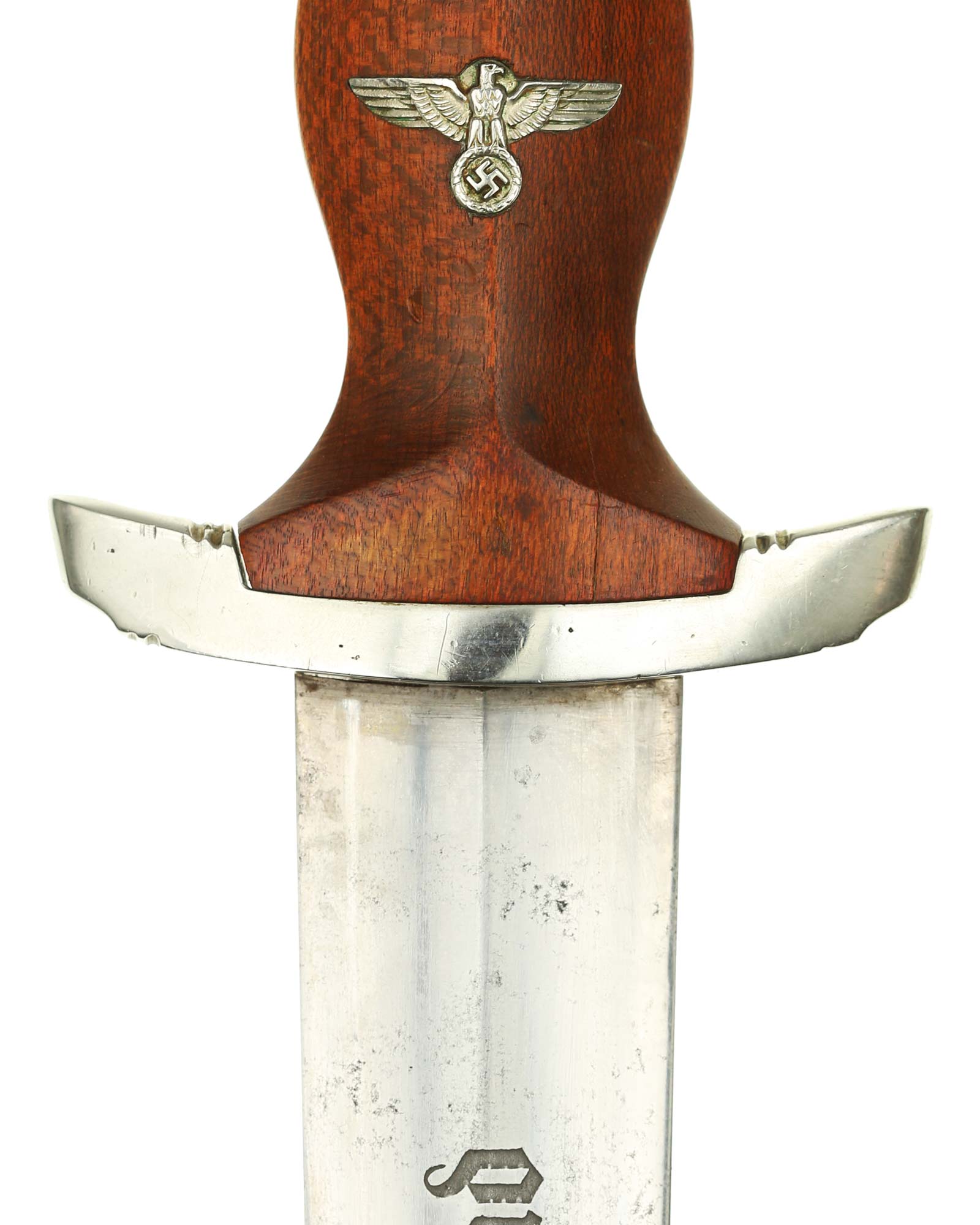 Griff: Heller Holzgriff, der Hoheitsadler im Griff ist in Nickelausführung und mit langem Hals, darüber befindet sich das emaillierte SA-Emblem, diese sind innen geklammert. Beide Parierstangen sind aus Nickel. Die untere Parierstange ist auf der Rückseite mit dem Gruppenstempel BO [Bayrische Ostmark] handgestanzt.