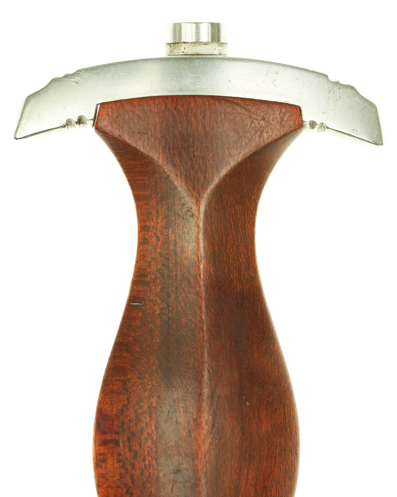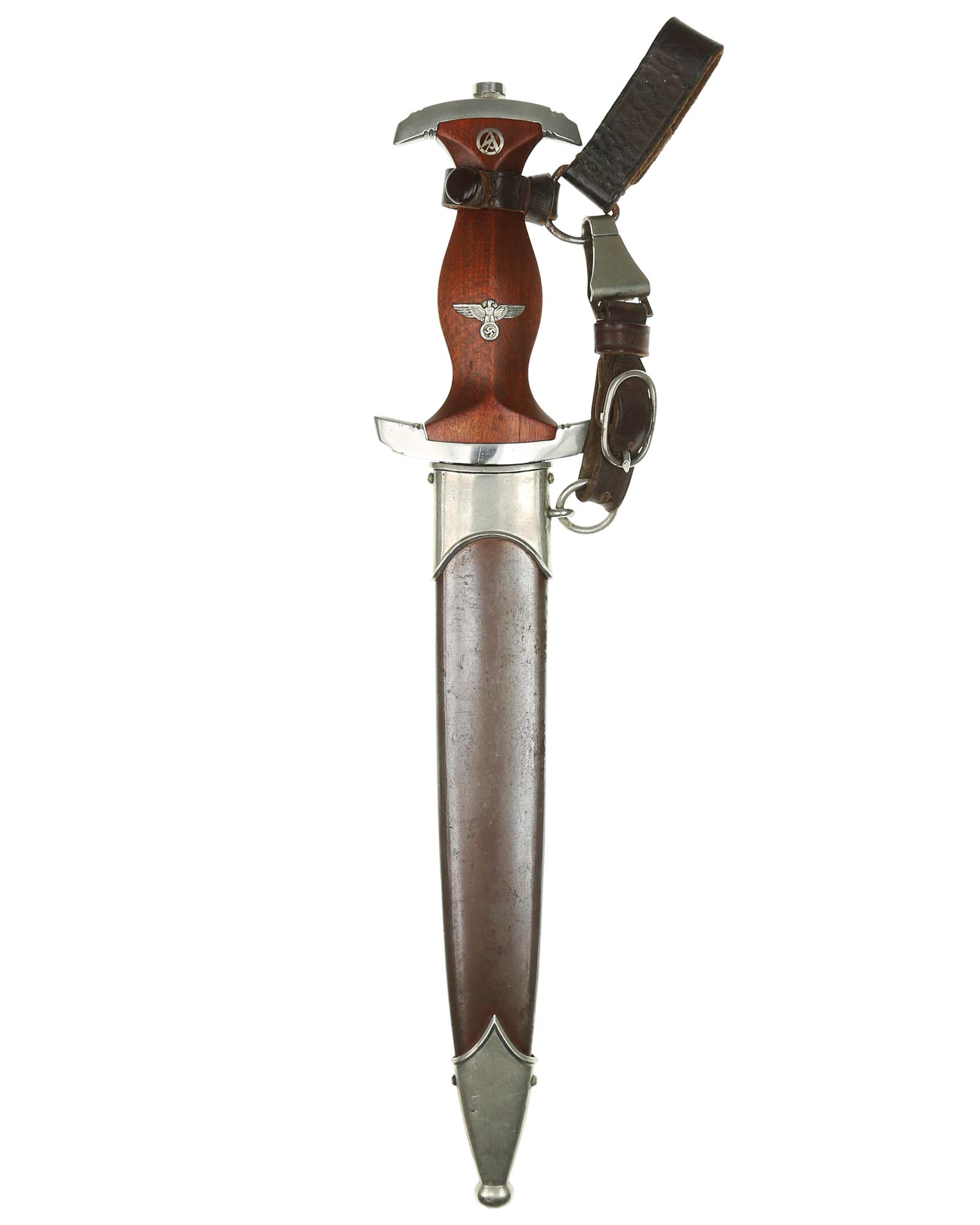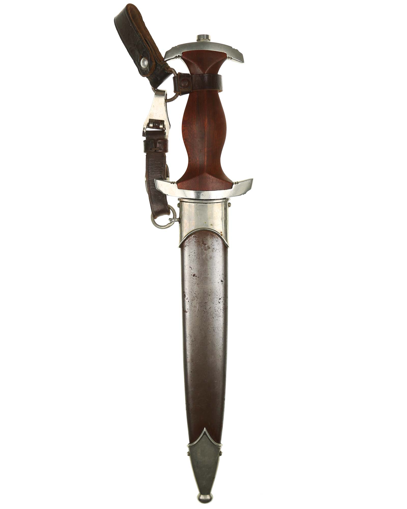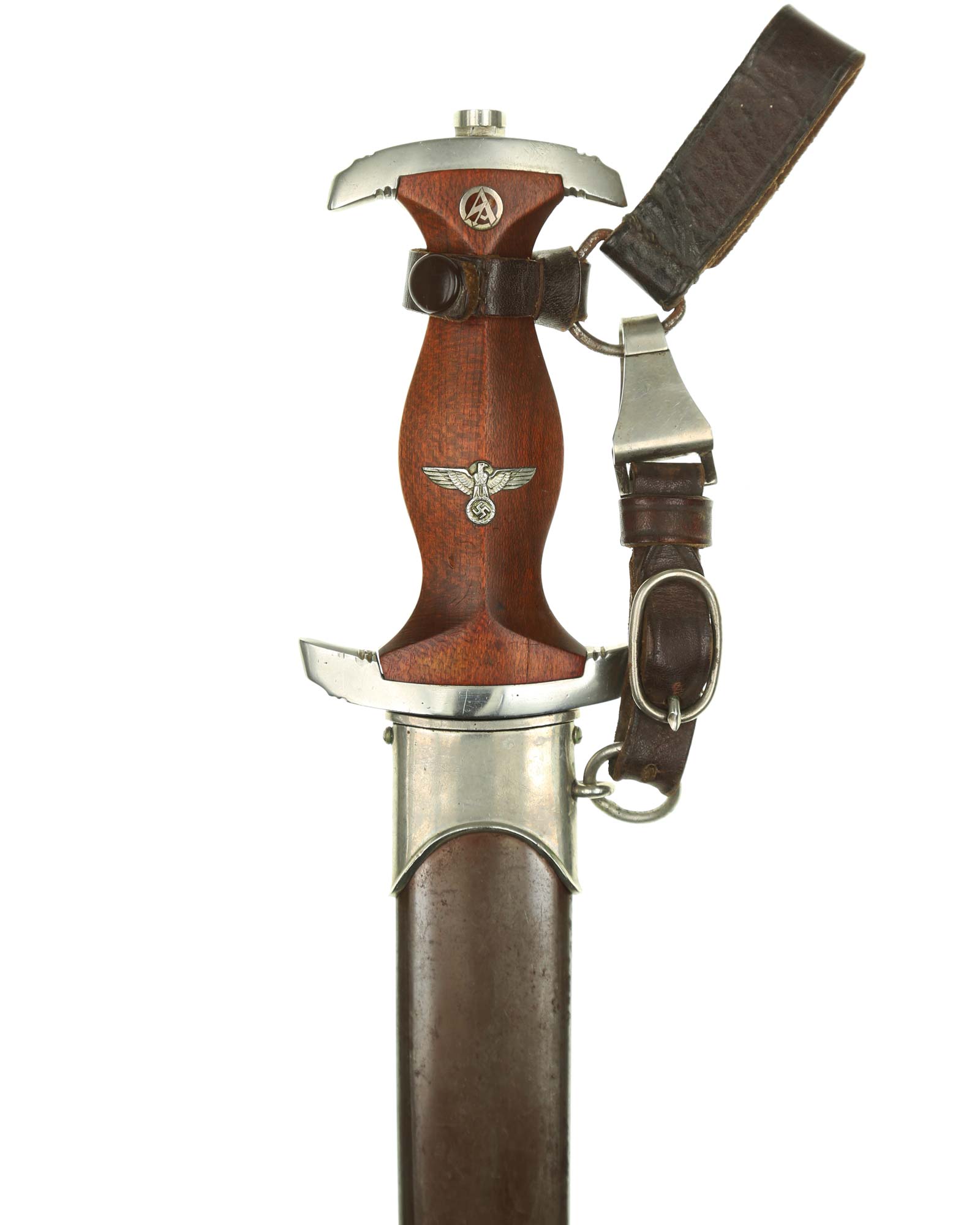 Griff: Heller Holzgriff, der Hoheitsadler im Griff ist in Nickelausführung und mit langem Hals, darüber befindet sich das emaillierte SA-Emblem, diese sind innen geklammert. Beide Parierstangen sind aus Nickel. Die untere Parierstange ist auf der Rückseite mit dem Gruppenstempel BO [Bayrische Ostmark] handgestanzt.