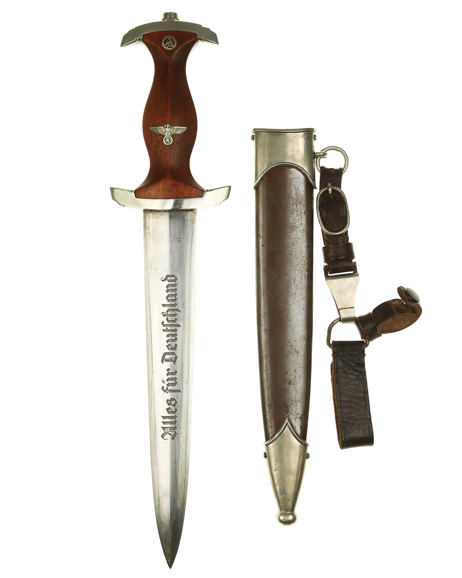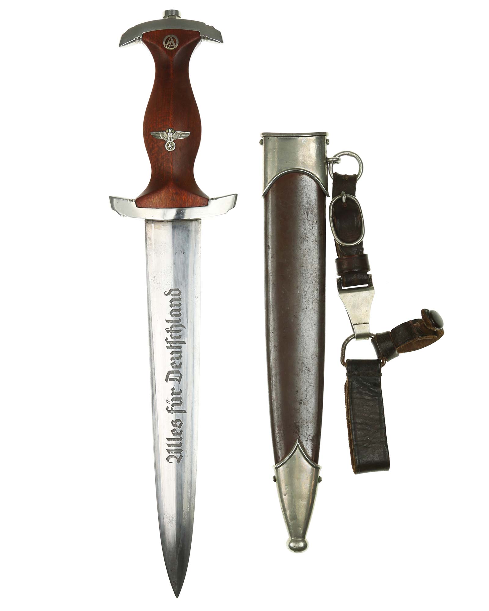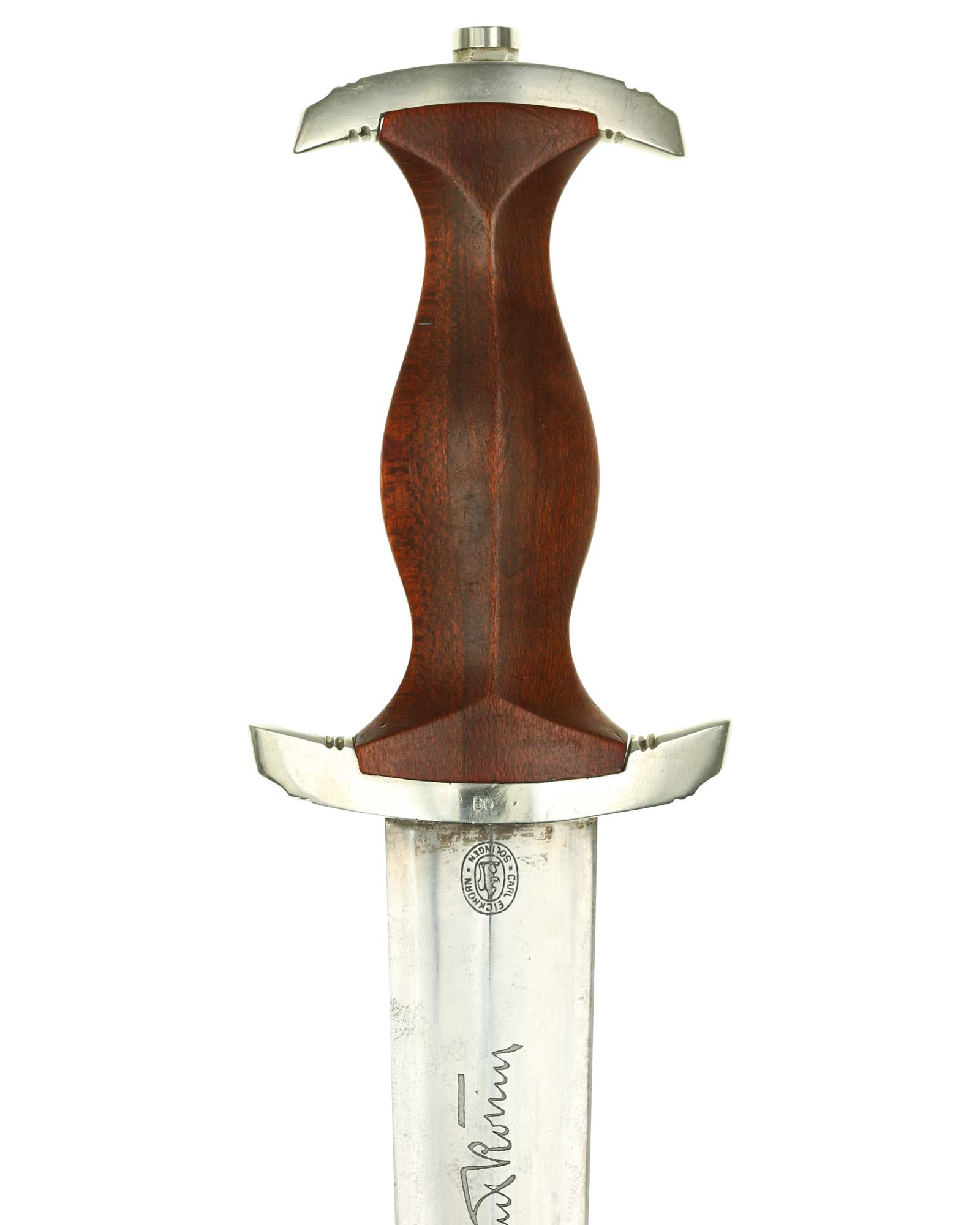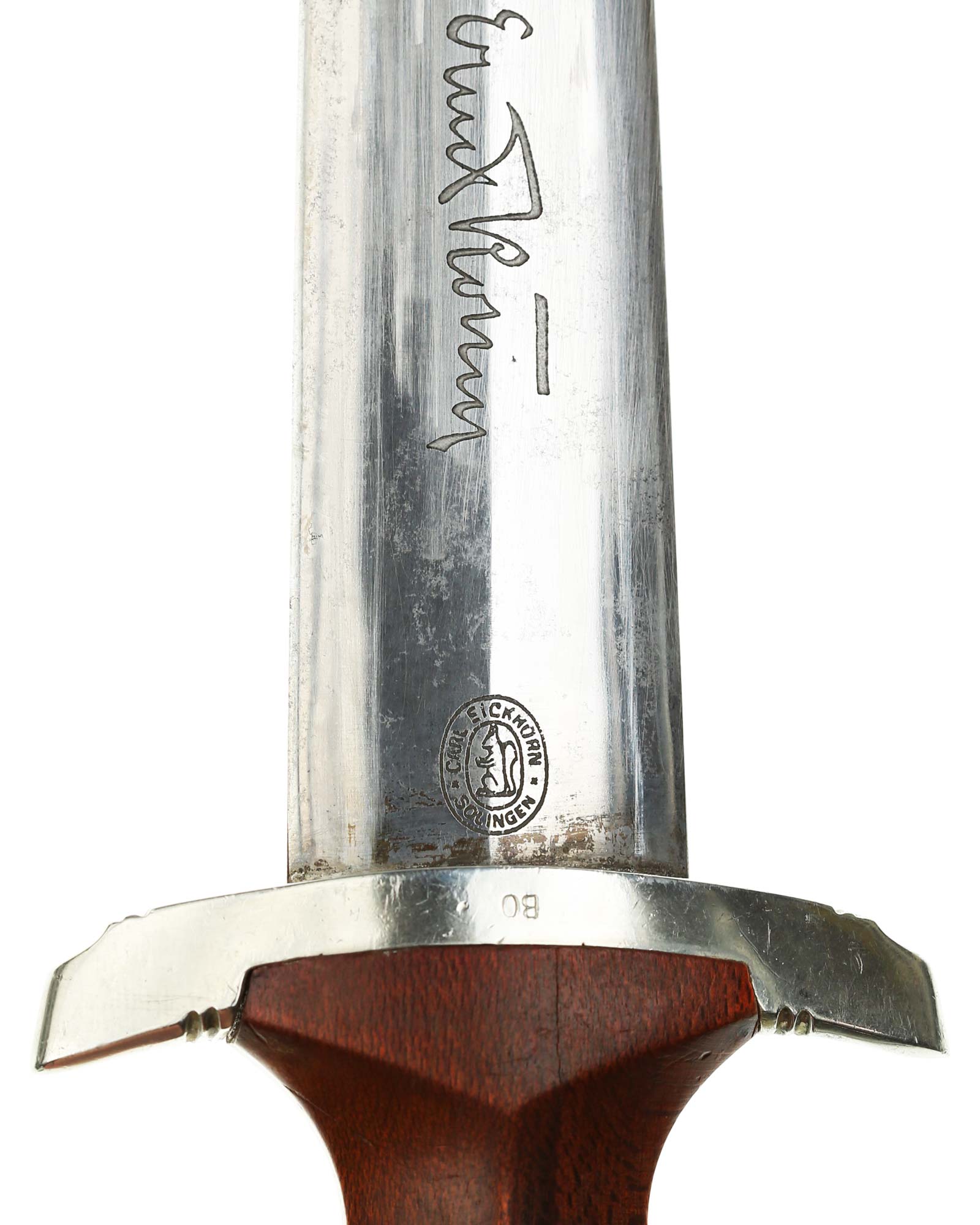 Klinge: Die Klinge ist ohne Rost und spiegelblank. Auf der Vorderseite der Klinge befindet sich die SA Devise, diese ist tief und zackig, mit der Inschrift: Alles für Deutschland, die Rückseite ist mit kompletter Röhm-Inschrift: „In herzlicher Kameradschaft Ernst Rohm“. Unten befindet sich das Herstellerlogo: Carl Eickhorn Solingen.