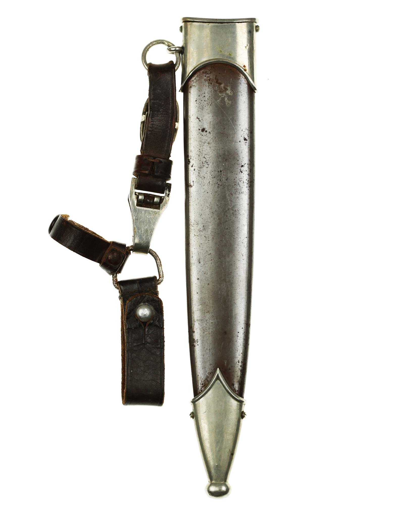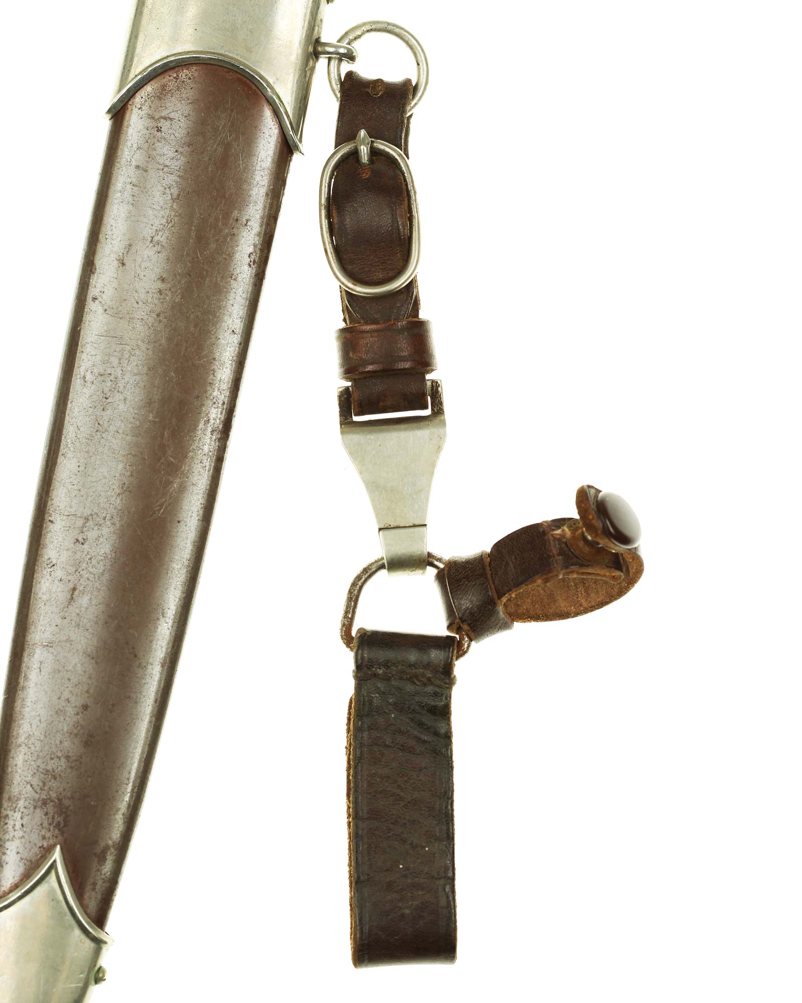 Scheide: Die Scheide ist aus Eisen und mit glänzender Originalbrünierung. Die beiden Scheidenbeschläge sind aus vernickeltem Stahlblech. Die Beschläge werden mit jeweils zwei Schräubchen seitlich gehalten. Am oberen Beschlag befindet sich der Ring für das Tragegehänge.