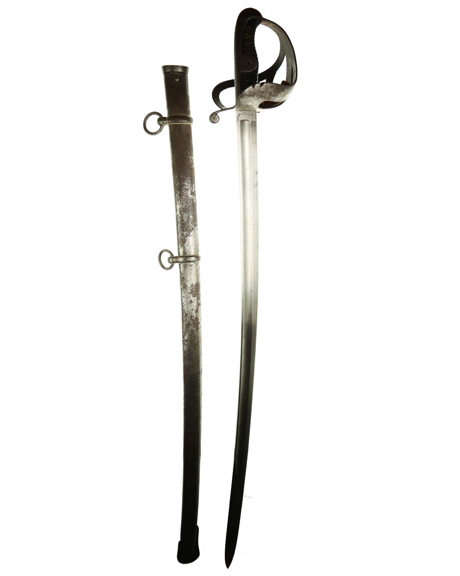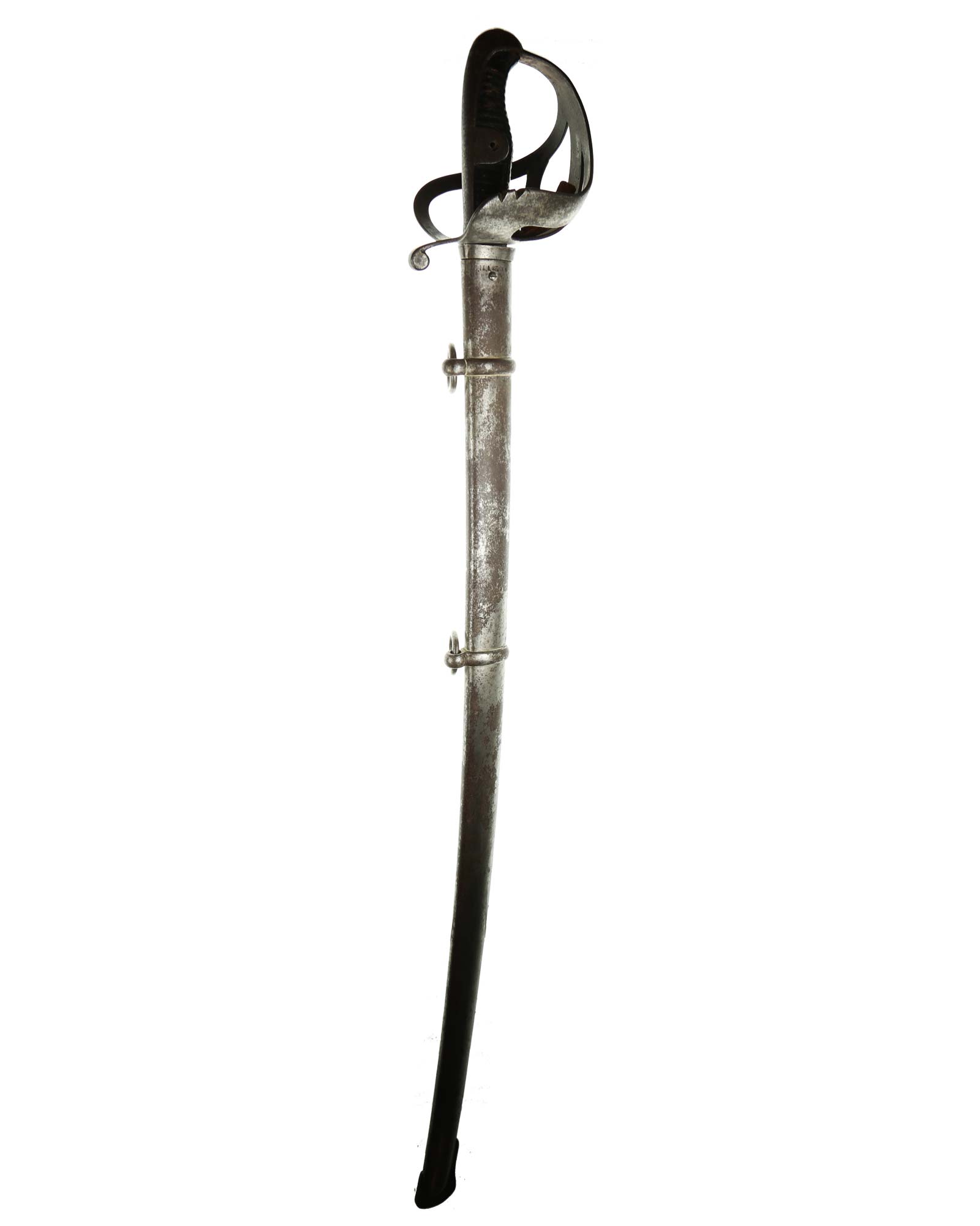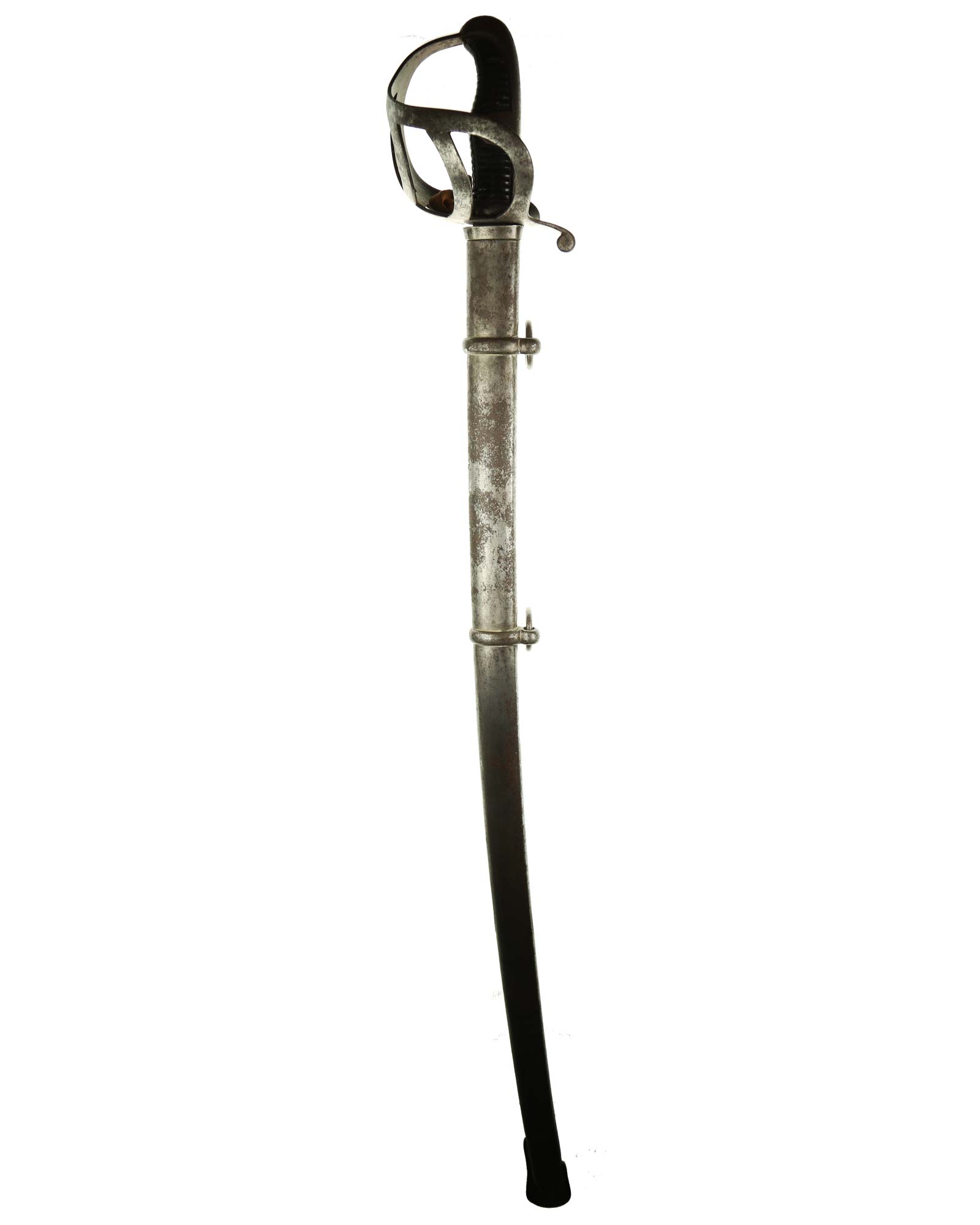 Königreich Sachsen Kavalleriesäbel Modell 1881. Vernickeltes Gefäß mit Holzgriff. Die Klinge ist blank mit P.D. Lüneschloss Solingen Herstellerlogo. Stahlscheide mit zwei Ringen für das Gehänge.