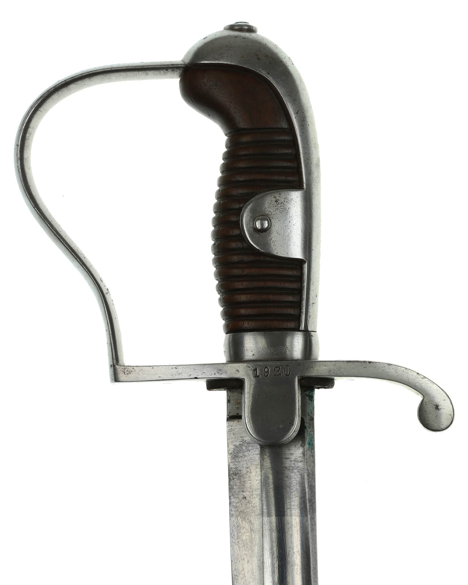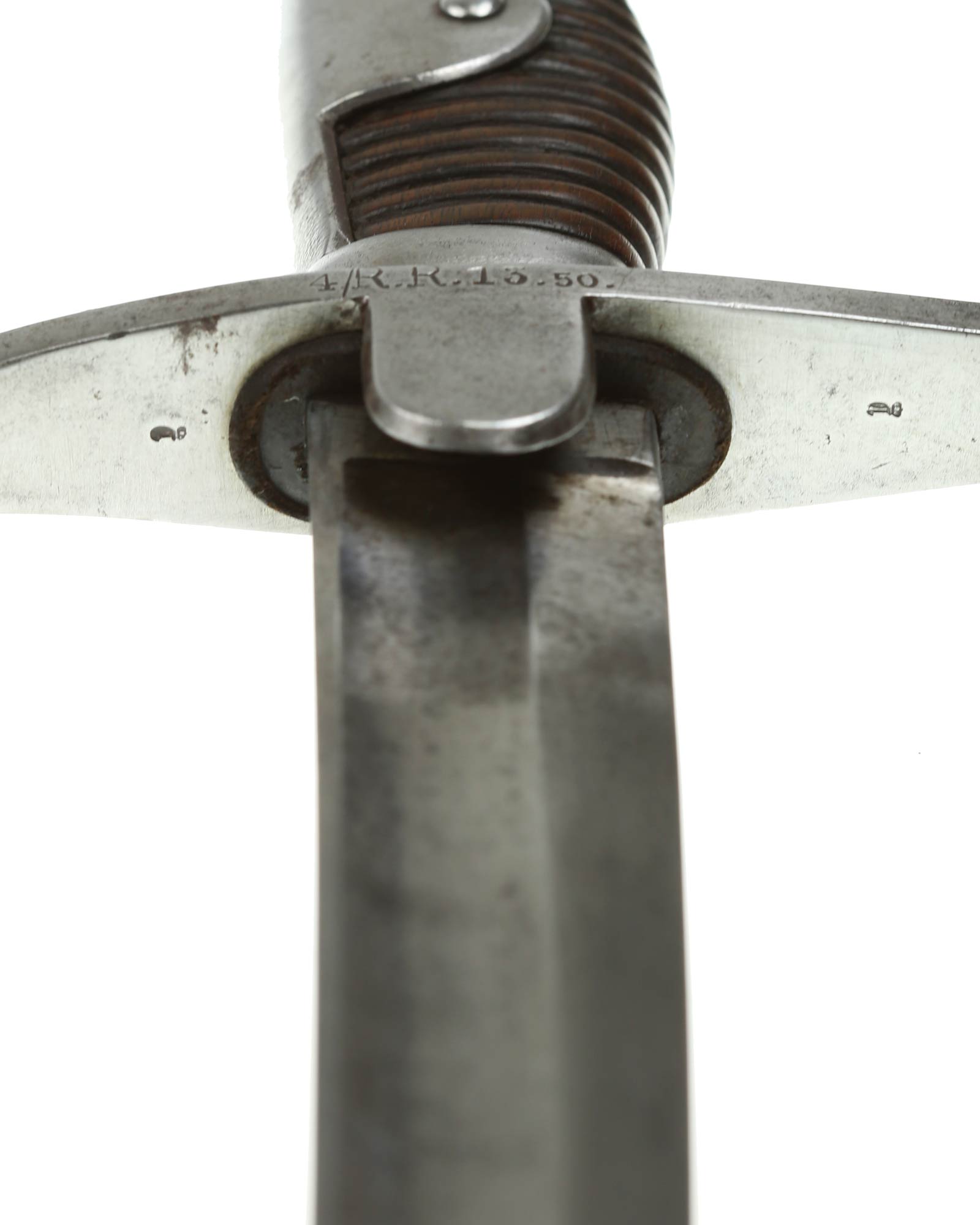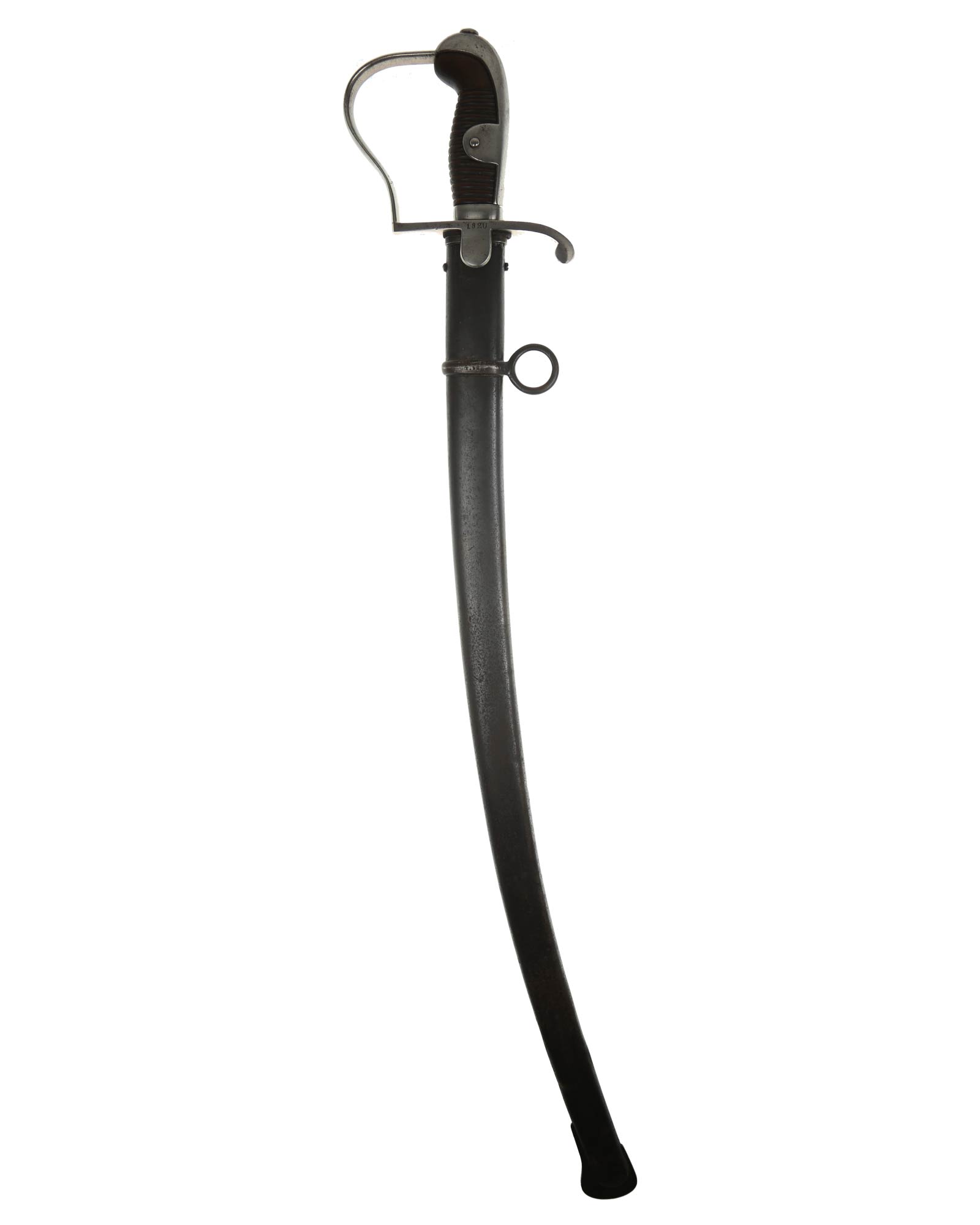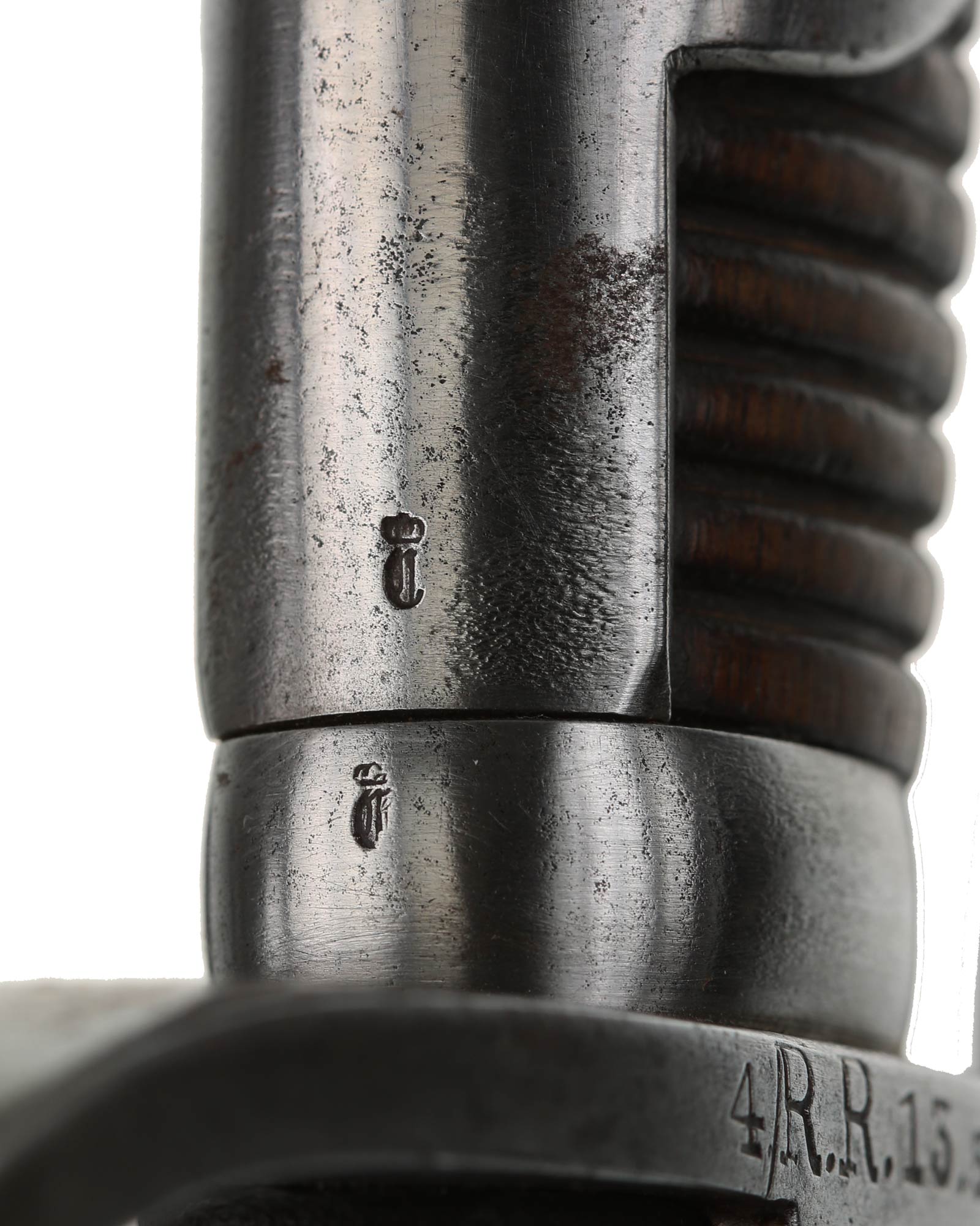Preußen Artillerie Säbel mit glattem Gefäß, brauner Holzgriff. Das Säbel ist abnahmegestempelt W16 (Wilhelm II, 1916). Revisionstempel vorhanden. Die Klinge ist einschneidig mit dem Hersteller Alex Coppel Solingen. Parierstange beidseitig nummeriert (1920 | 4/R.R.13.50.), die Scheide ist nummerngleich.
