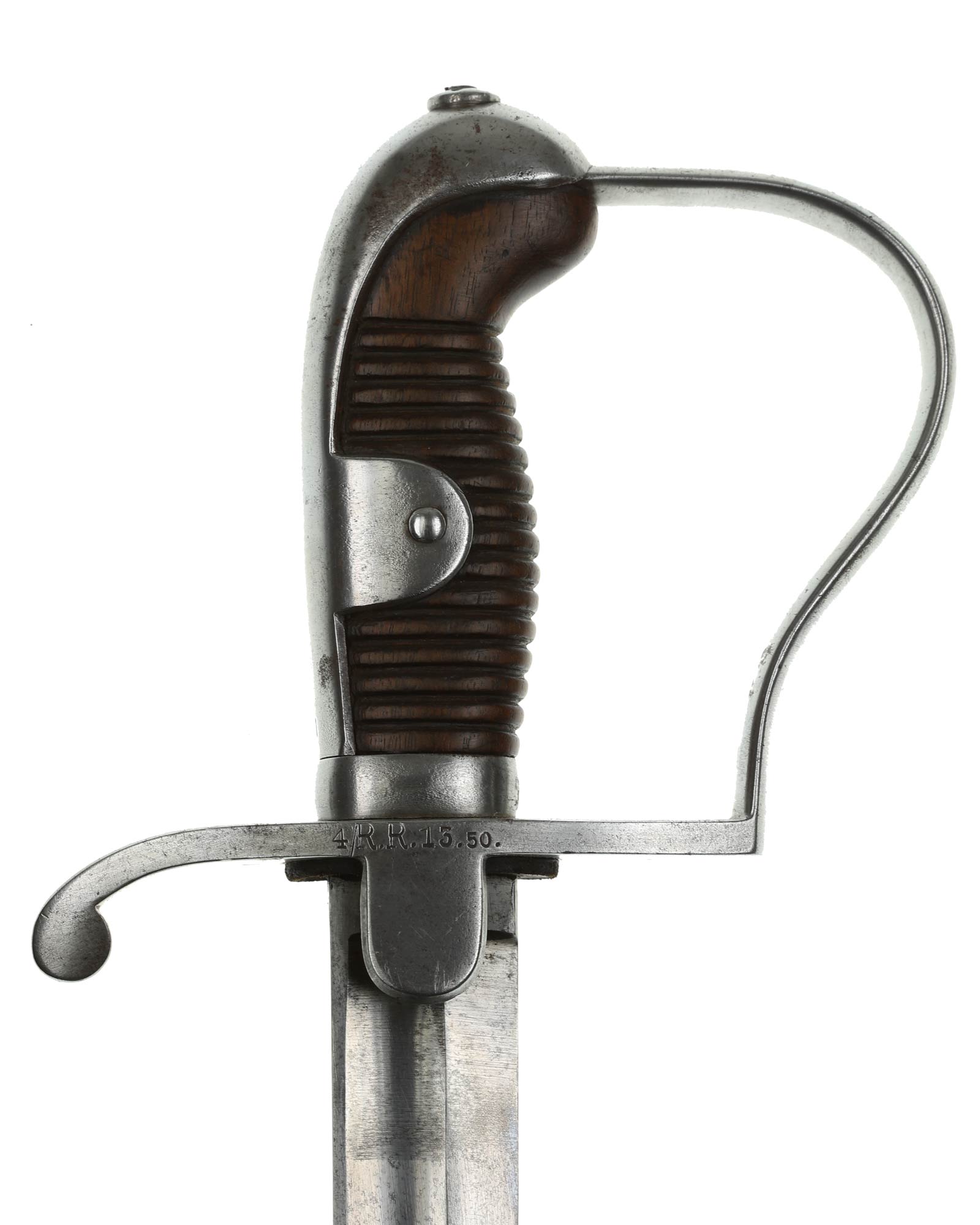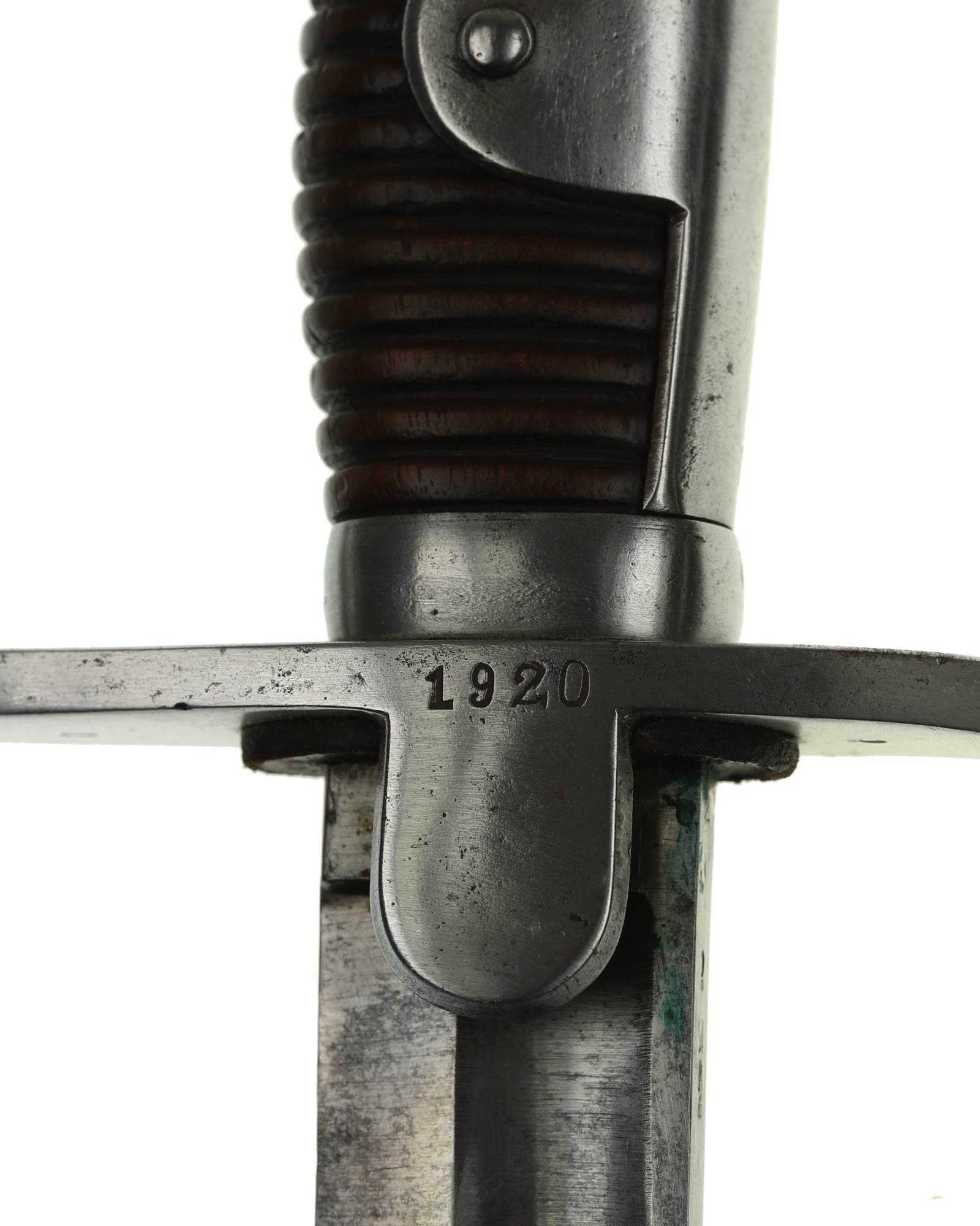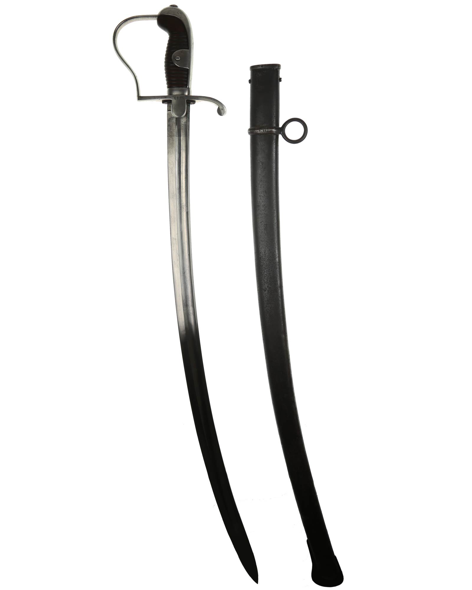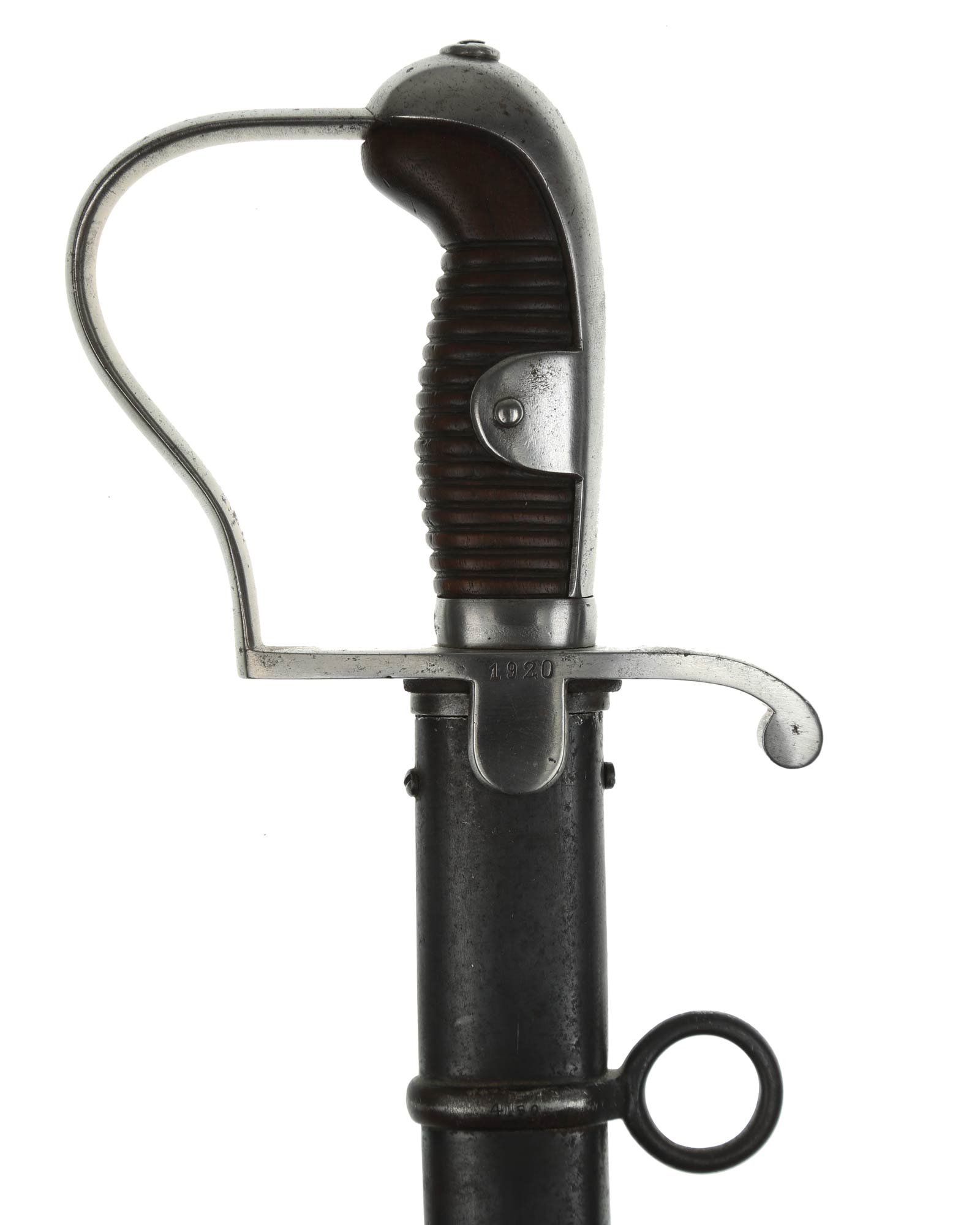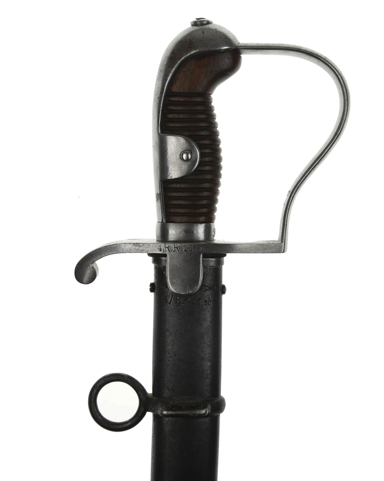 Preußen Artillerie Säbel mit glattem Gefäß, brauner Holzgriff. Das Säbel ist abnahmegestempelt W16 (Wilhelm II, 1916). Revisionstempel vorhanden. Die Klinge ist einschneidig mit dem Hersteller Alex Coppel Solingen. Parierstange beidseitig nummeriert (1920 | 4/R.R.13.50.), die Scheide ist nummerngleich.