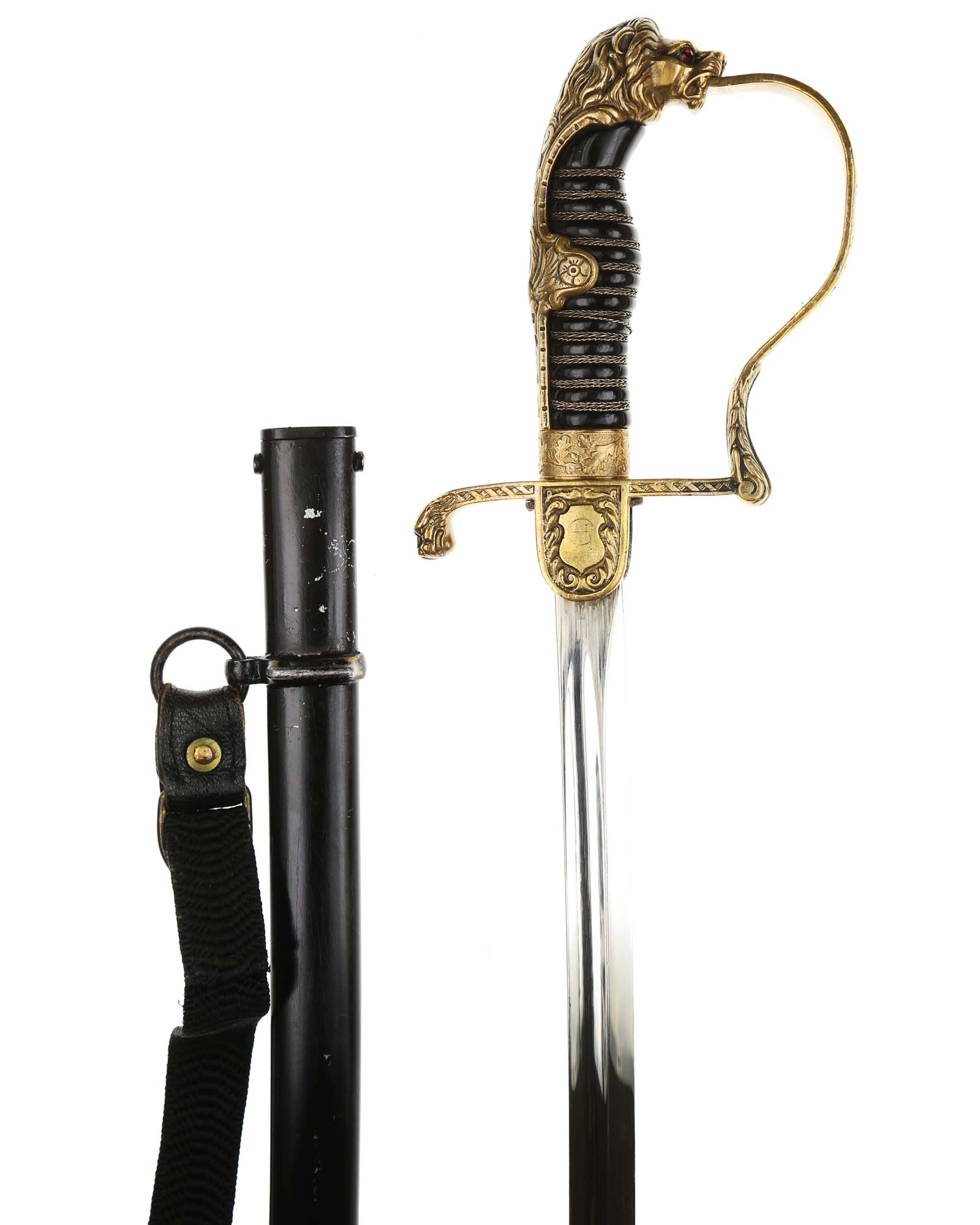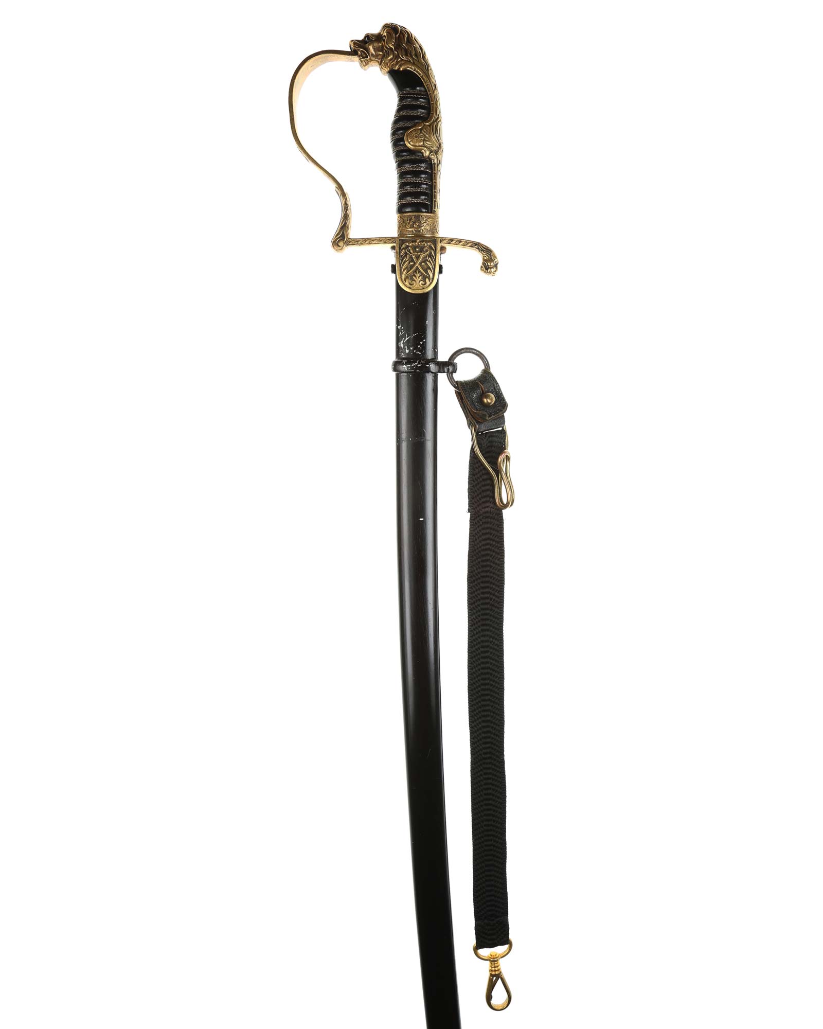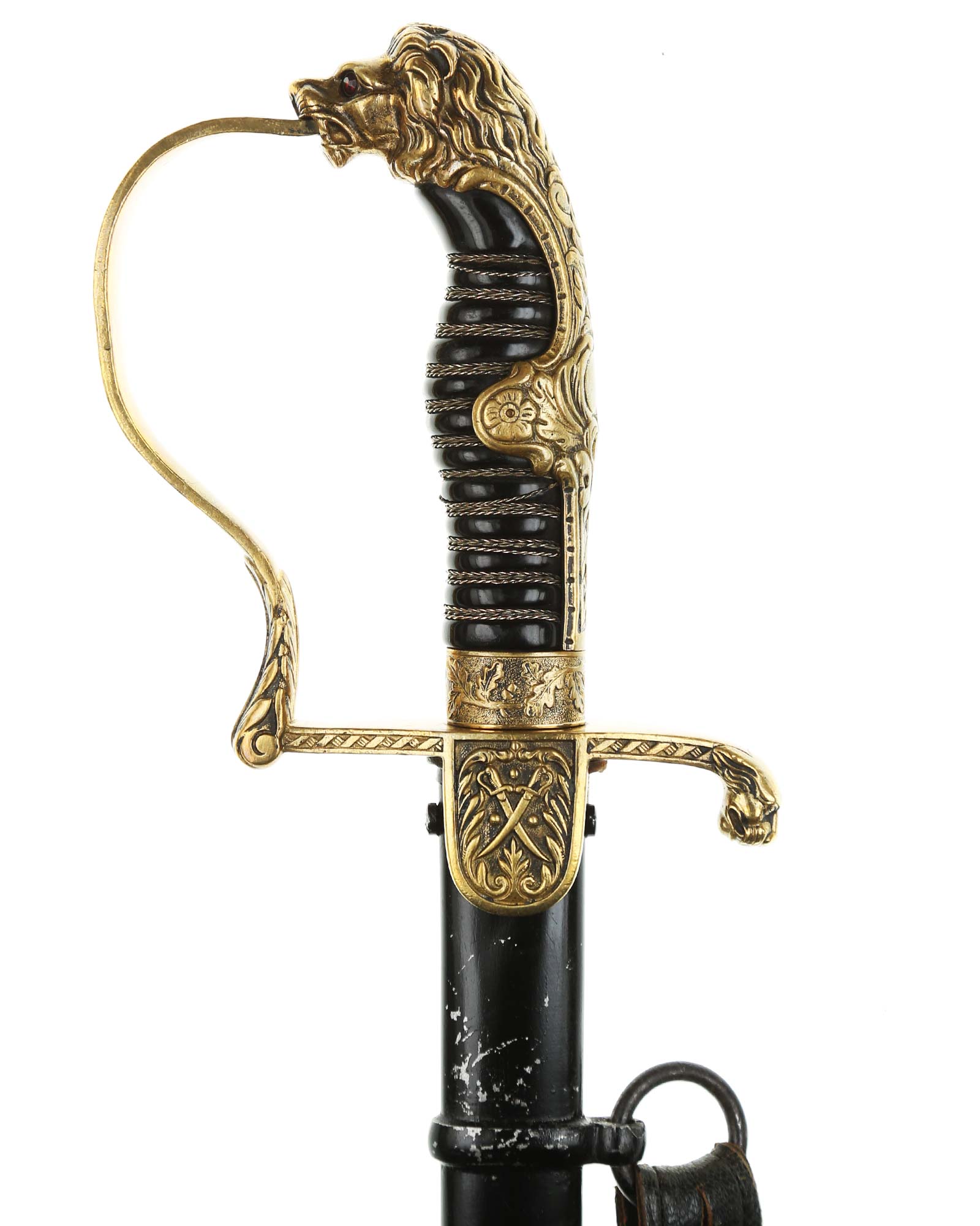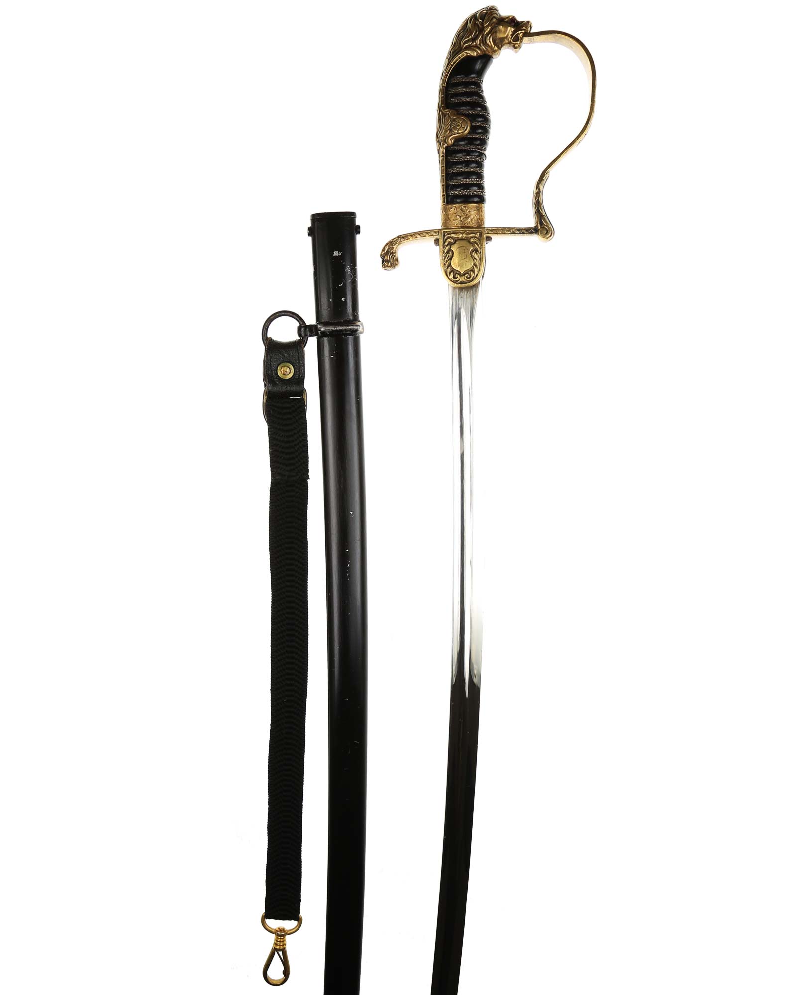 Reichswehr Säbel für Offiziere mit Gehänge (Löwenkopf-Säbel) von Carl Eickhorn Solingen. Löwenkopfgefäß mit verzierten Parierbügel, schwarzer Griff mit intakter Drahtwicklung. Beide Parierstangen-Lappen sind dekoriert, auf der Vorderseite mit gekreuzten Schwertern. Leicht gekrümmte Klinge, zwei Hohlkehlen. Rückseite mit Herstellerlogo Original Eickhorn Solingen. Stahlscheide mit einem Tragering und Gehänge.
